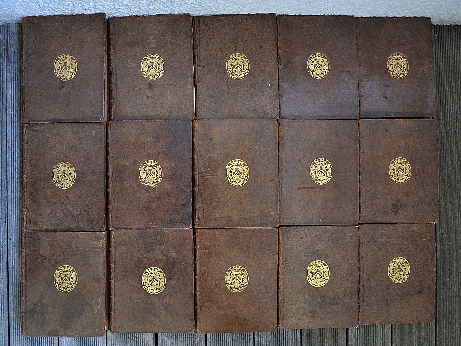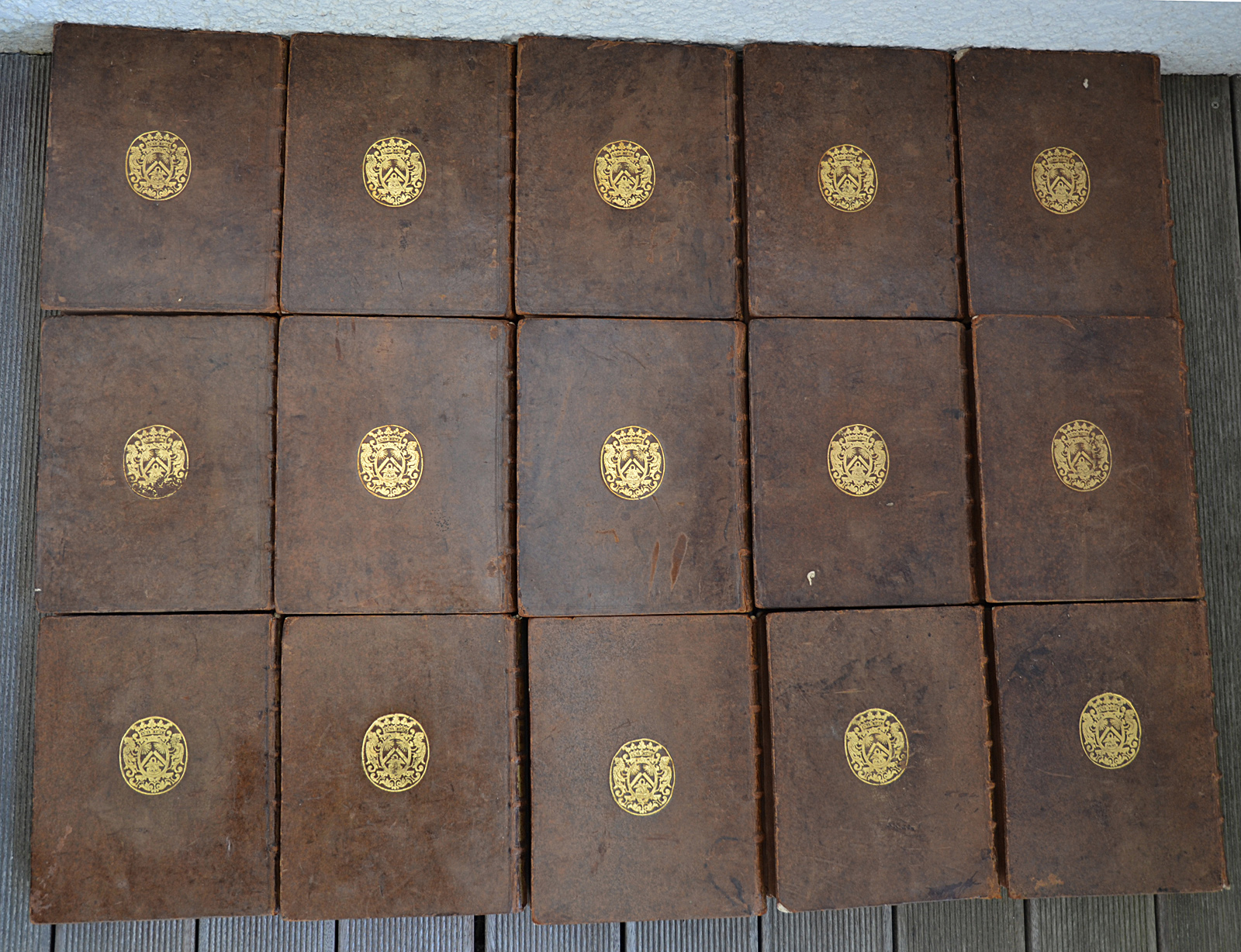 13 volumes in-4 (20,5 x 25 cm.), veau fauve marbré, armoiries dorées au centre des plats dans un encadrement de trois filets à froid, dos à nerfs richement ornés (fers différents pour les trois derniers volumes), roulette dorée sur les coupes, tranches rouges (reliure de l’époque).