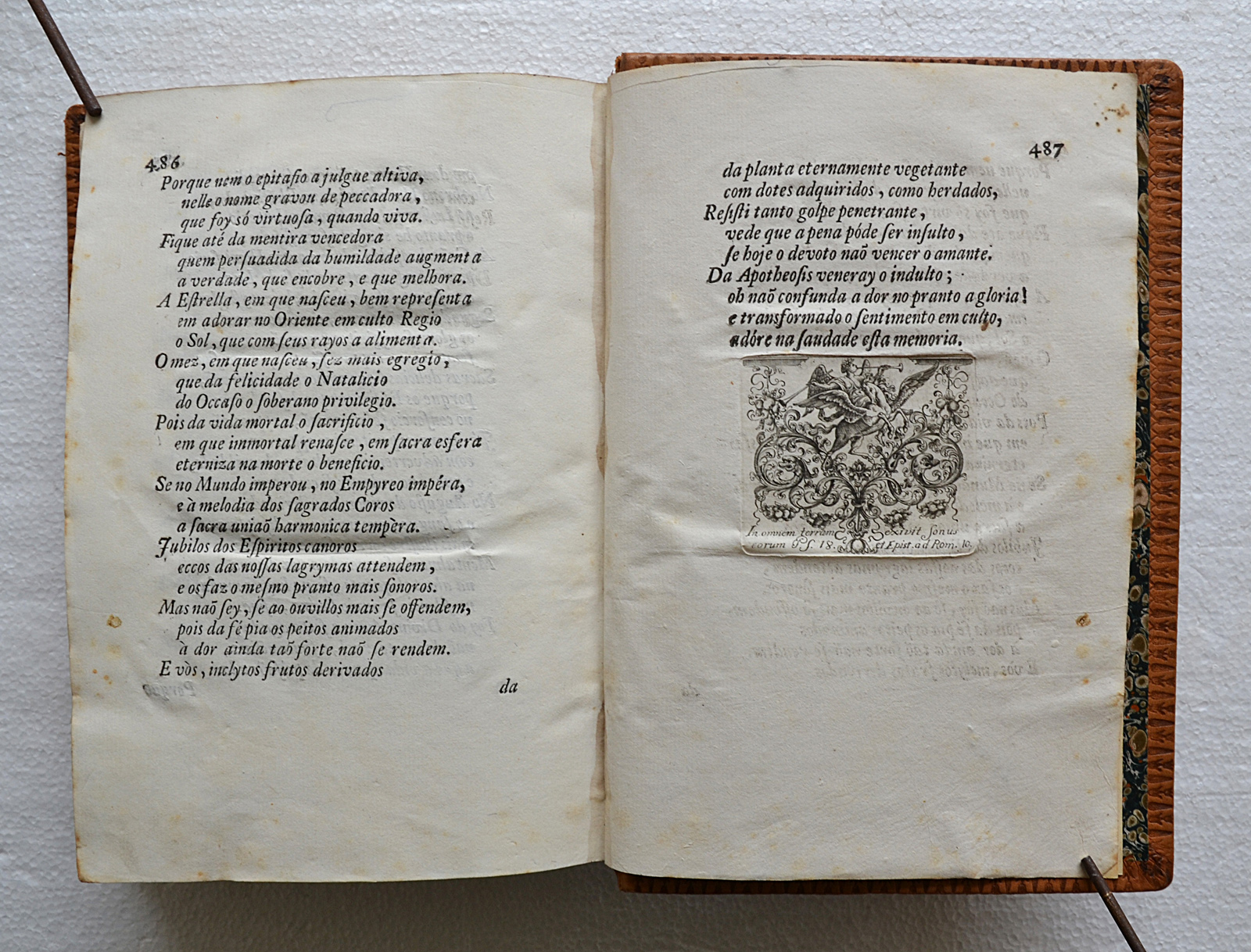 Un volume grand in-8 (17 x 24 cm.) de (18 ff.) – 487 pages ; basane fauve, décor de pièces géométriques en cuir moucheté dans des encadrements de filets dorés et à froid sur les plats, dos à nerfs richement orné, roulette à froid sur les coupes et à l’intérieur (pastiche portugais du XVIII° siècle).
