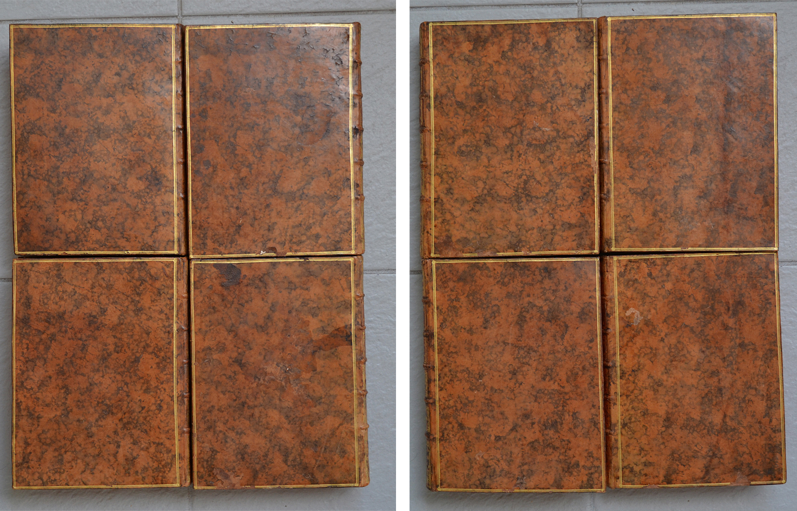 Un volume in-8 (13 x 20,5 cm.) de 271 pp. + 278 pp. – (2ff.) ; veau fauve marbré, filet à froid sur les plats, dos à nerfs orné, filet doré sur les coupes, tranches rouges (reliure de l’époque).