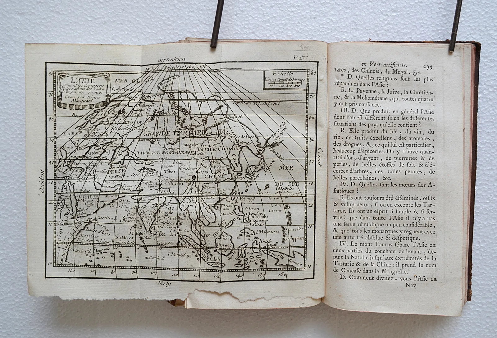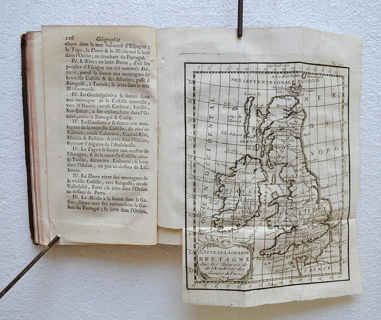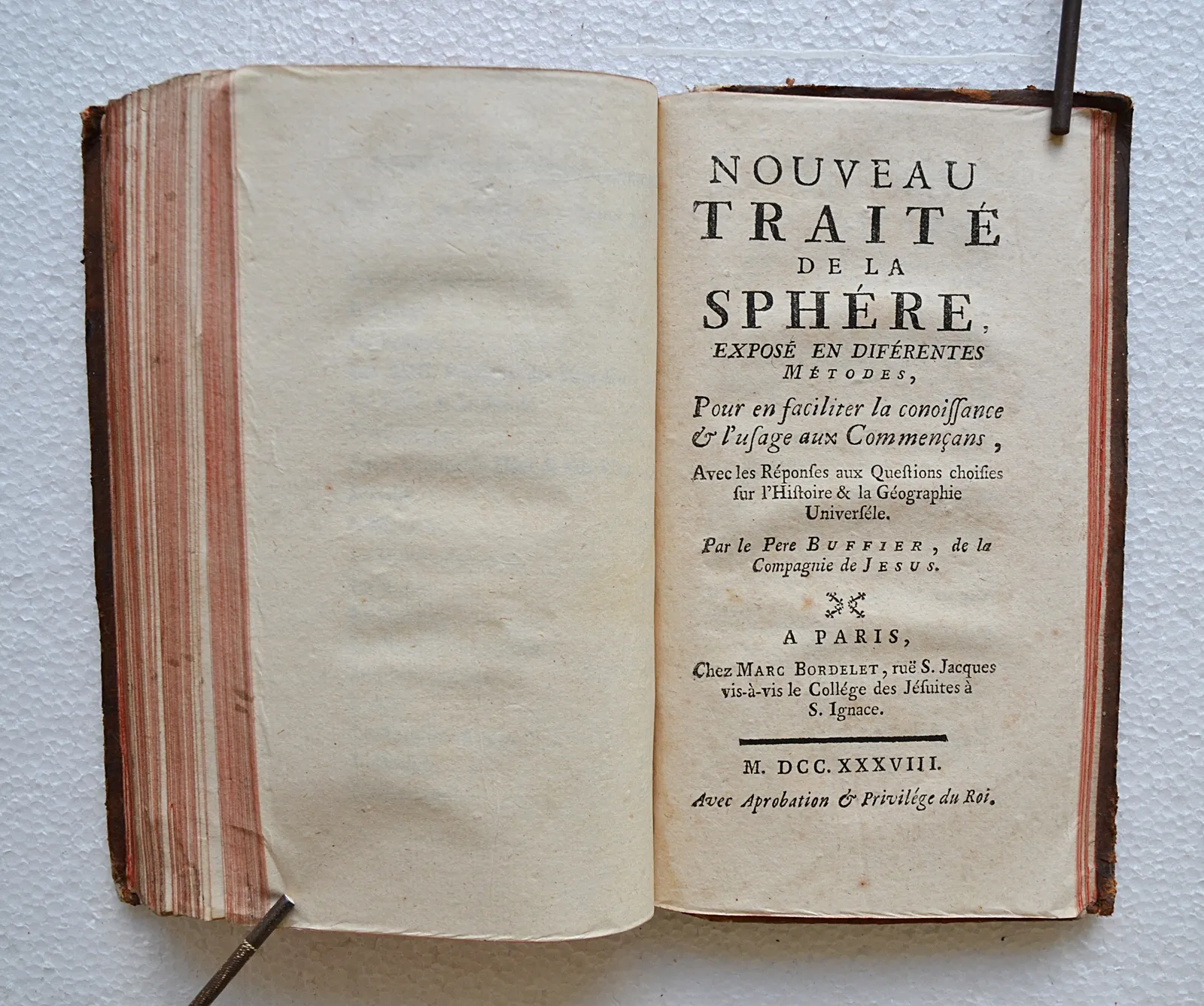 En basane fauve marbrée d'époque, dos à nerfs orné, illustré de 18 cartes repliées, réunissant la géographie universelle et un traité de la sphère.