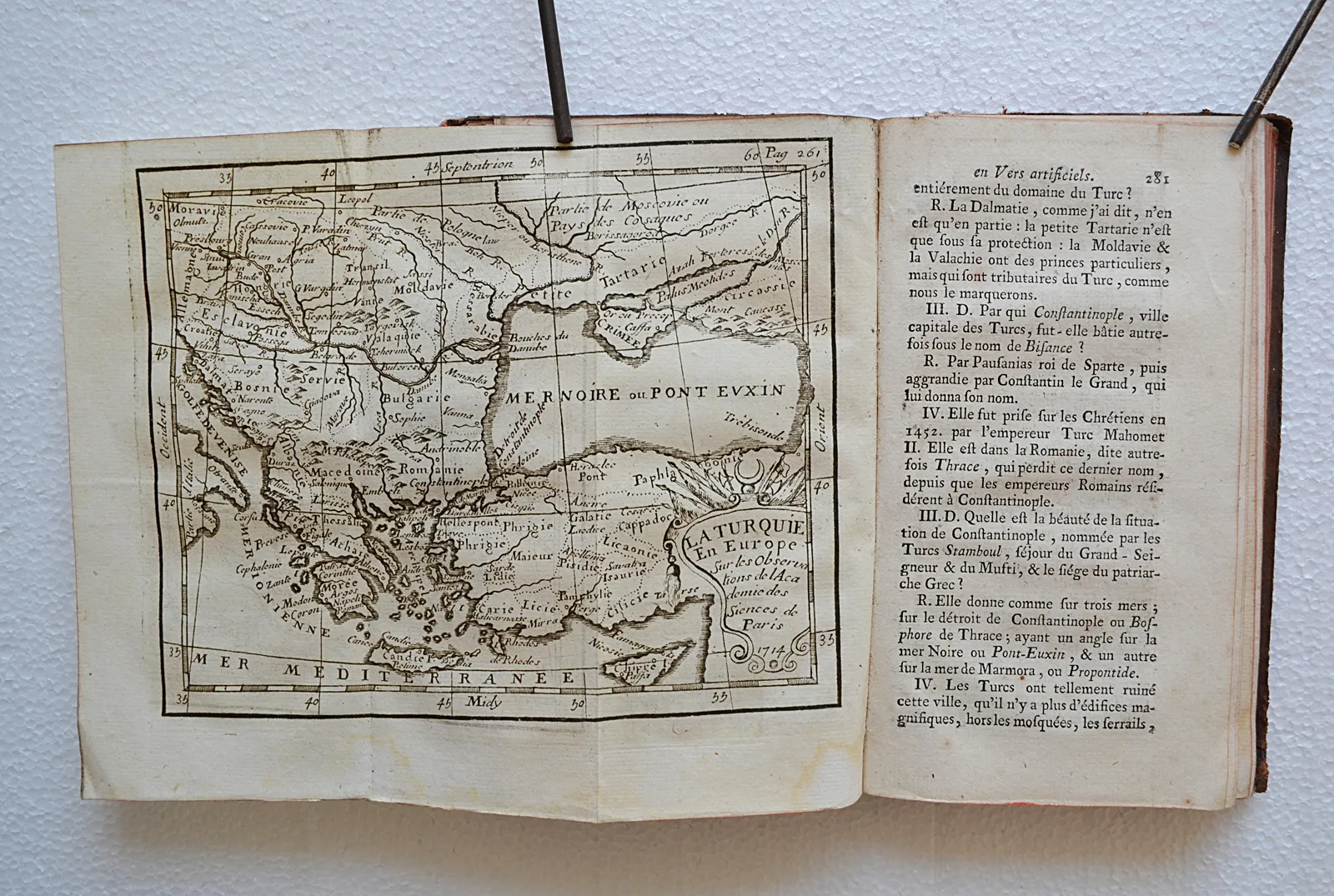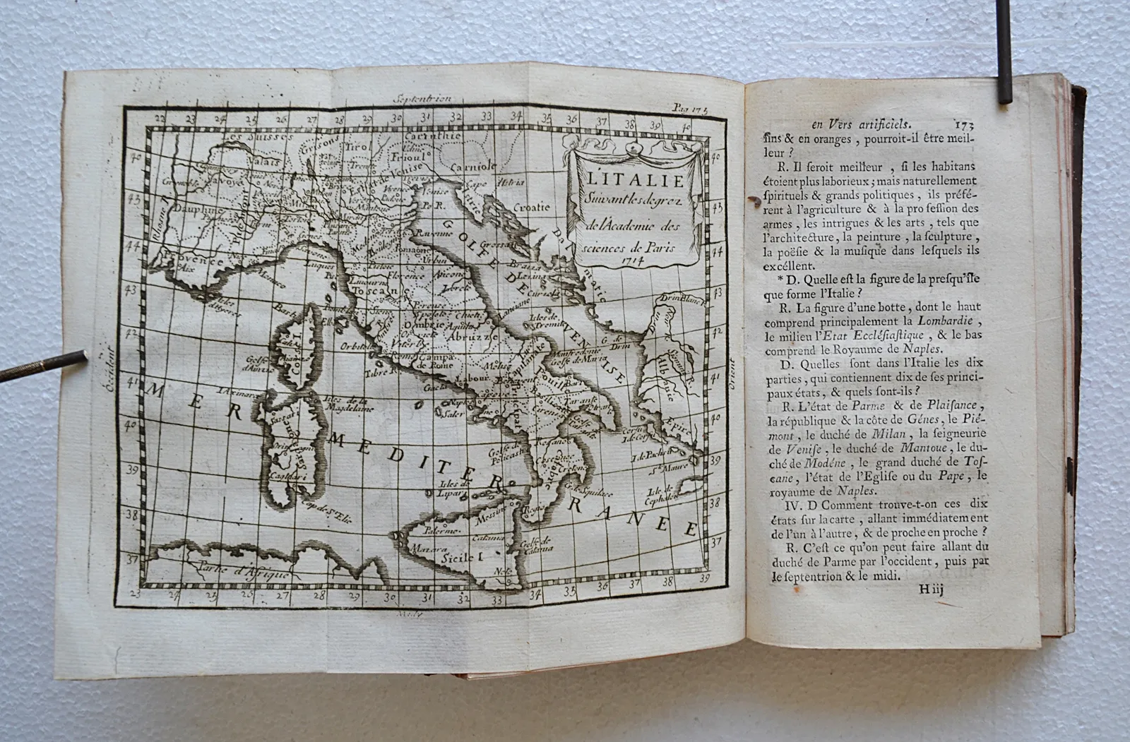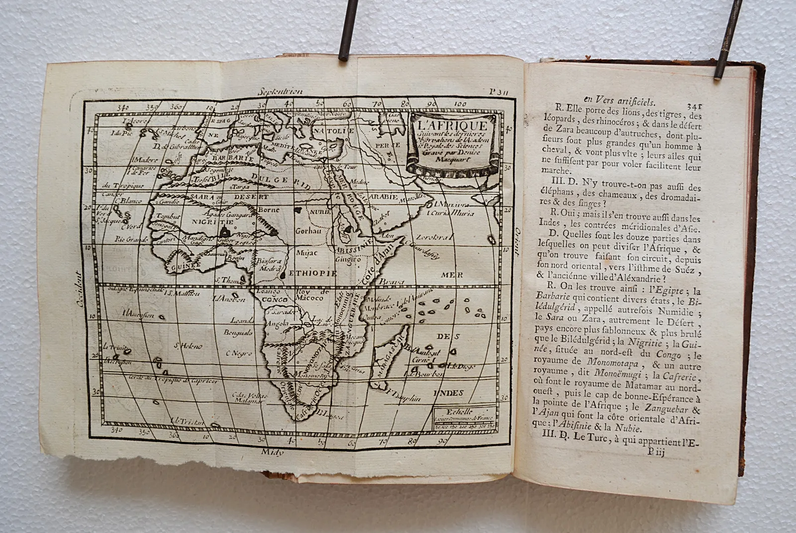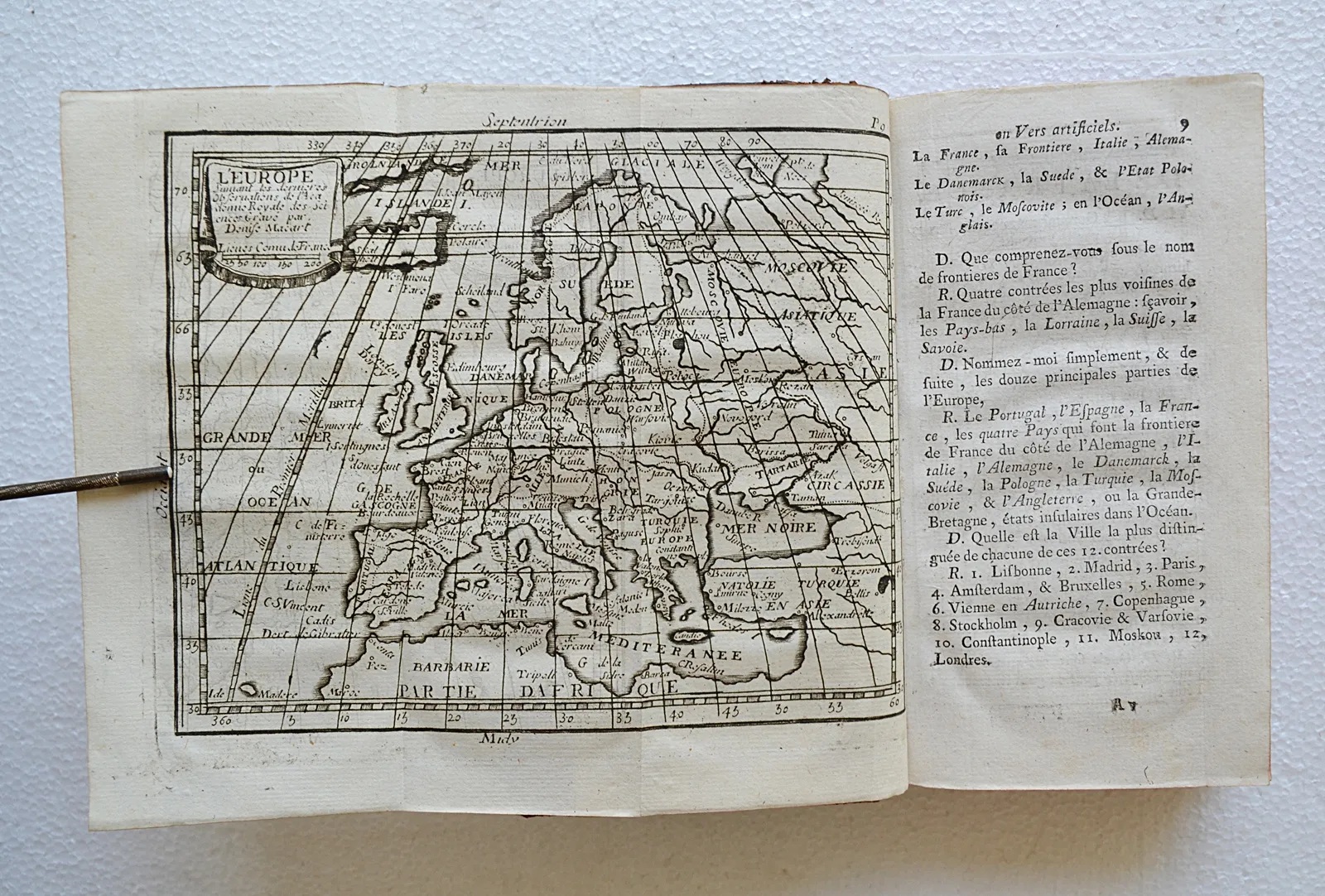 En basane fauve marbrée d'époque, dos à nerfs orné, illustré de 18 cartes repliées, réunissant la géographie universelle et un traité de la sphère.