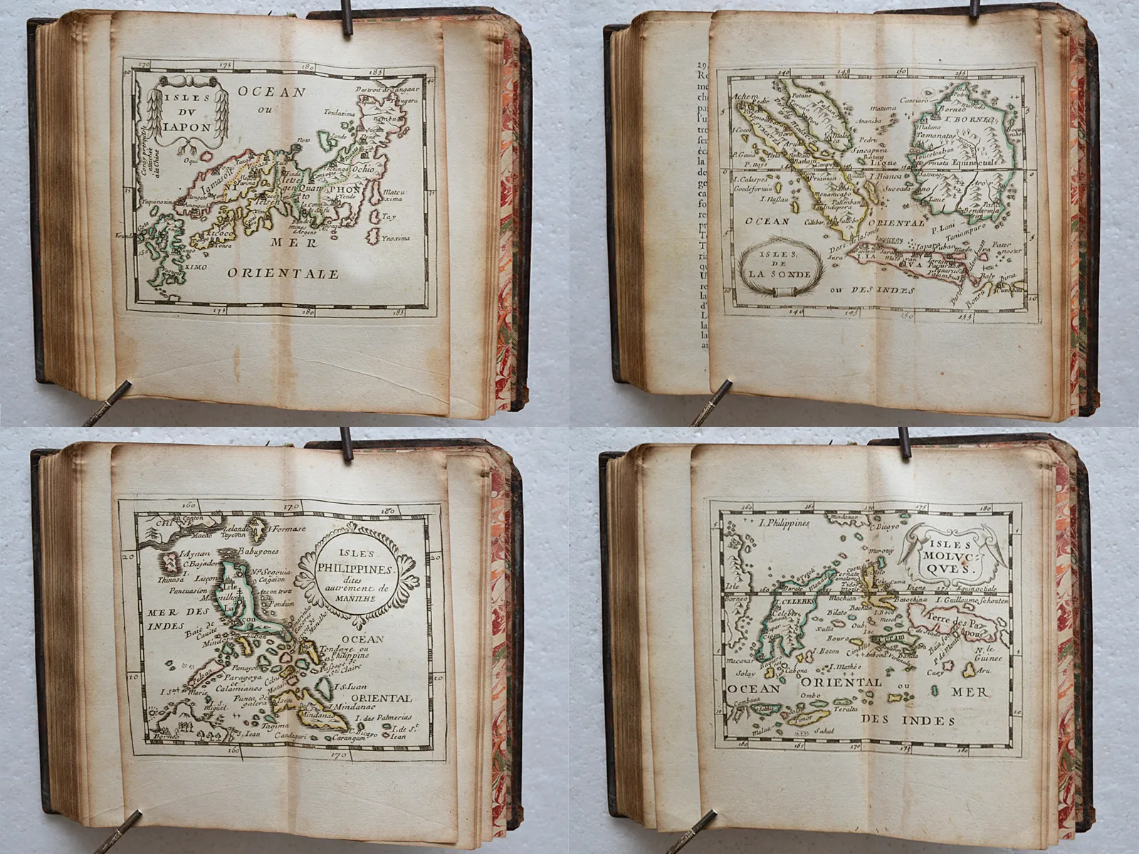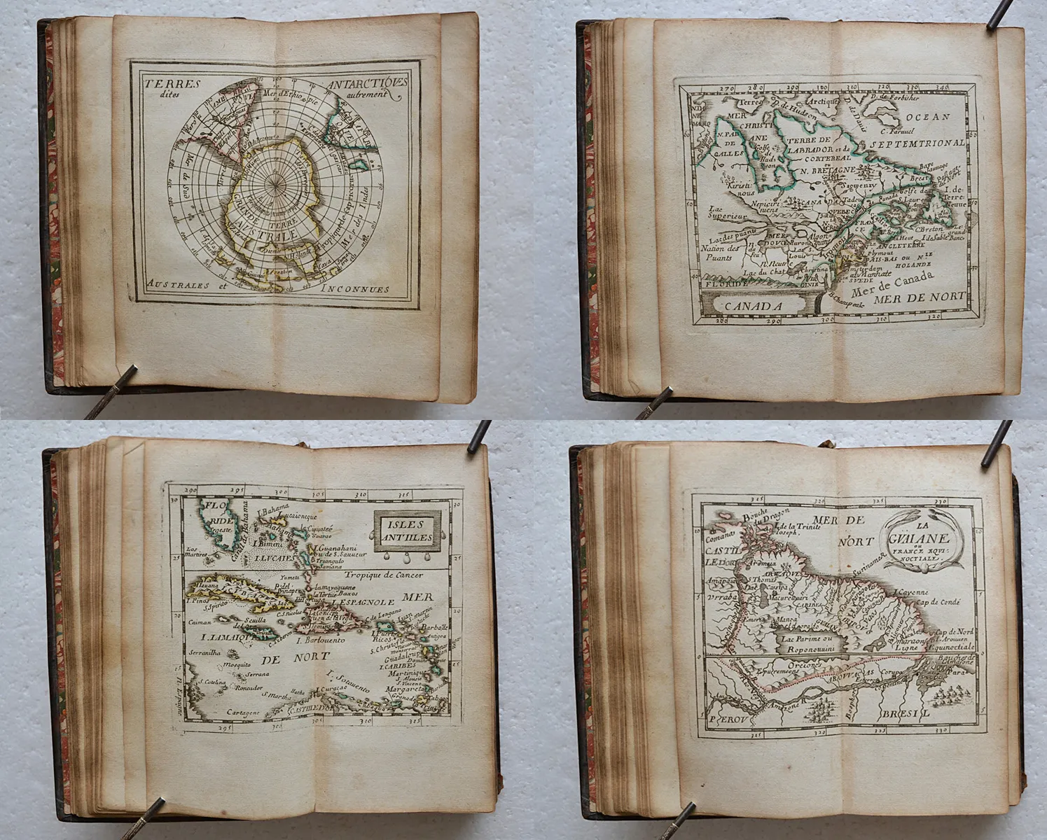 Table des cartes : Planisphère – Terres arctiques – Islande – Terres antarctiques – Amérique – Canada – La Virginie – La Floride – Nouveau Mexique – Mexique ou Nouvelle Espagne – Antilles – Castille d’Or – La Guyane – Pérou – Chili – Magellanique – Tucuman – La Plata – Brésil – Afrique – Barbarie – Égypte – Numidie – Nigritie – Nubie – Guinée – Éthiopie – Congo – Cafrerie de Monomotapa – Zanguebar – Açores – Canaries – Cap Vert – Madagascar – Malte – Asie – Turquie – Géorgie – Arabie – Perse – Tartarie – Chine – Empire du Mogol – Inde – Inde – Maldives – Ceylan – Iles de la Sonde – Japon – Philippines – Moluques.