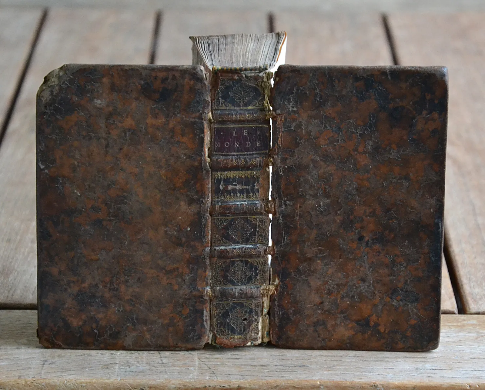 Charnières fendues ; accrocs avec pertes de cuir sur le dos et les coiffes (l’une absente, l’autre presque détachée) ; coins du second plat éclatés, dont un avec perte de carton ; déchirure sur la pliure inférieure de la carte de Madagascar (sans perte de lettres) ; première garde et un feuillet blanc absents ; quelques salissures, sans gravité.