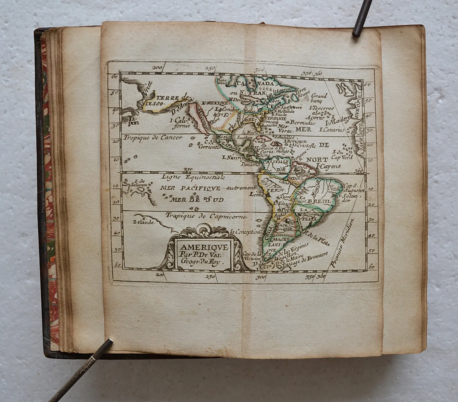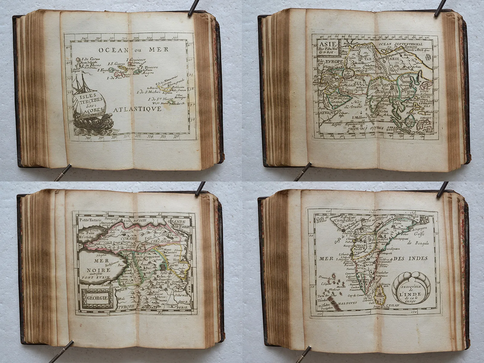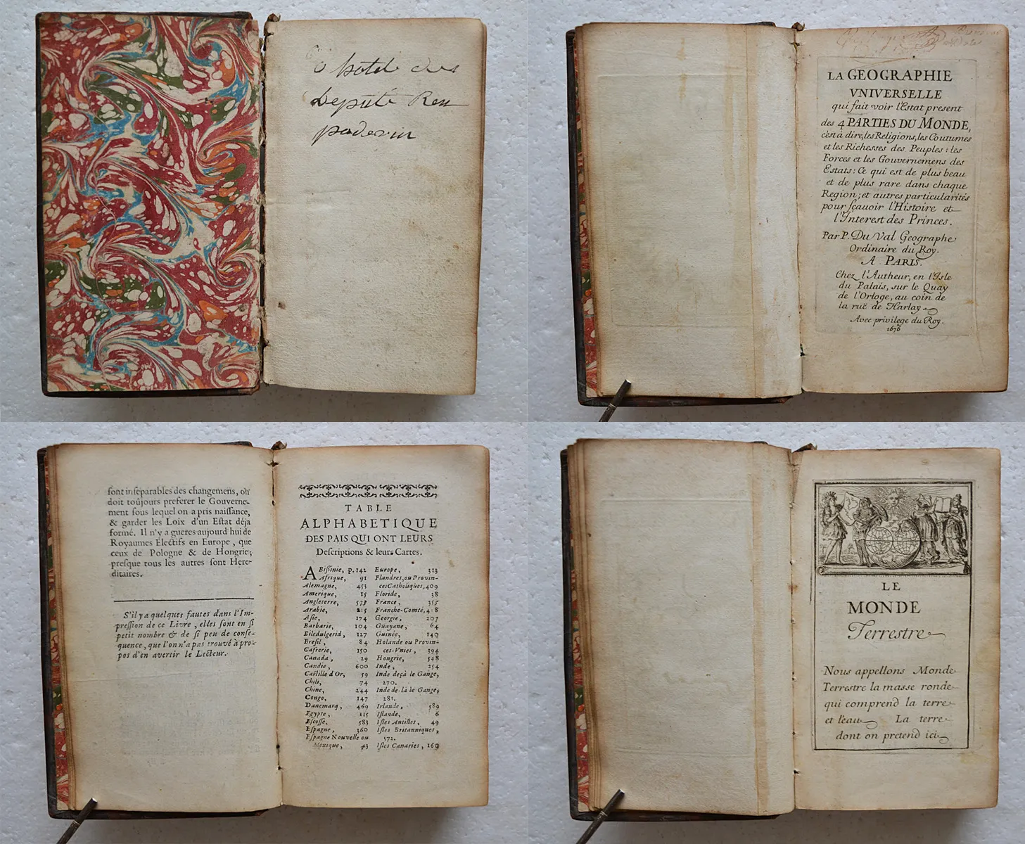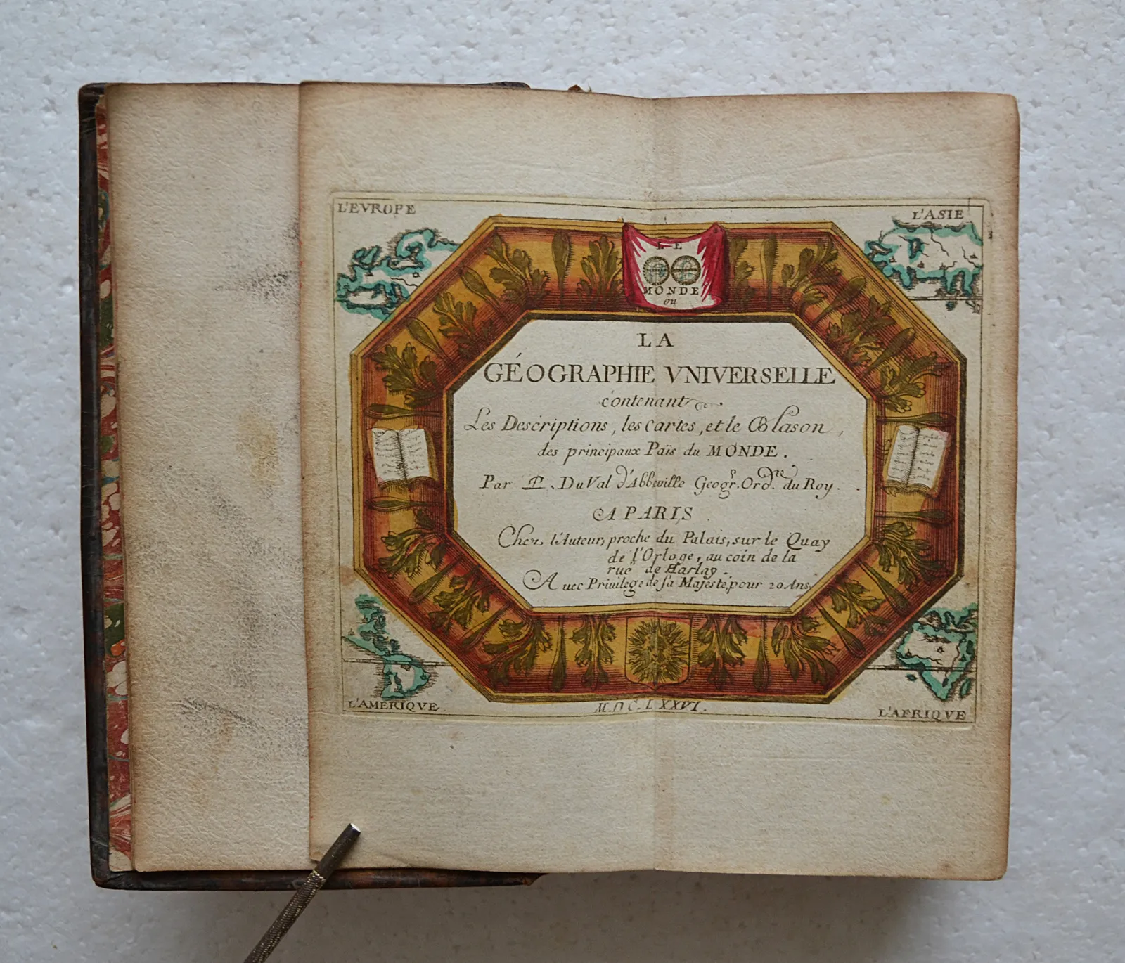 La géographie universelle qui fait voir l’estat présent des 4 parties du monde, c’est à dire, les religions, les coutumes et les richesses des peuples ; les forces et les gouvernemens des Estats ; ce qui est de plus beau et de plus rare dans dans chaque région ; et autres particularités pour savoir l’Histoire et l’Interest des Princes. Par P. Du Val, Géographe Ordinaire du Roy.