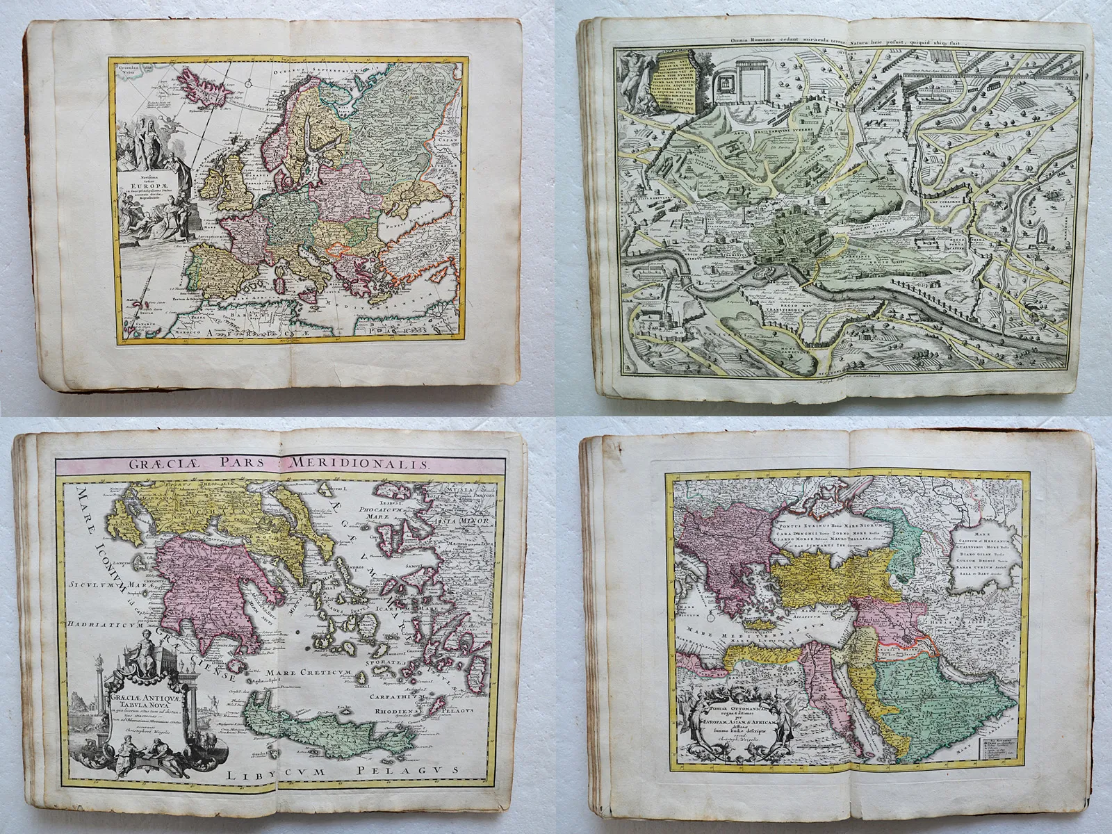 Détail des 49 cartes en couleurs : planisphère – Europe – Asie – Afrique – Amérique – Espagne – France – [Duché de Savoie / Principauté du Piémont & Montferrat] – Lotharingie – Suisse – Germanie – [Duché de Wurtemberg / Suève] – Germanie (2) [circulus Franconicus] – Bavière – Tyrol – Autriche supérieure – Autriche inférieure – [Bohême / Silésie / Moravie / Lusace] – Brandebourg – Saxonie supérieure – Saxonie inférieure – [Rhénanie / Moselle / Alsace] – Westphalie – Germanie inférieure – Belgique (2) – [Europe du nord / Germanie / Provinces-Unies / Helvétie / Belgique] – Italie (3) – [Dalmatie / Albanie] – Grèce (2) – Hongrie – Padi fluvi tractus integer – Les Balkans – Pologne & Lituanie – Moscou – [Laponie / Livonie / Finniae] – Scandinavie – Danemark & Suède – Grande-Bretagne – Empire Ottoman – Terre Sainte – Carte de l’Empire romain & de la Barbarie (2) – Constantinople – Afrique du nord.