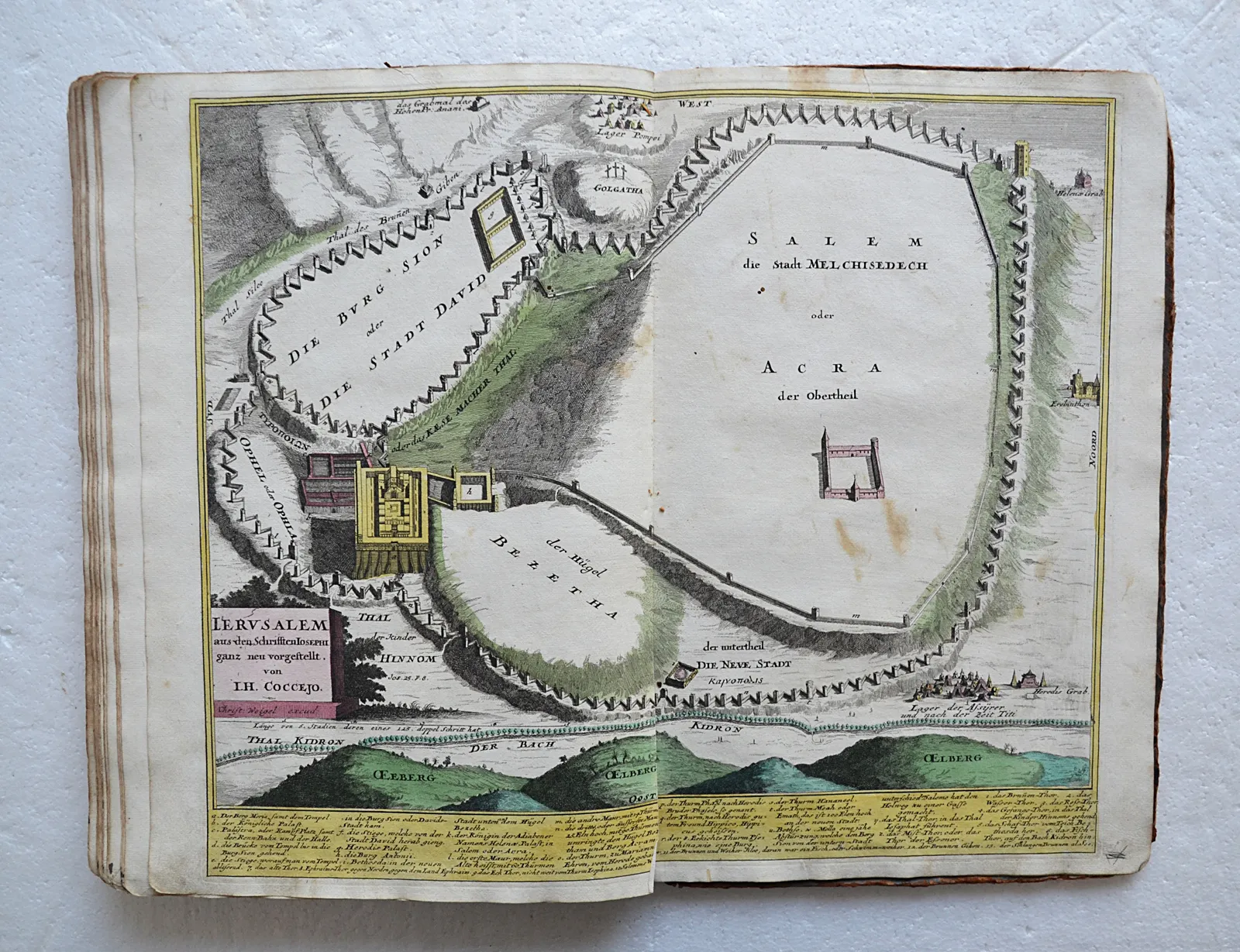 L’atlas est illustré d’une carte en noir à pleine page (Collegia residentiae & missiones provinciae Rheni inferioris), de 47 cartes coloriées à l’époque sur double-page (35 x 44 cm.),de deux grandes cartes dépliantes (53 x 62 cm. & 52,5 x 59,5 cm.), et de 5 plans sur double-page également coloriés (plan de bataille / Augsbourg ; distances entre les villes de Germanie ; carte des monuments de Rome ; camps des tribus d’Israël dans le désert ; plan de Jérusalem).