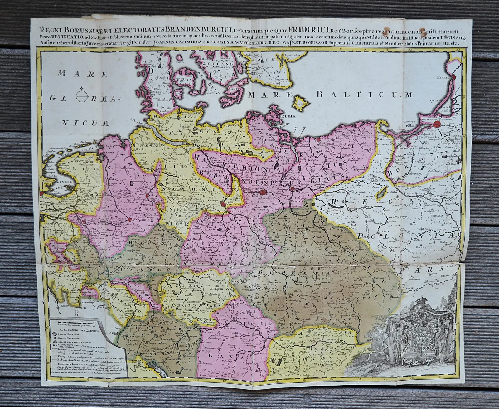 Comme en témoigne la première carte insérée après la liste manuscrite, cet atlas semble provenir d’une congrégation jésuite allemande (« Provinciae Rheni Inferioris Soc. Iesu. »). Il est composé de 52 cartes provenant de l’atlas de Christoph Weigel (sur 70), et de deux grandes cartes dépliantes reliées à l’époque (Regni Borussiae et Electoratus Brandenburgici & Theatrum Belli Rhenani).