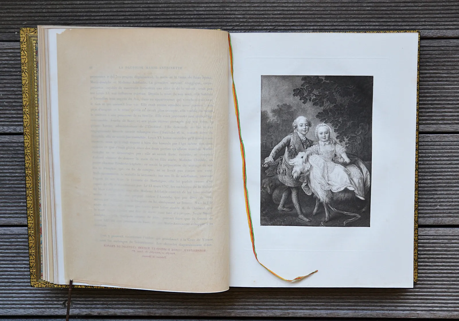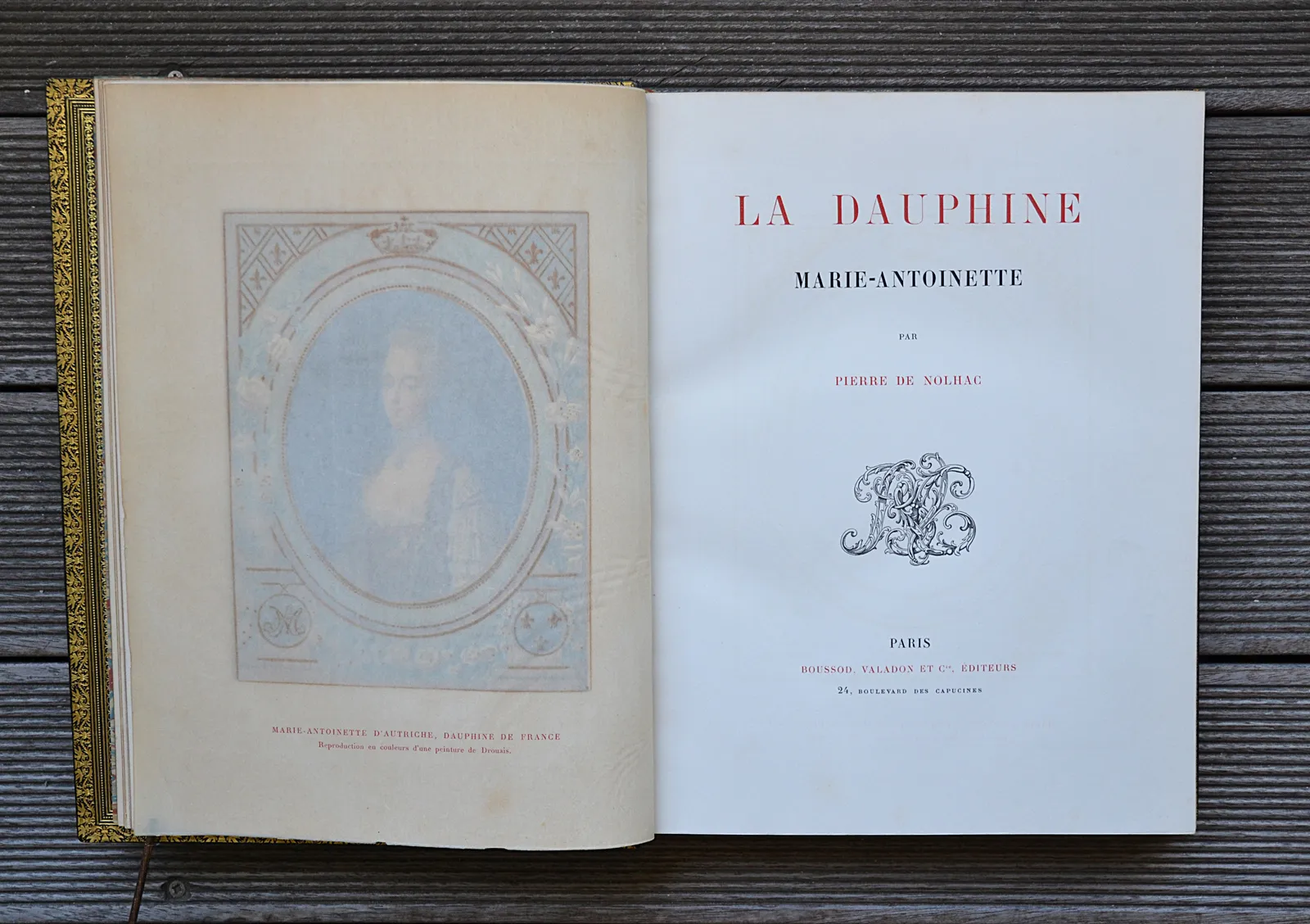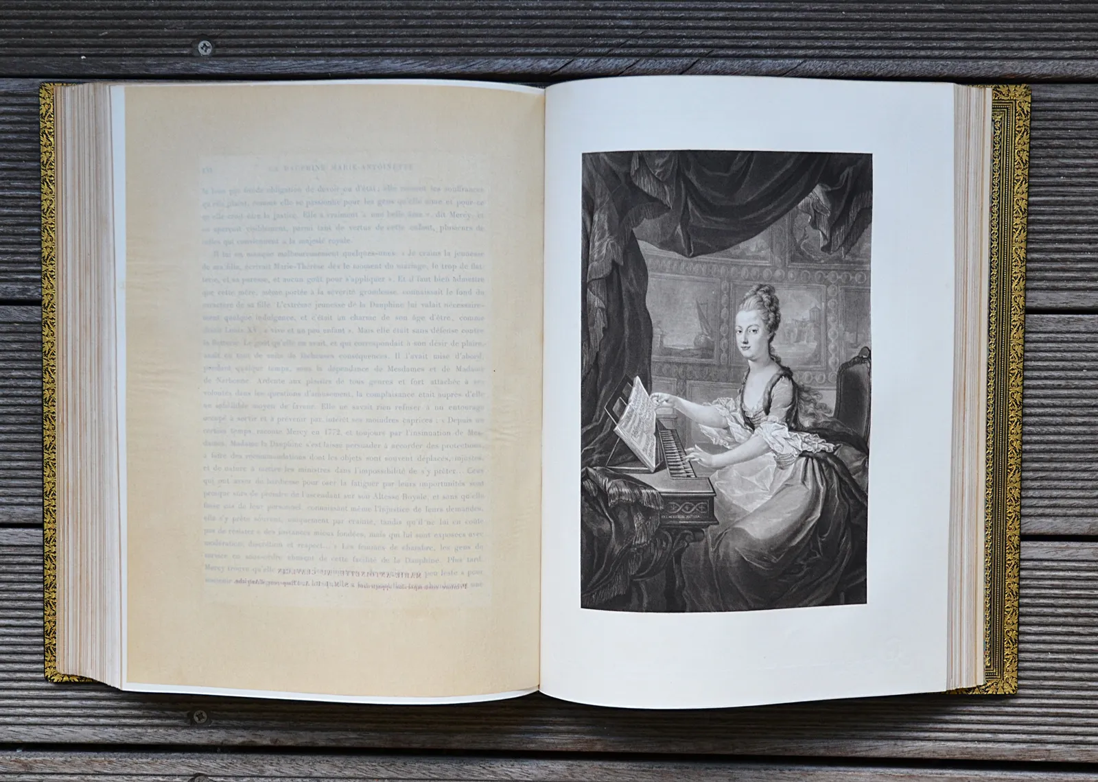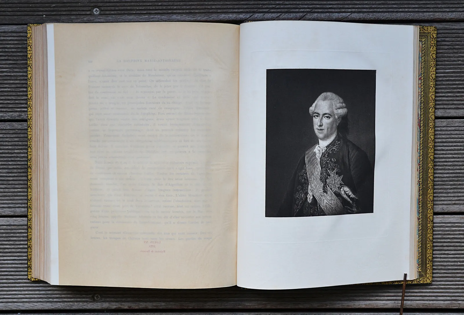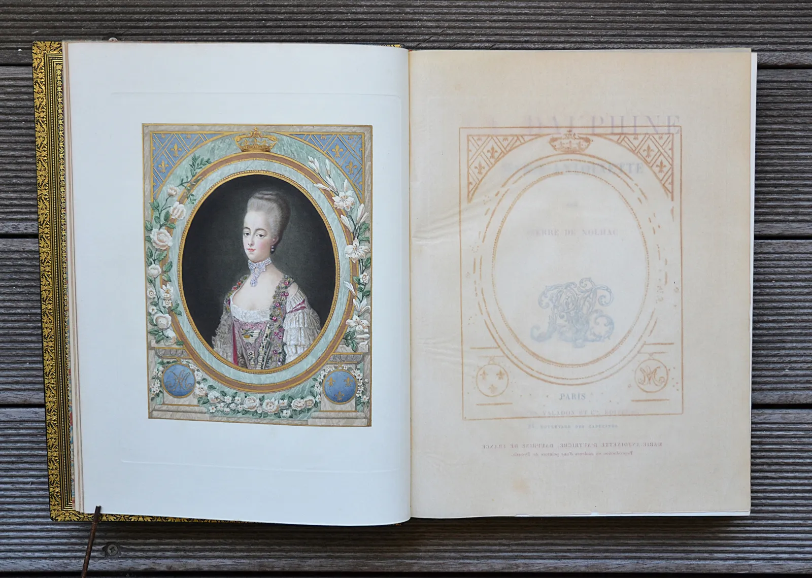 Somptueuse reliure de Durvand en maroquin bleu-nuit aux armoiries dorées de Marie-Antoinette, fleurs de lys dans les angles. Portrait-frontispice aquarellé à la main avec rehauts d'or et 28 planches gravées hors-texte.