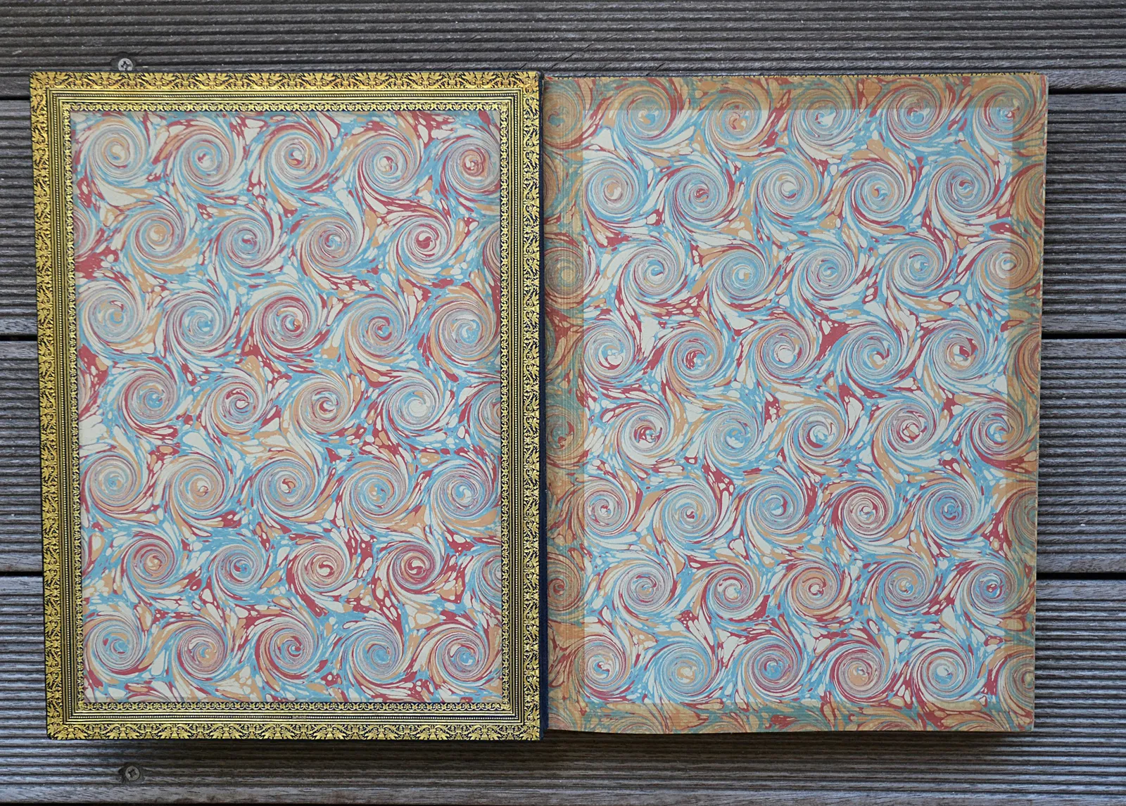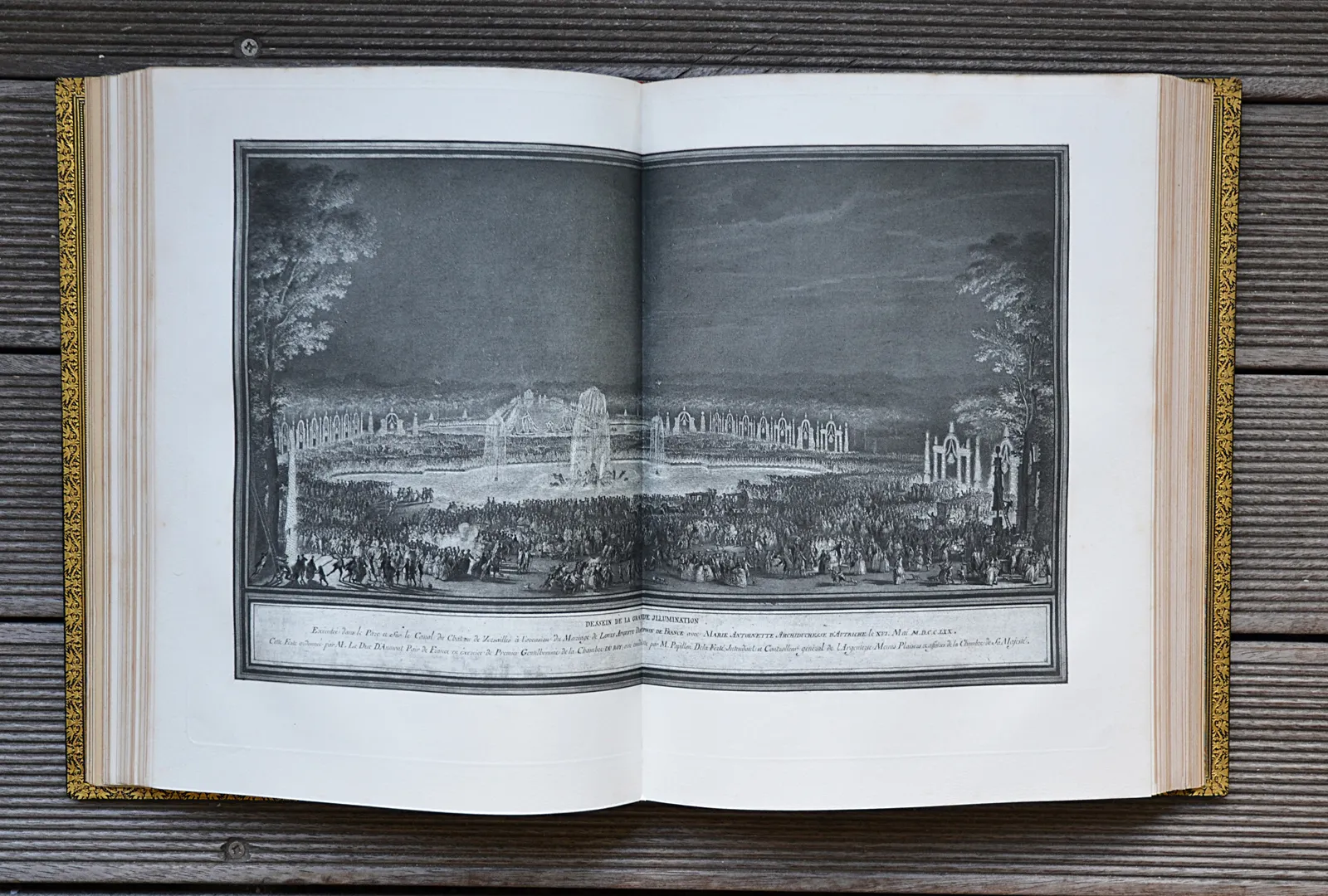 Un volume grand in-4 (25 x 32 cm.) de : (2ff.) – 181 pp. – (1f.) ; maroquin bleu-nuit, armoiries dorées de Marie-Antoinette au centre des plats, fleur de lys dorée dans les angles, dos à nerfs orné de fleurs de lys, date dorée en queue, double filet dorée sur les coupes, large roulette dorée à l’intérieur, tranches dorées, couverture conservée (Durvand).