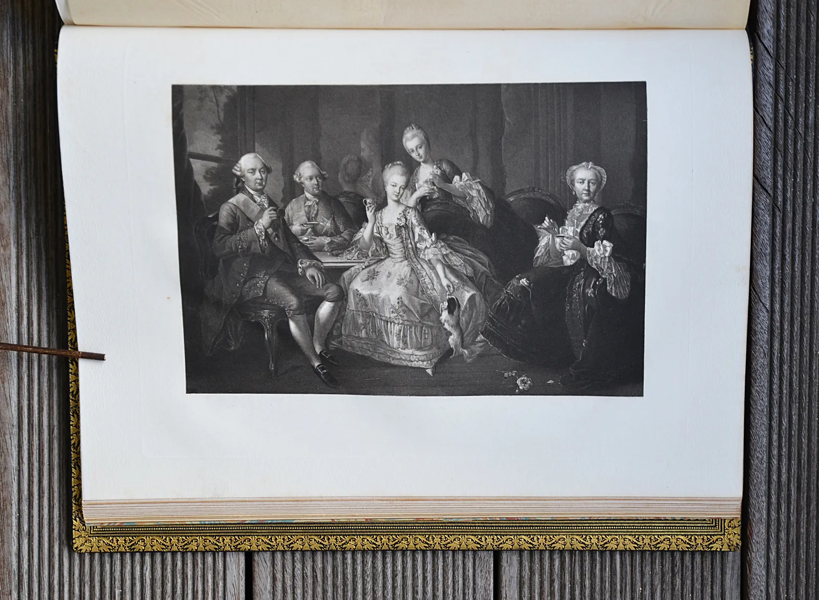 L’ouvrage est illustré d’un portrait-frontispice aquarellé à la main avec rehauts d’or, de 28 planches gravées hors-texte, de 5 culs-de-lampe & de 5 en-têtes gravés, le tout, protégé par des serpentes légendées.