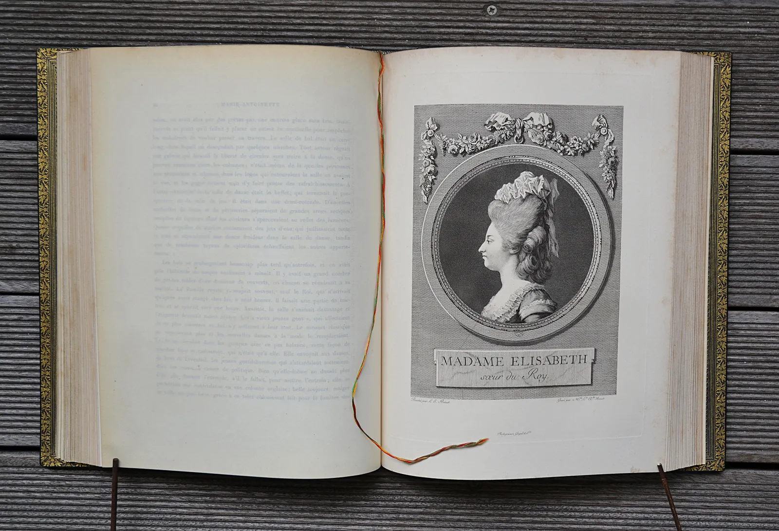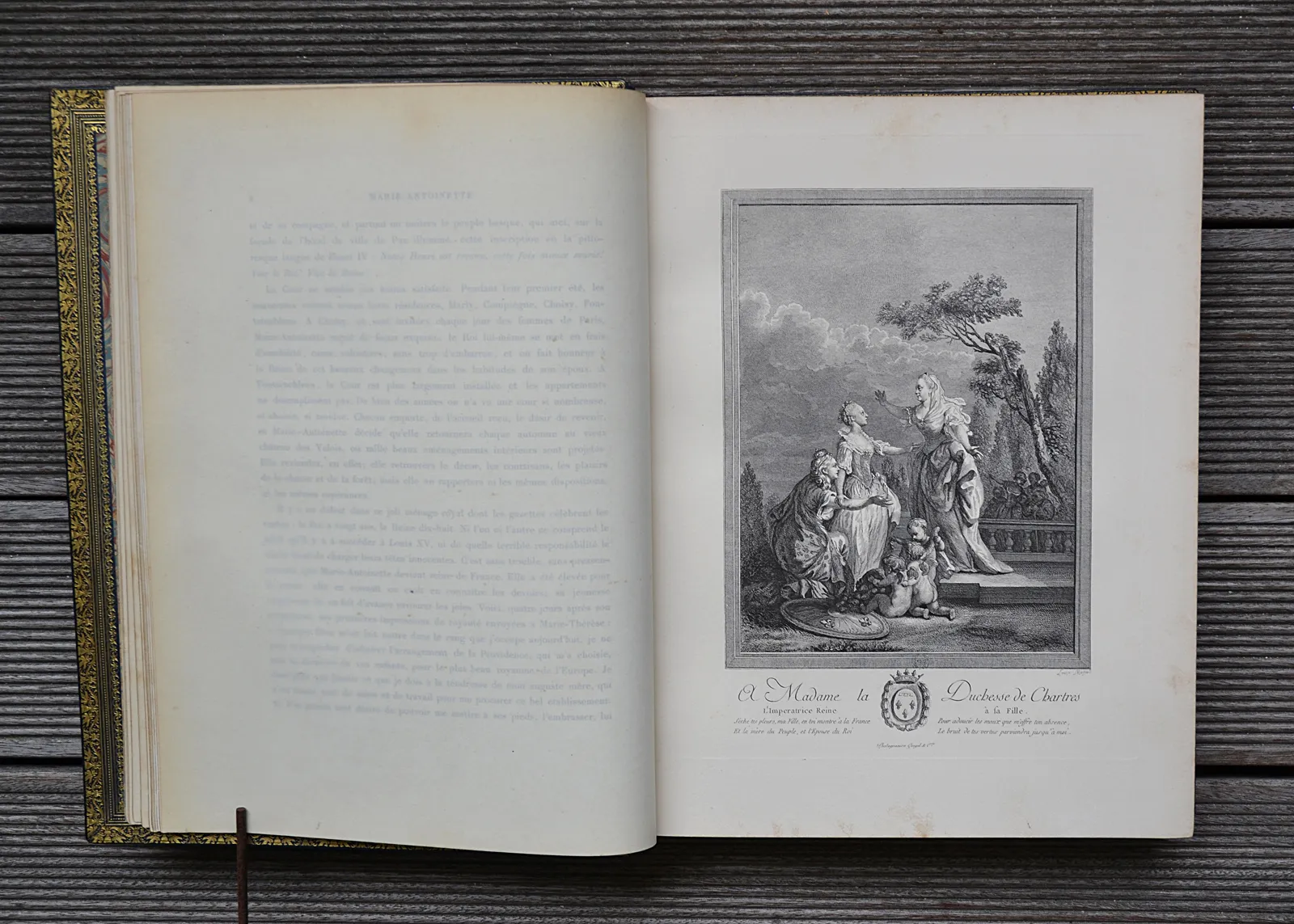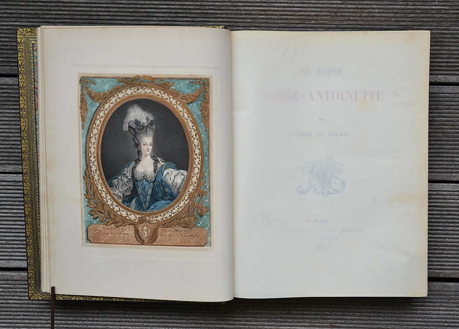 Magnifique reliure de Durvand en maroquin bleu-nuit frappé des armoiries de Marie-Antoinette. Portrait-frontispice colorié, 28 planches gravées hors-texte et 4 culs-de-lampe gravés, sous serpentes.