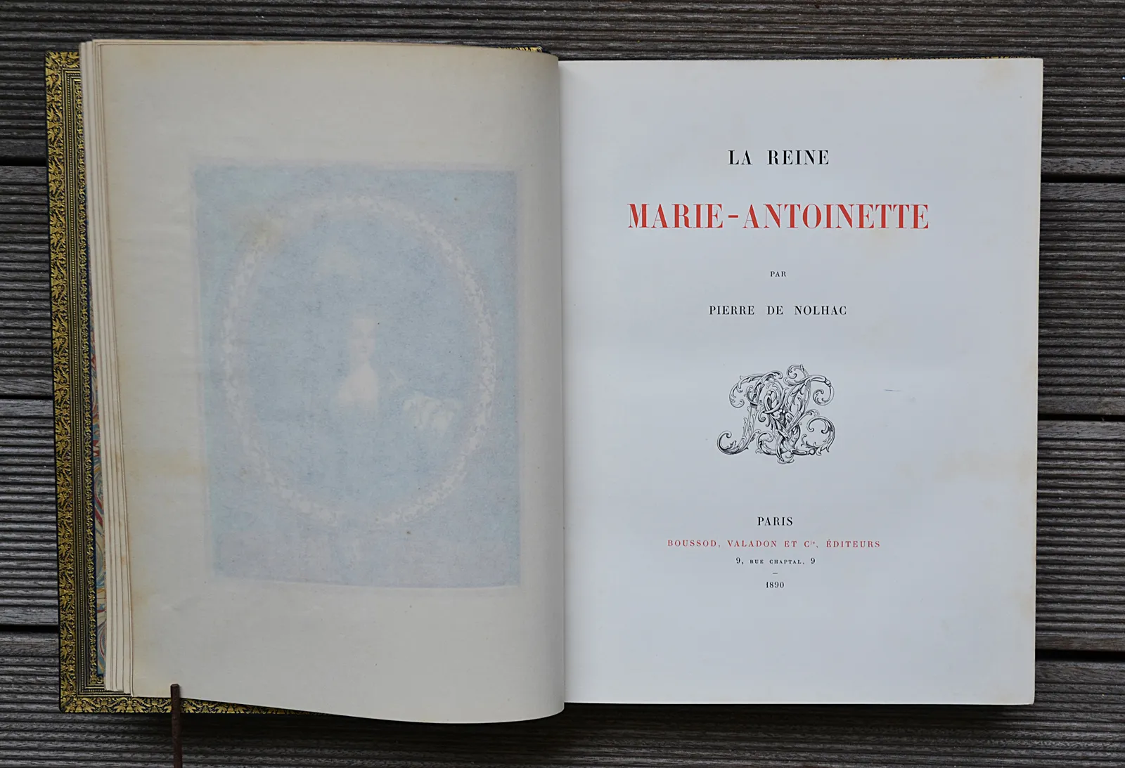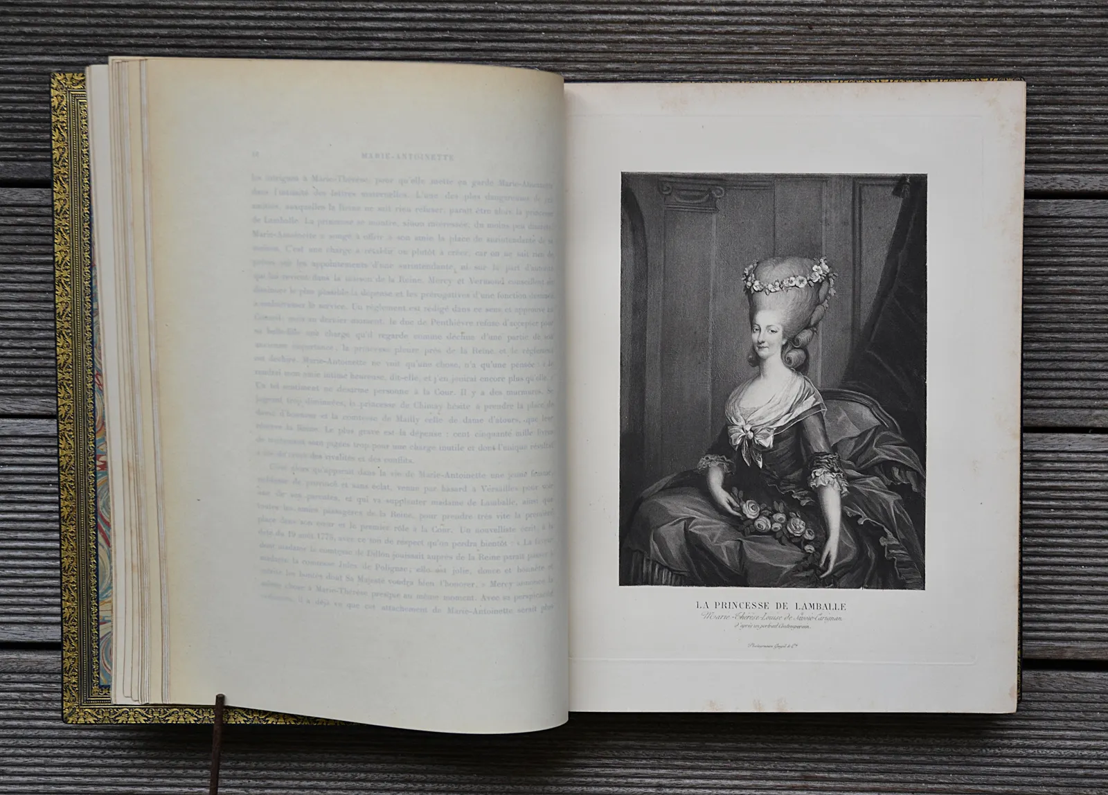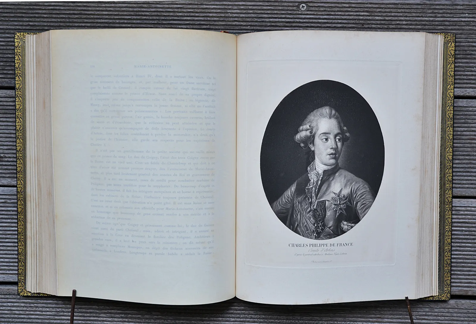 Magnifique reliure de Durvand en maroquin bleu-nuit frappé des armoiries de Marie-Antoinette. Portrait-frontispice colorié, 28 planches gravées hors-texte et 4 culs-de-lampe gravés, sous serpentes.