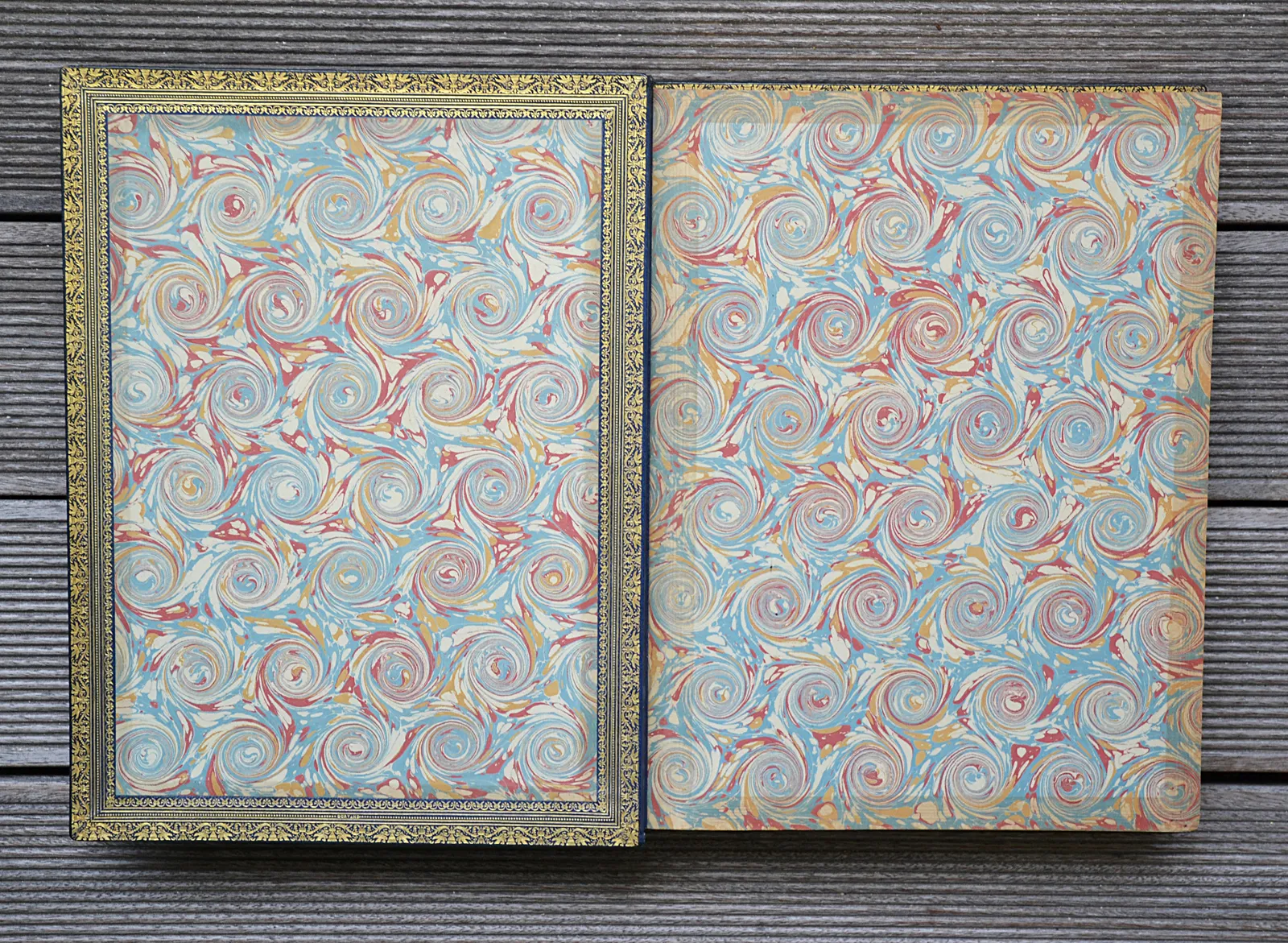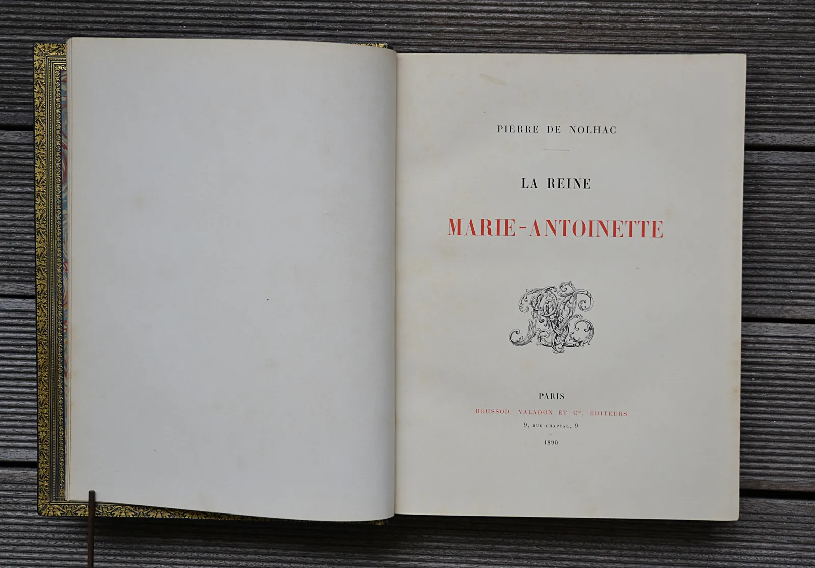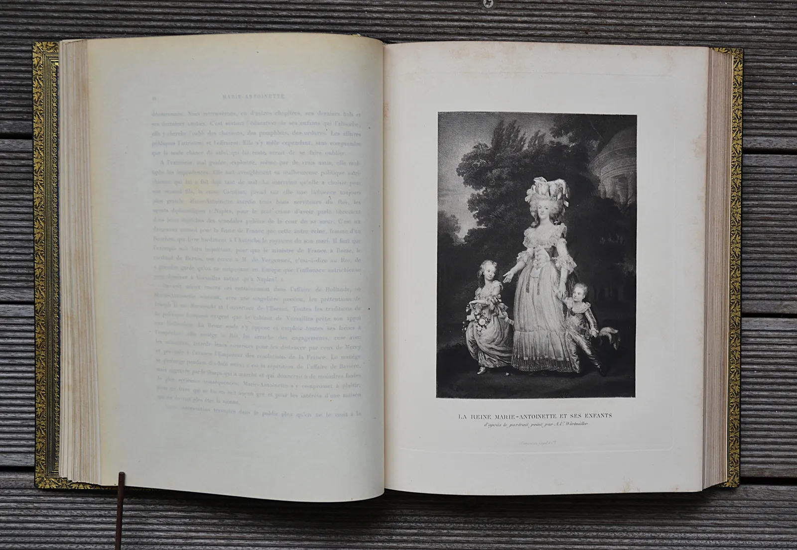 Un volume grand in-4 (25 x 32 cm.) de : 189 pp. – (1f.) ; maroquin bleu-nuit, armoiries dorées de Marie-Antoinette au centre des plats, fleur de lys dorée dans les angles, dos à nerfs orné de fleurs de lys, date en queue, double filet dorée sur les coupes, large roulette dorée à l’intérieur, tranches dorées, couverture conservée (Durvand).