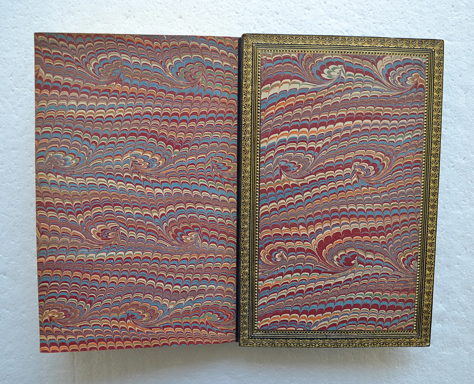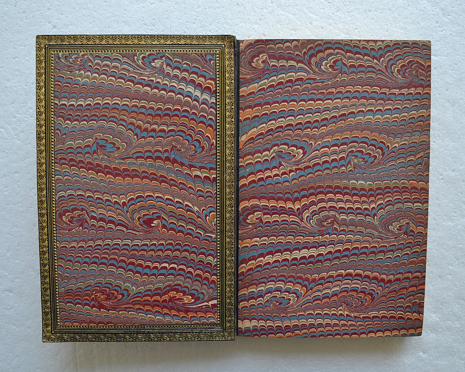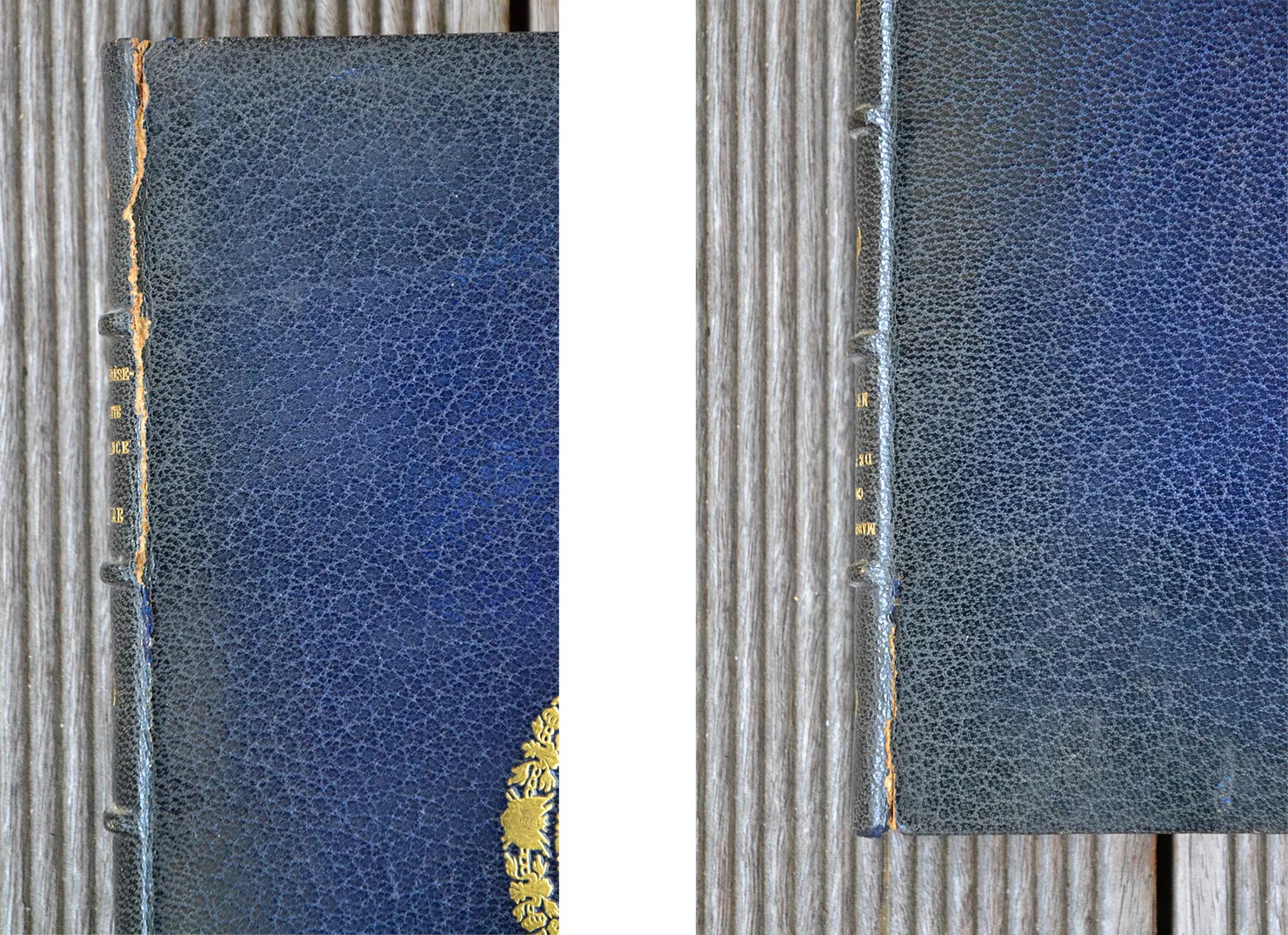 Un volume in-8 (15,5 x 23,5 cm.) de (3ff.) – 167 pp. – (2ff.) ; maroquin bleu-nuit, armoiries dorées au centre du premier plat, dos à nerfs orné de fleurs de lys, large dentelle dorée à l’intérieur, tranches dorées, couverture conservée (Kauffmann).
