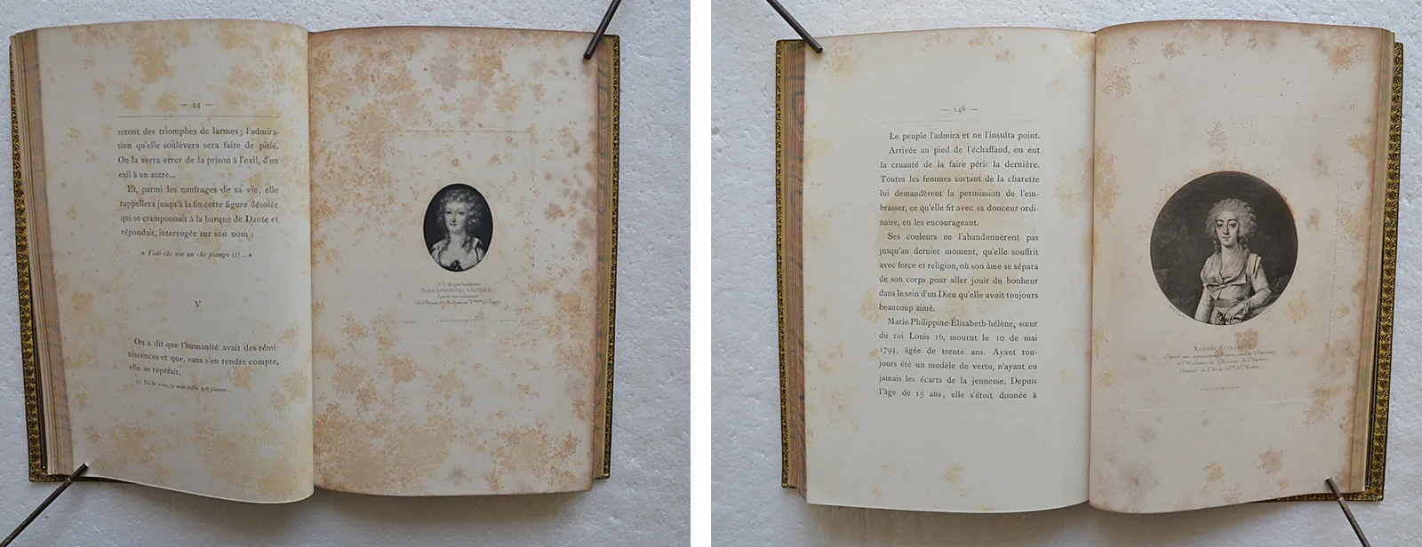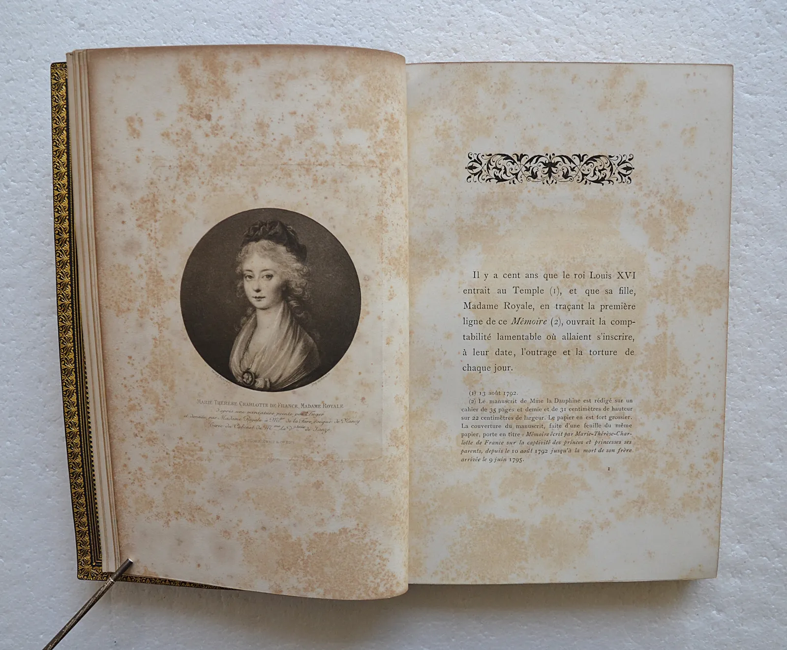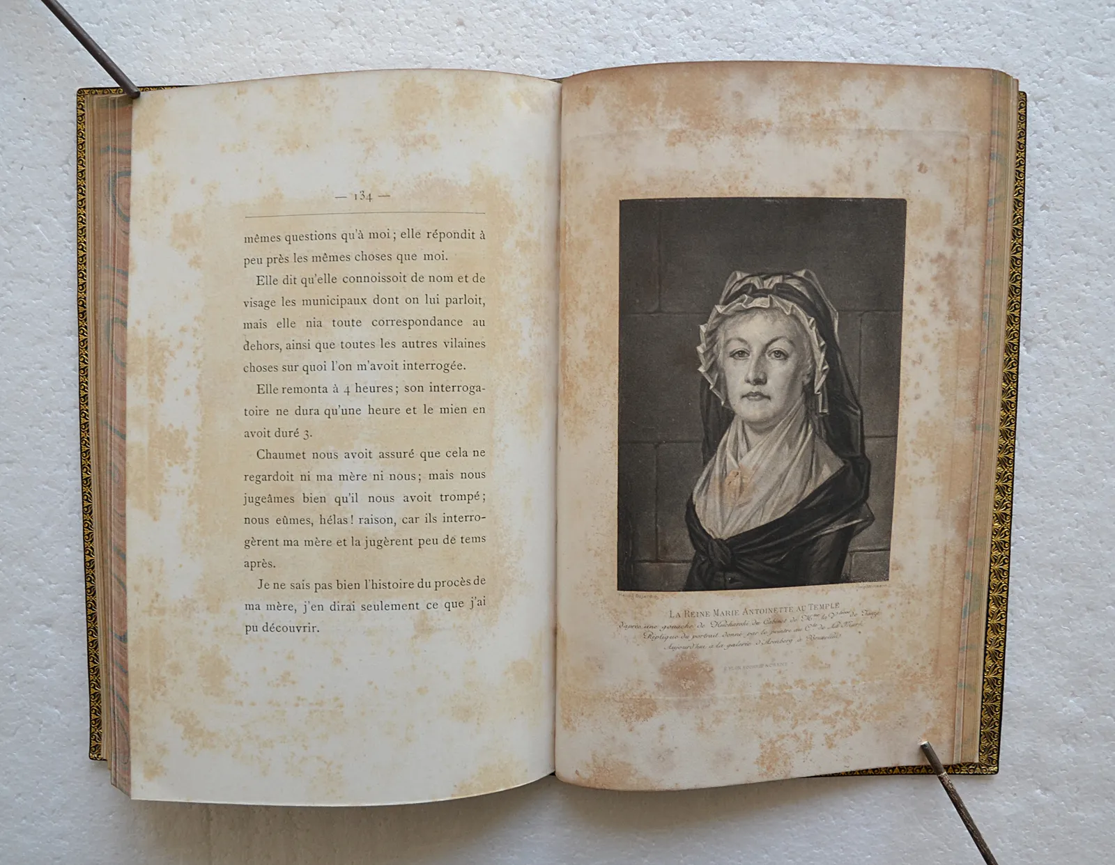 Rare édition originale en maroquin bleu-nuit de Kauffmann aux armoiries dorées, six portraits hors-texte, récit de la captivité au Temple.