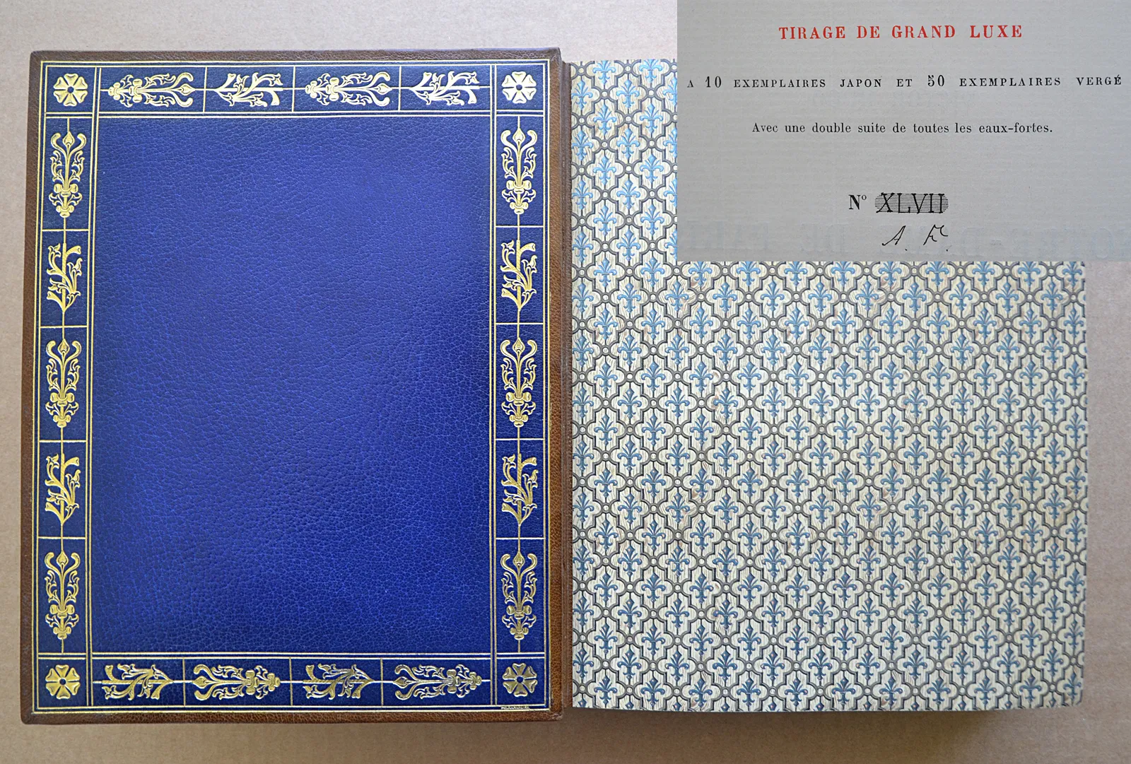 Somptueux exemplaire du tirage de grand luxe en maroquin havane doublé de Paul-Romain Raparlier, relieur inventeur du décor en cuir de bœuf incisé. Double suite des 73 eaux-fortes. Provenance du bibliophile Albert Hornung.
