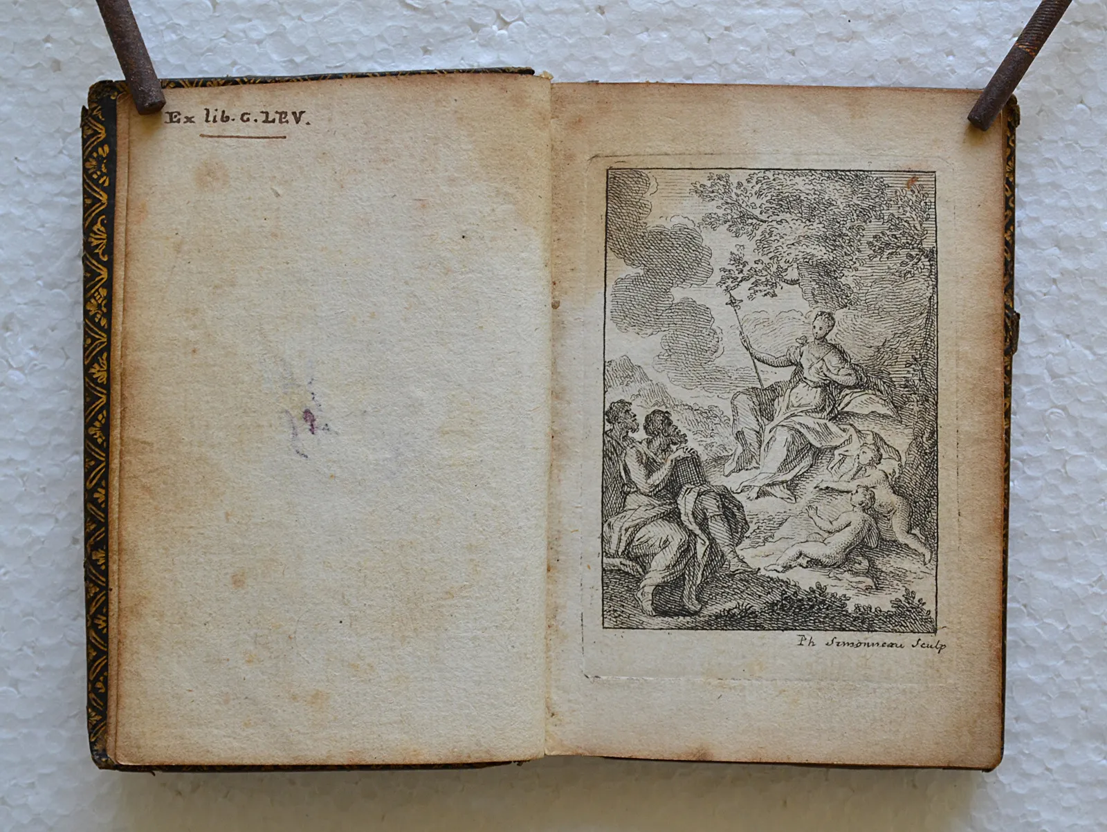 Un petit volume in-32 (6,5 x 9,2 cm.) de : un frontispice – (2ff.) – 86 pages ; maroquin olive, médaillon renfermant trois fleurs de lys dans une pièce de maroquin rouge au centre des plats avec un décor de fleurs et points dorés, le tout dans un encadrement de fleurs de lys et filets dorés, dos à nerfs orné de fleurs de lys et points dorés, roulette dorée à l’intérieur, tranches dorées (reliure de l’époque).