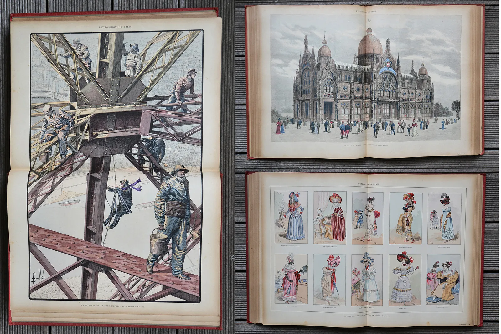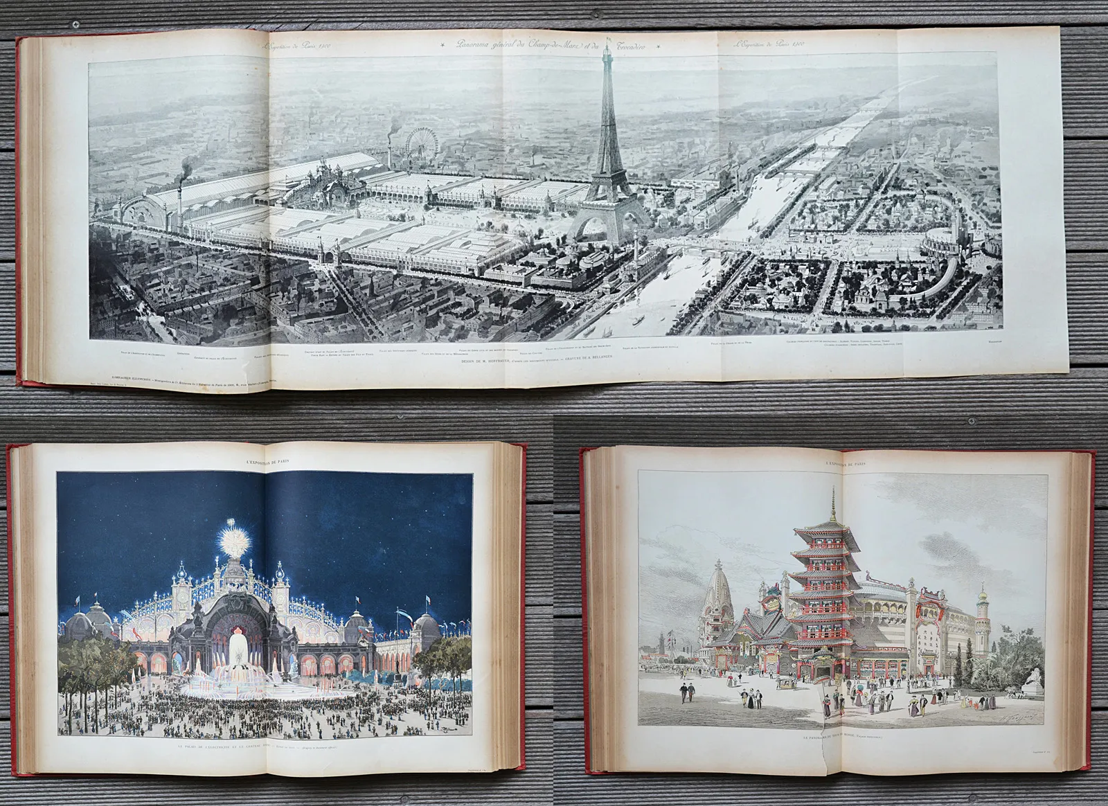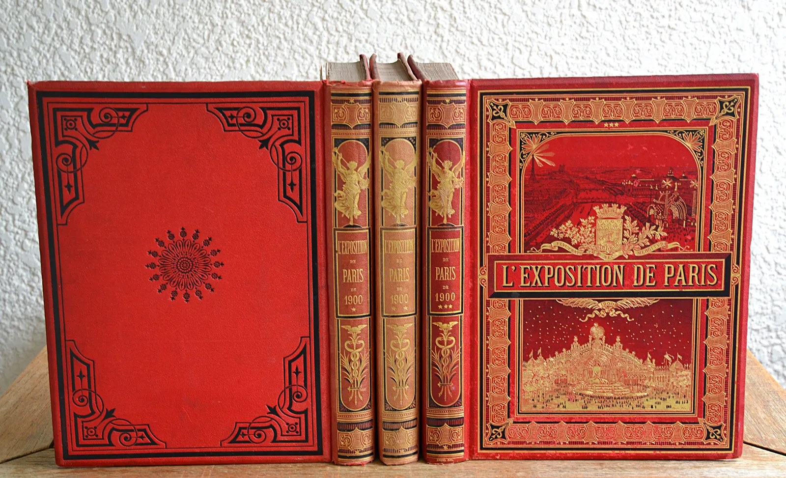 Trois volumes en cartonnage rouge de l'éditeur consacrés à l'Exposition universelle de 1900, illustrés de 120 planches hors-texte dont 32 en couleurs et 3 panoramas dépliants.