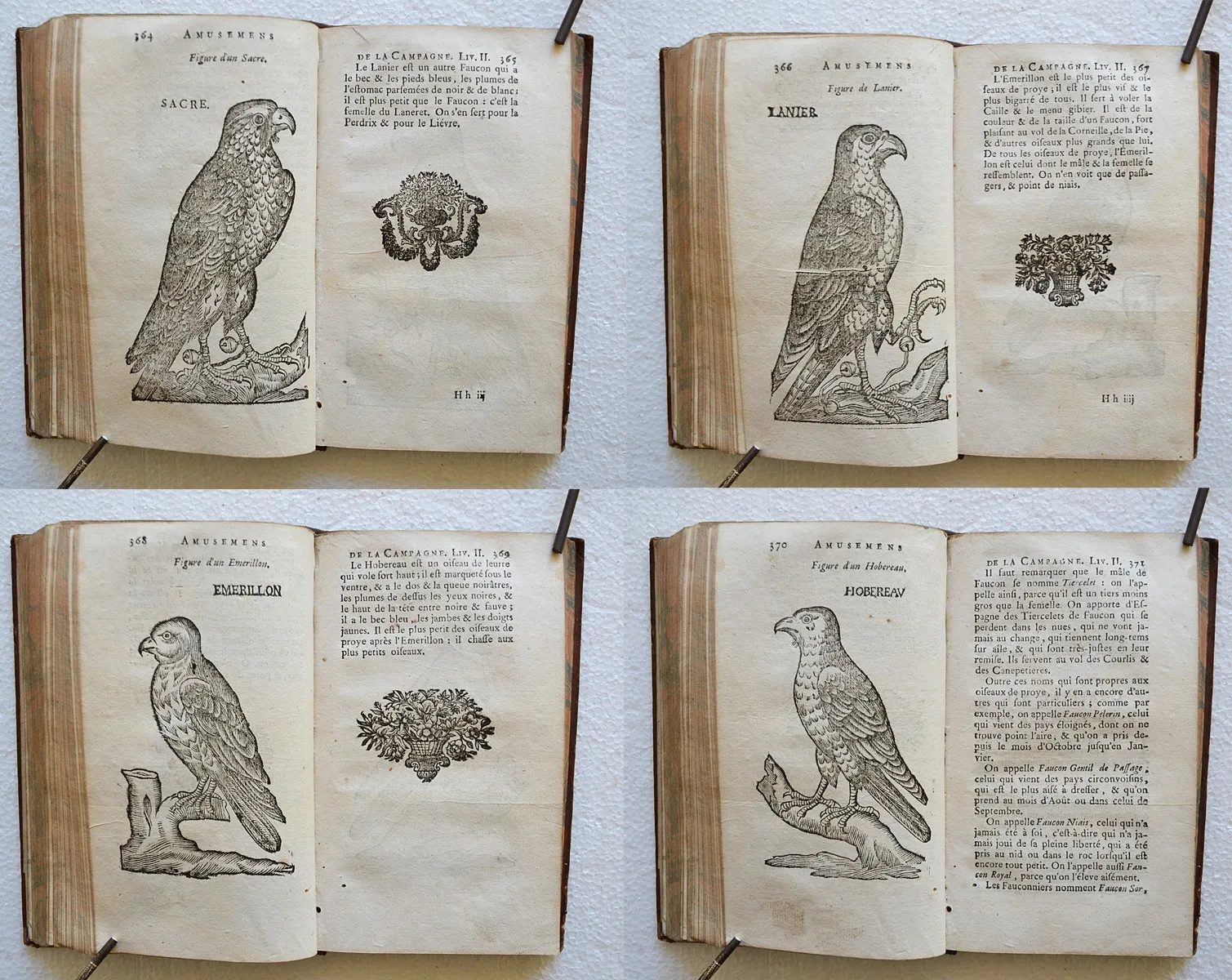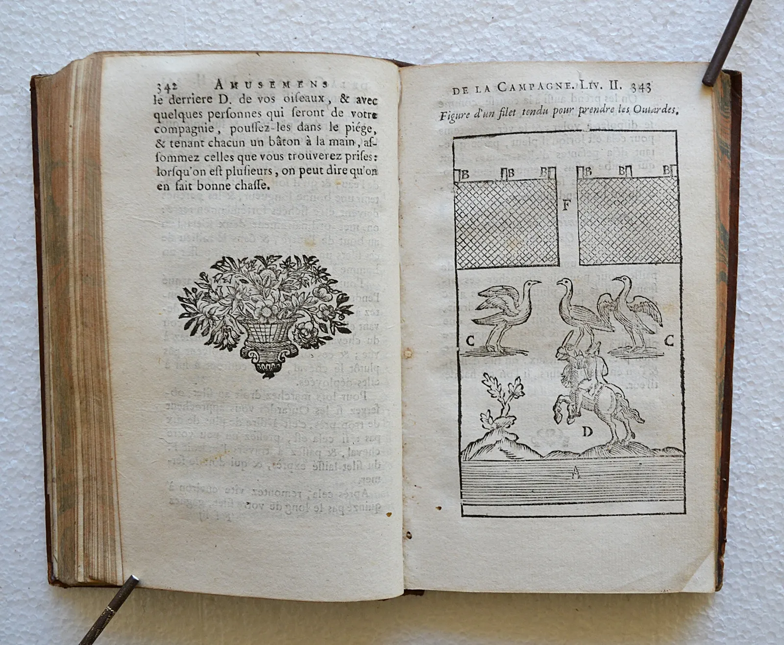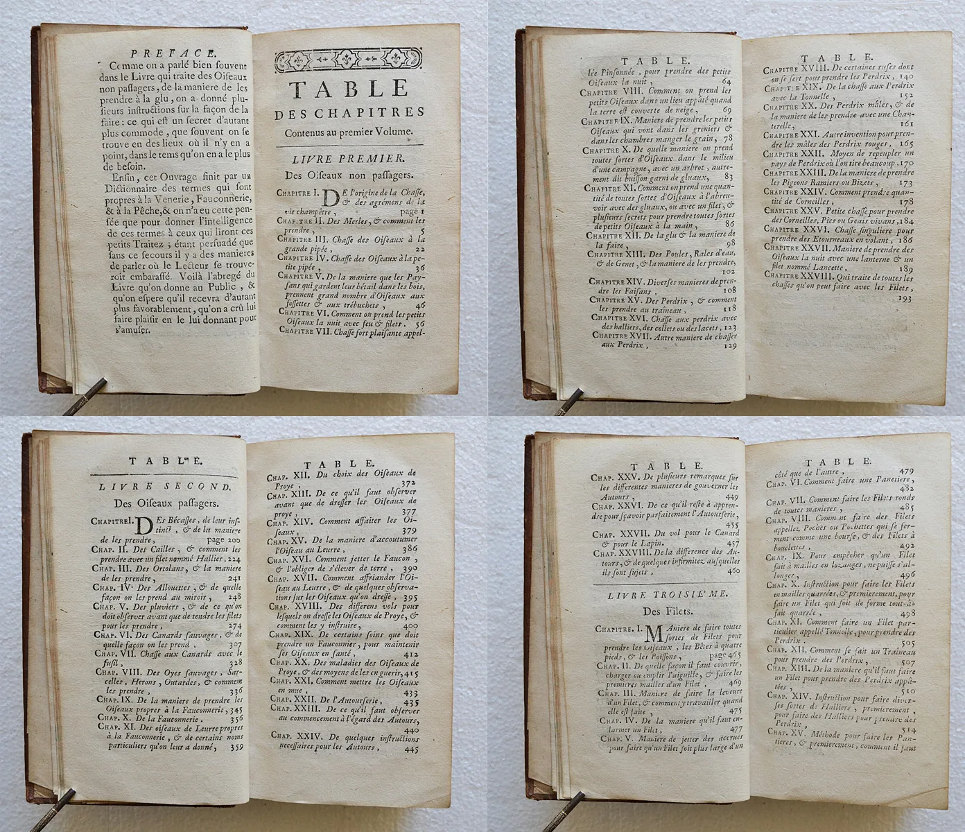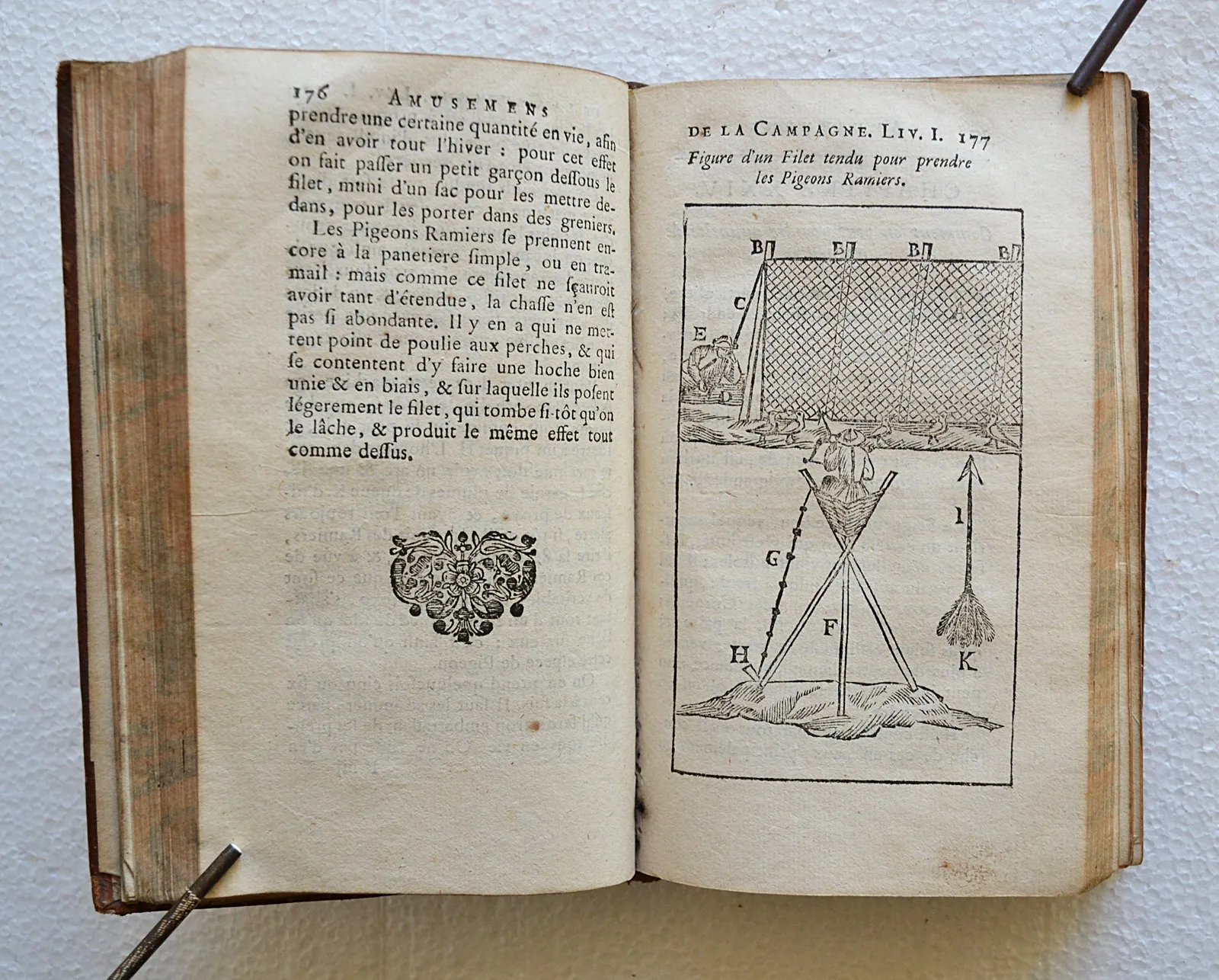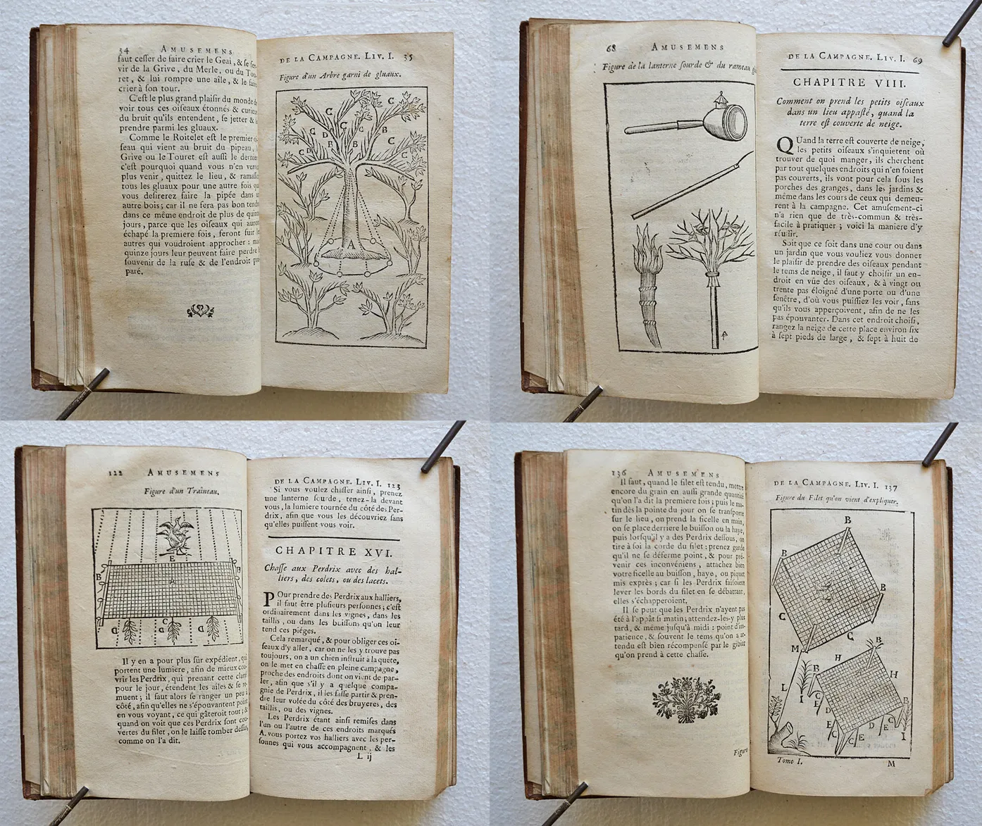 Premier volume des Nouvelles ruses innocentes de 1753, illustré de 81 gravures dans le texte représentant les techniques de piégeage de toutes sortes d'oiseaux et de bêtes.