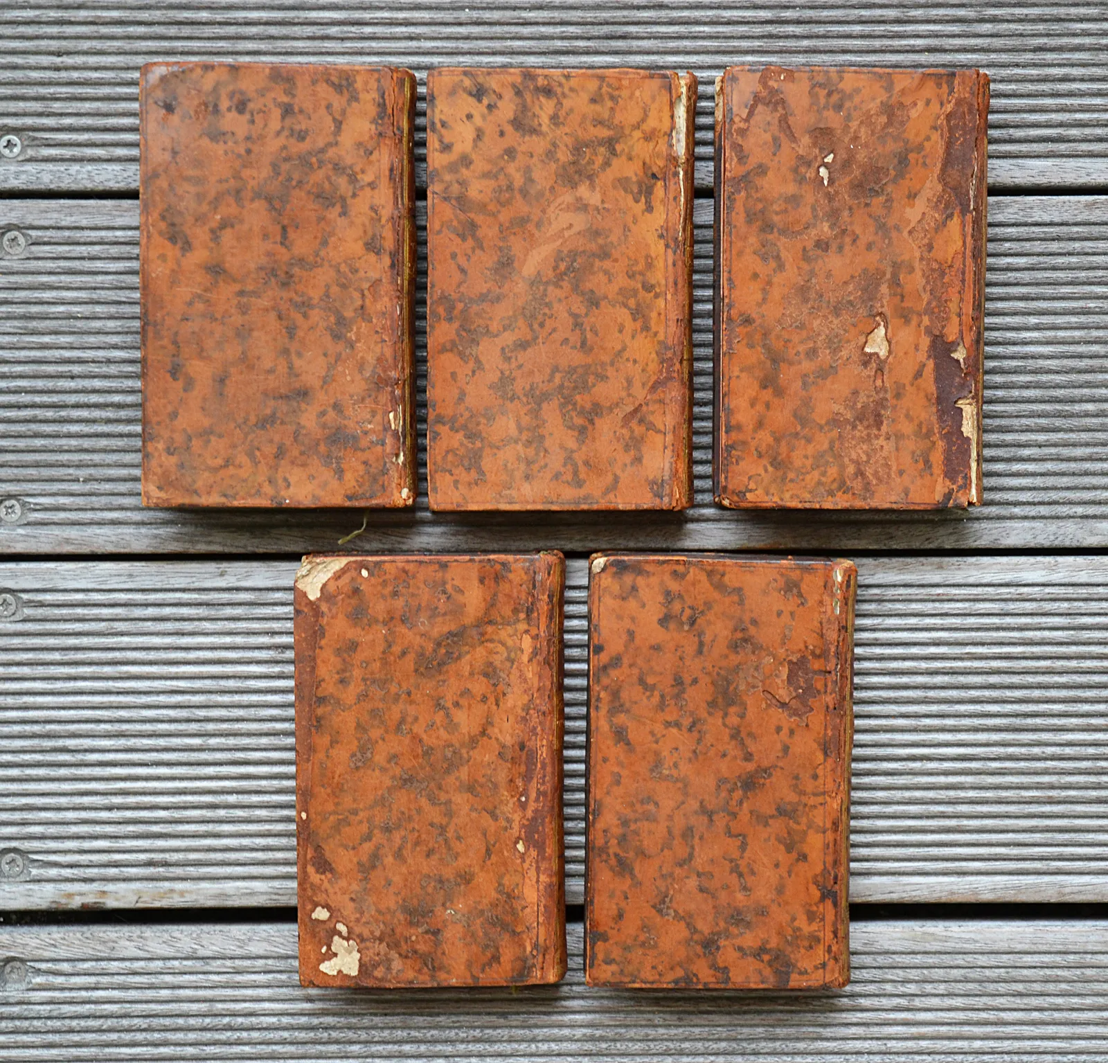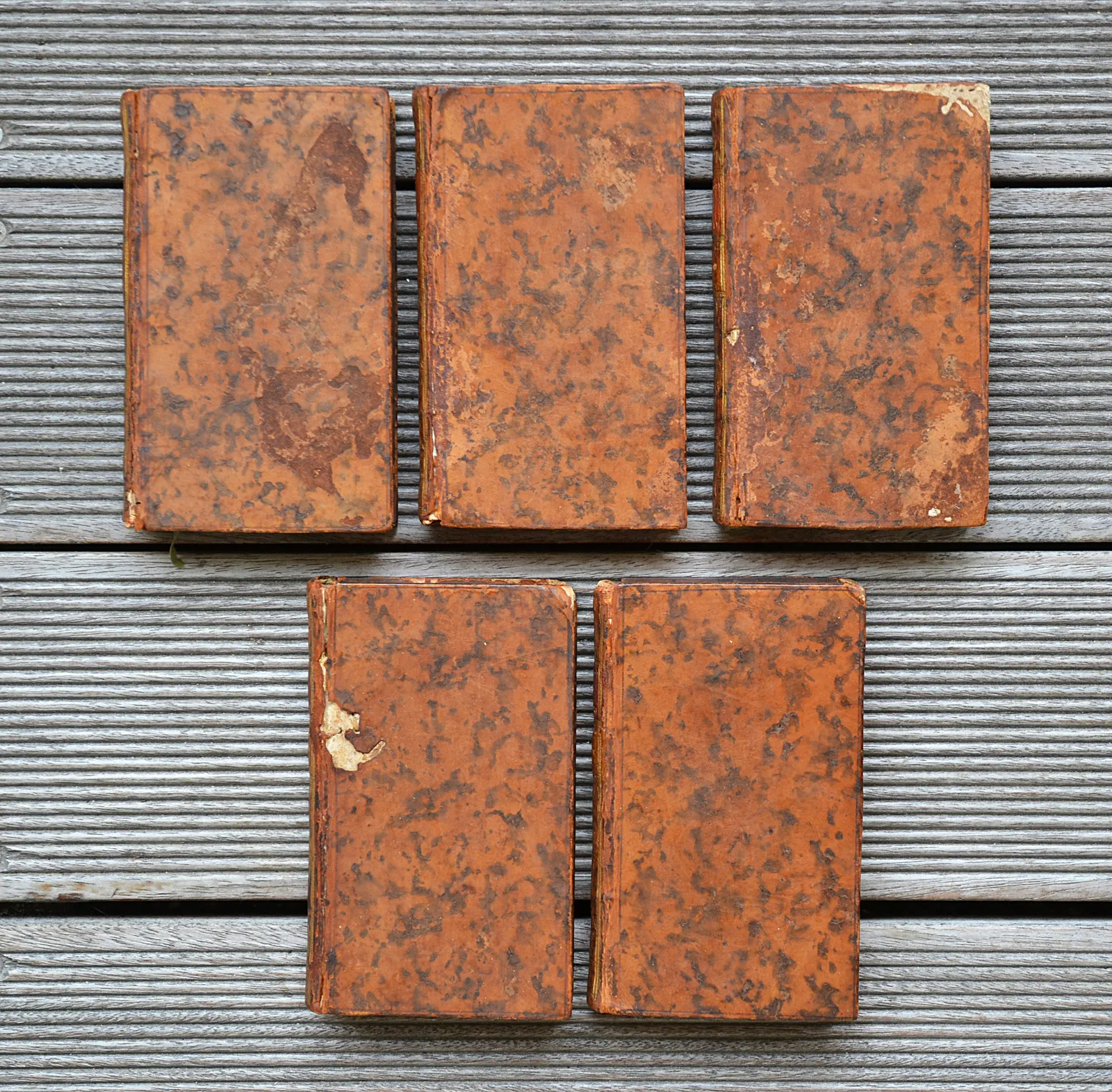 Cinq volumes in-12 (8,5 x 14,3 cm.) de VI – (1f.) – 368 pp. + 283(1) pp. + 392 pp. + 320 pp. + 314 pp. – (1f.) ; veau fauve marbré, filet à froid sur les plats, dos lisses ornés, filet doré sur les coupes, tranches rouges (reliure de l’époque).