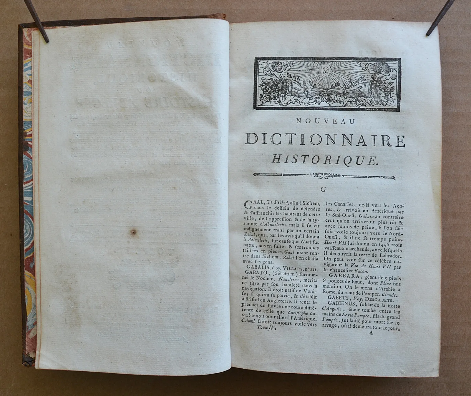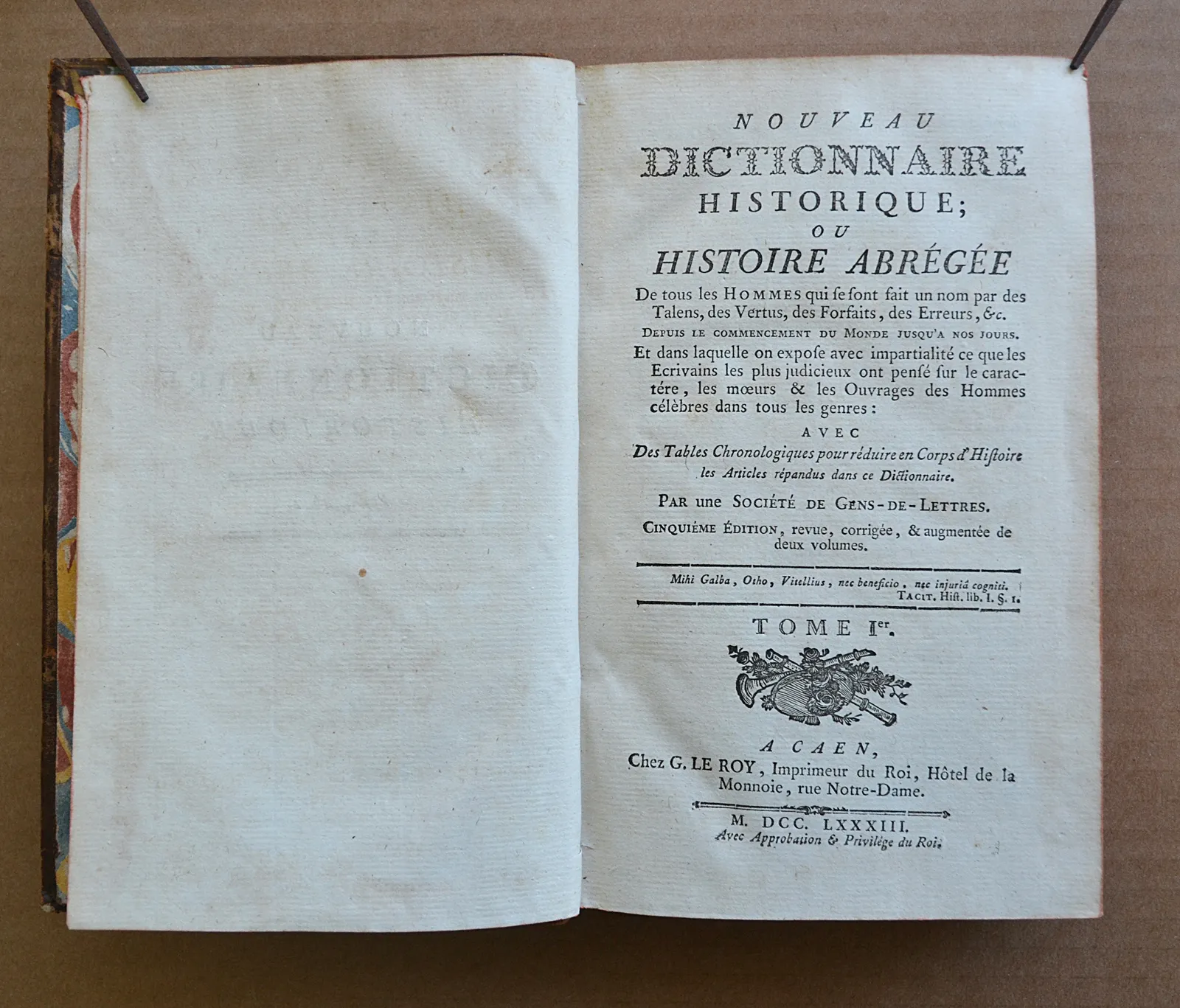Louis-Mayeul Chaudon (1737-1817) publia son « Nouveau Dictionnaire historique », à Avignon en 1766, en quatre volumes. Notre édition est la cinquième, revue, corrigée, & augmentée de deux volumes.