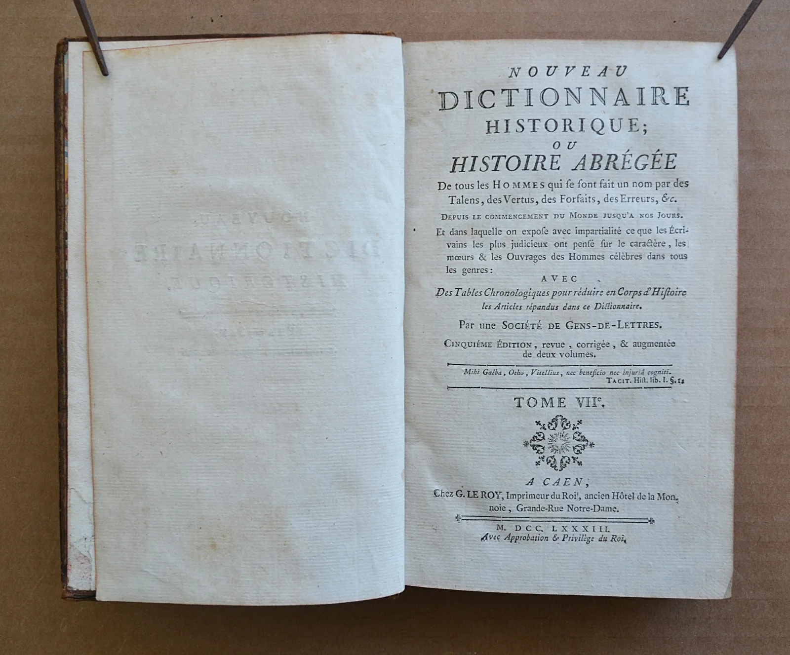 Nouveau dictionnaire historique ; ou histoire abrégée de tous les hommes qui se sont fait un nom par des talens, des vertus, des forfaits, des erreurs, etc. Depuis le commencement du monde jusqu’à nos jours. Et dans laquelle on expose avec impartialité ce que les écrivains les plus judicieux ont pensé sur le caractère, les mœurs & les ouvrages des hommes célèbres dans tous les genres. Avec des tables chronologiques pour réduire en corps d’histoire les articles répandus dans ce dictionnaire. Par une Société de Gens-de-Lettres.