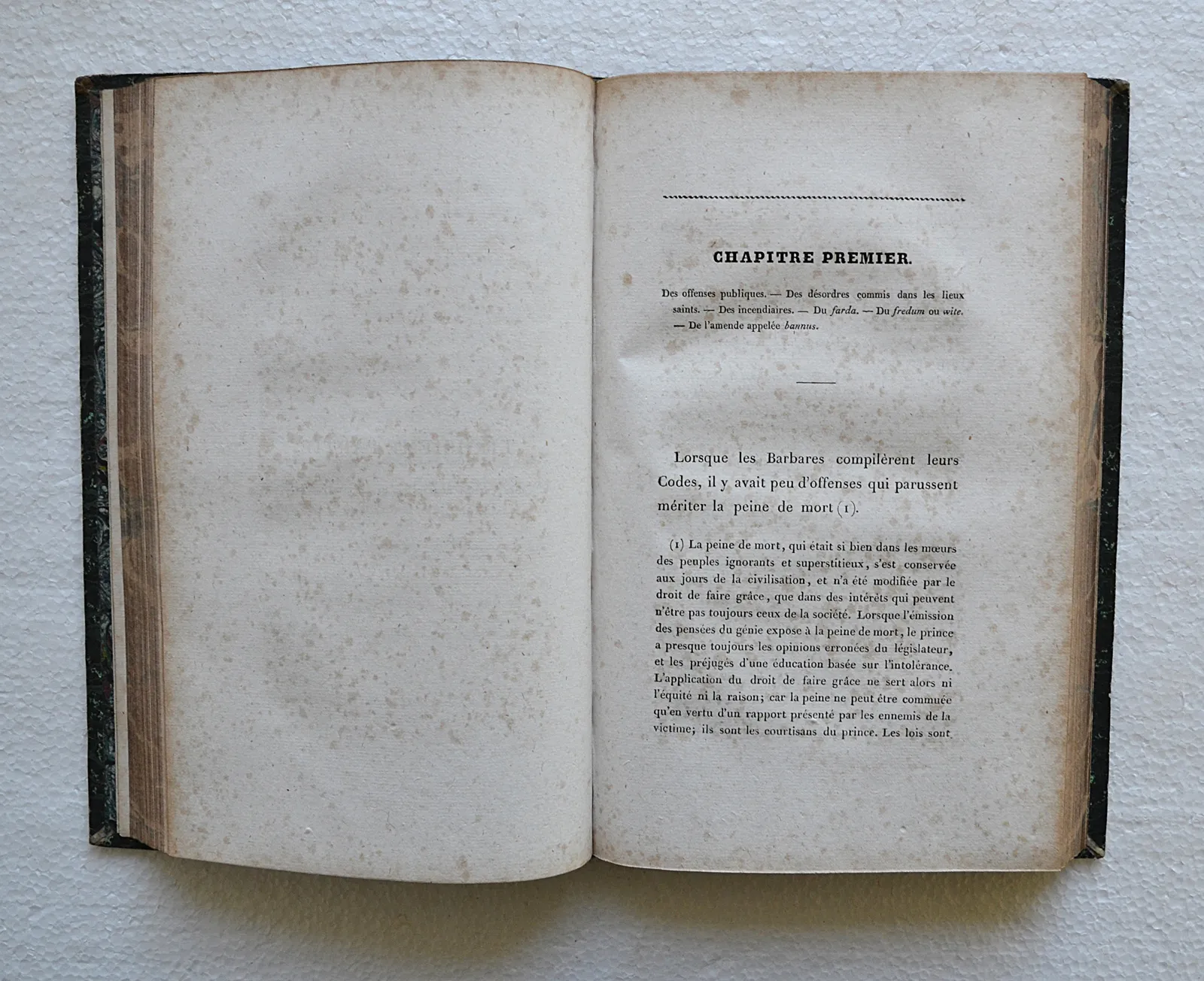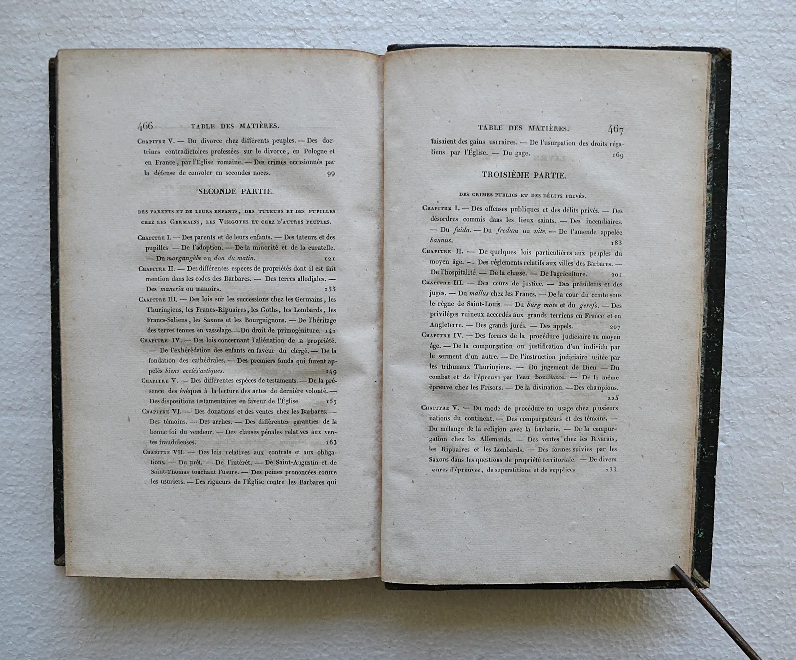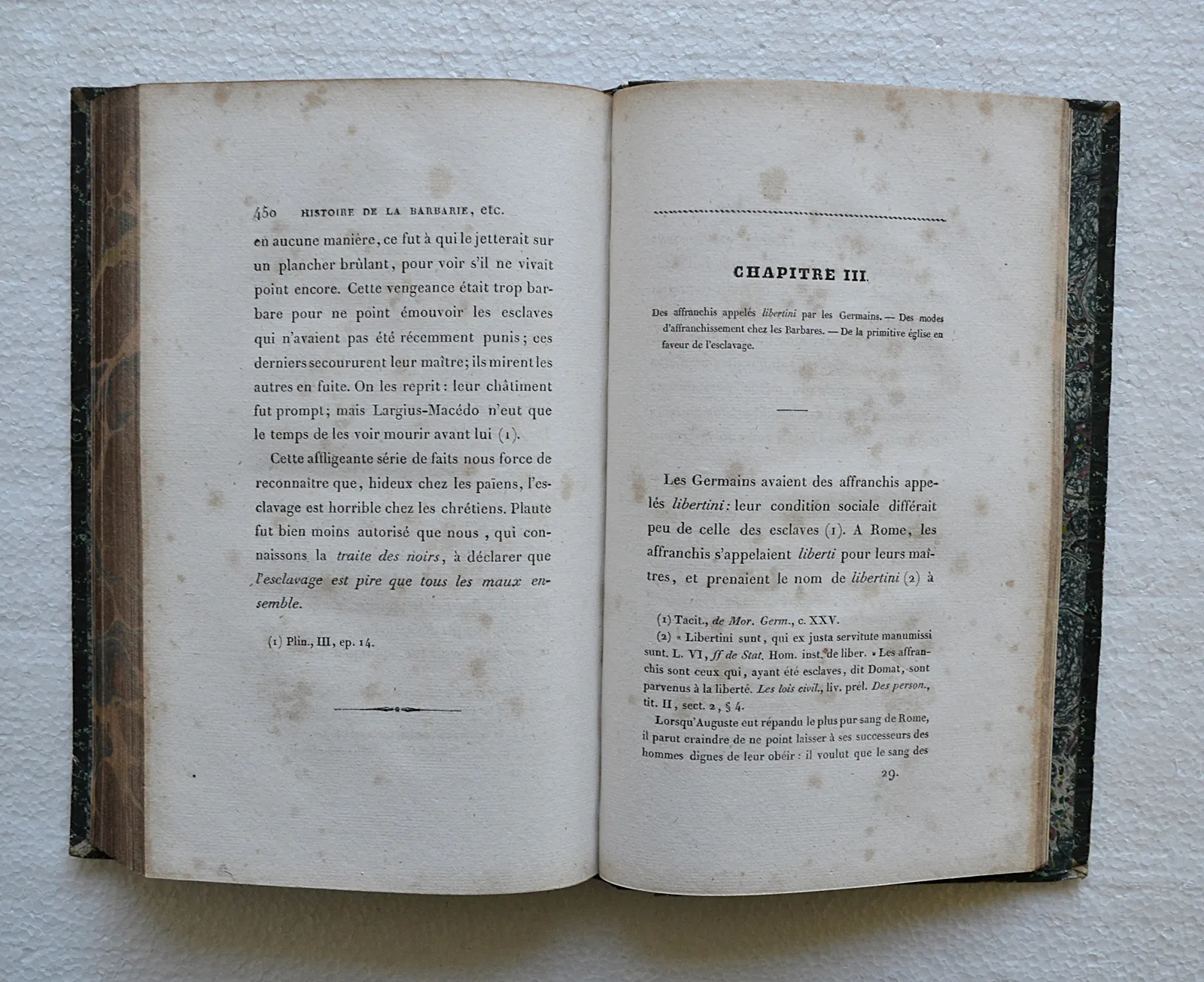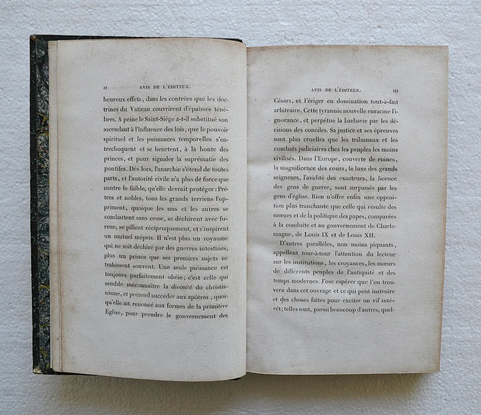 Trois volumes en demi-basane verte de l'époque, traitant de la barbarie, des lois et de la civilisation au Moyen Age, avec des comparaisons entre les mœurs des anciens et des modernes.