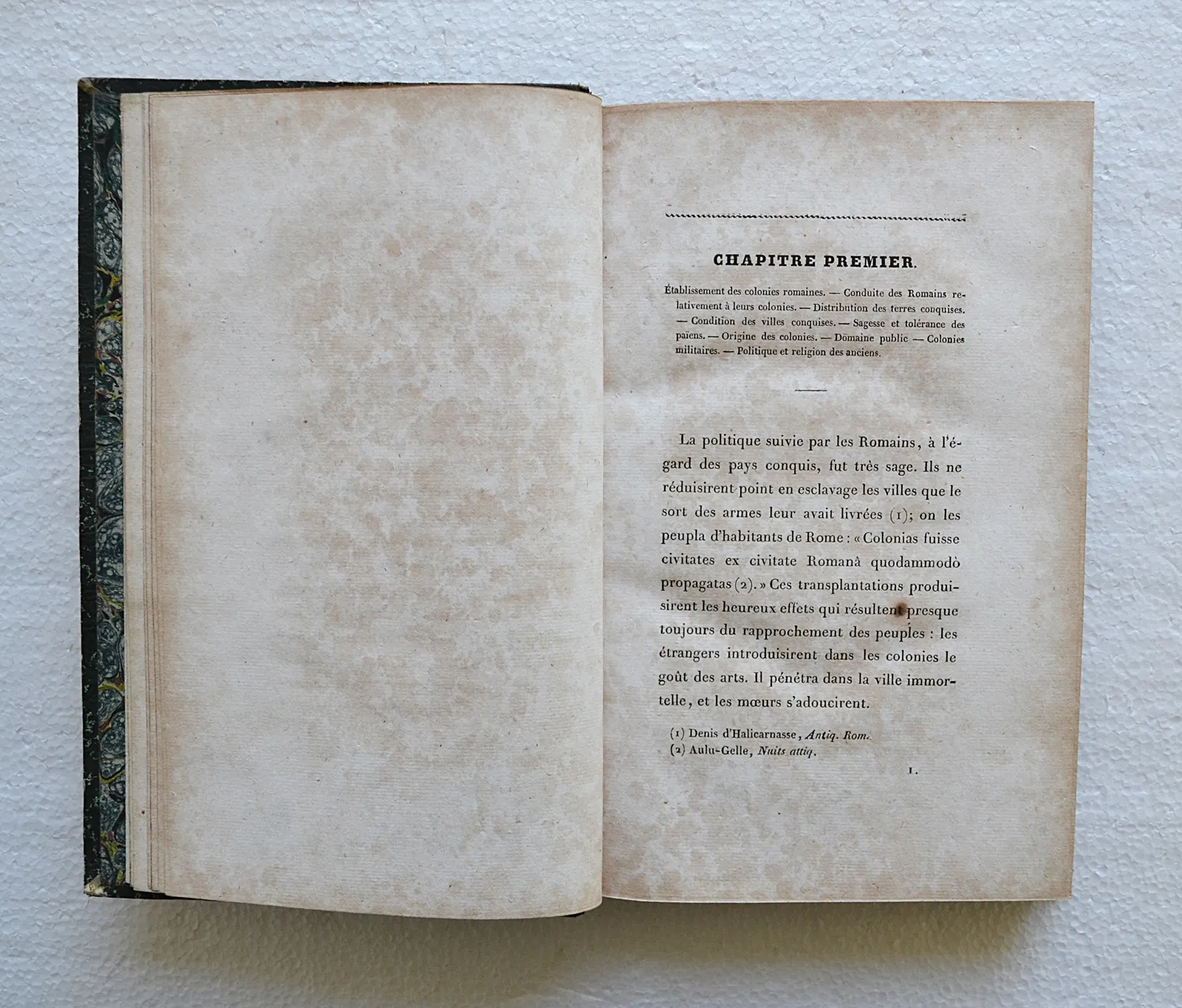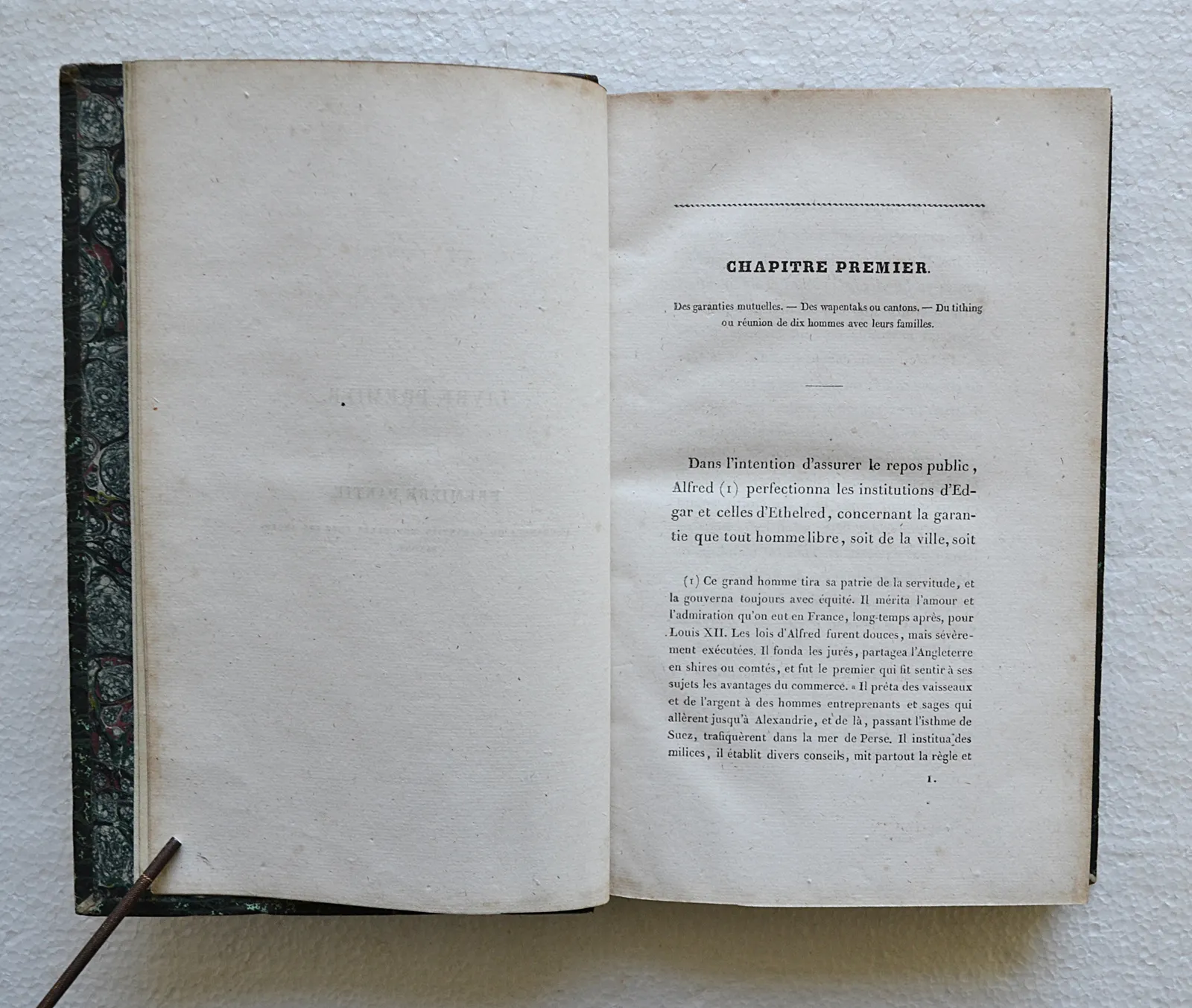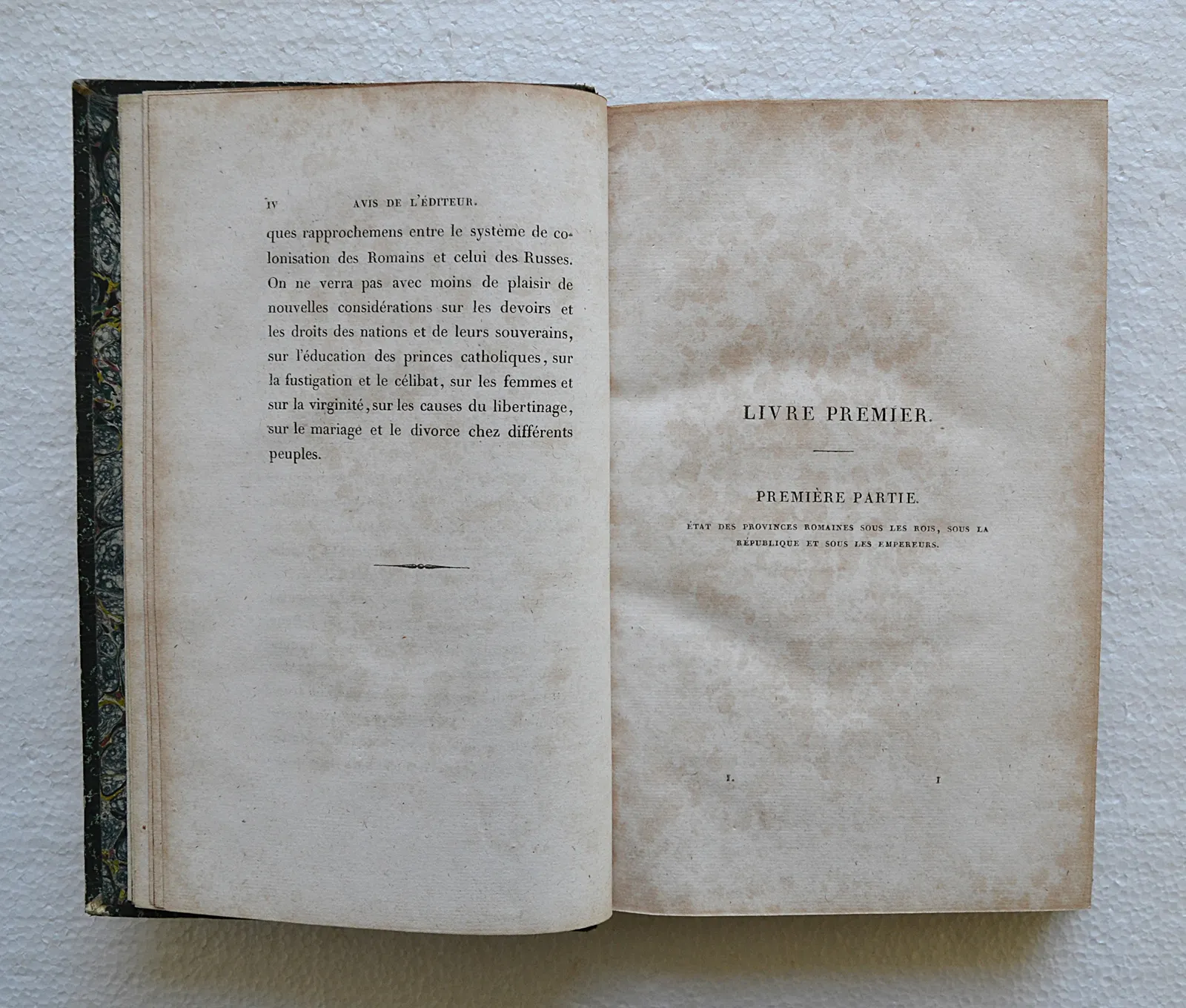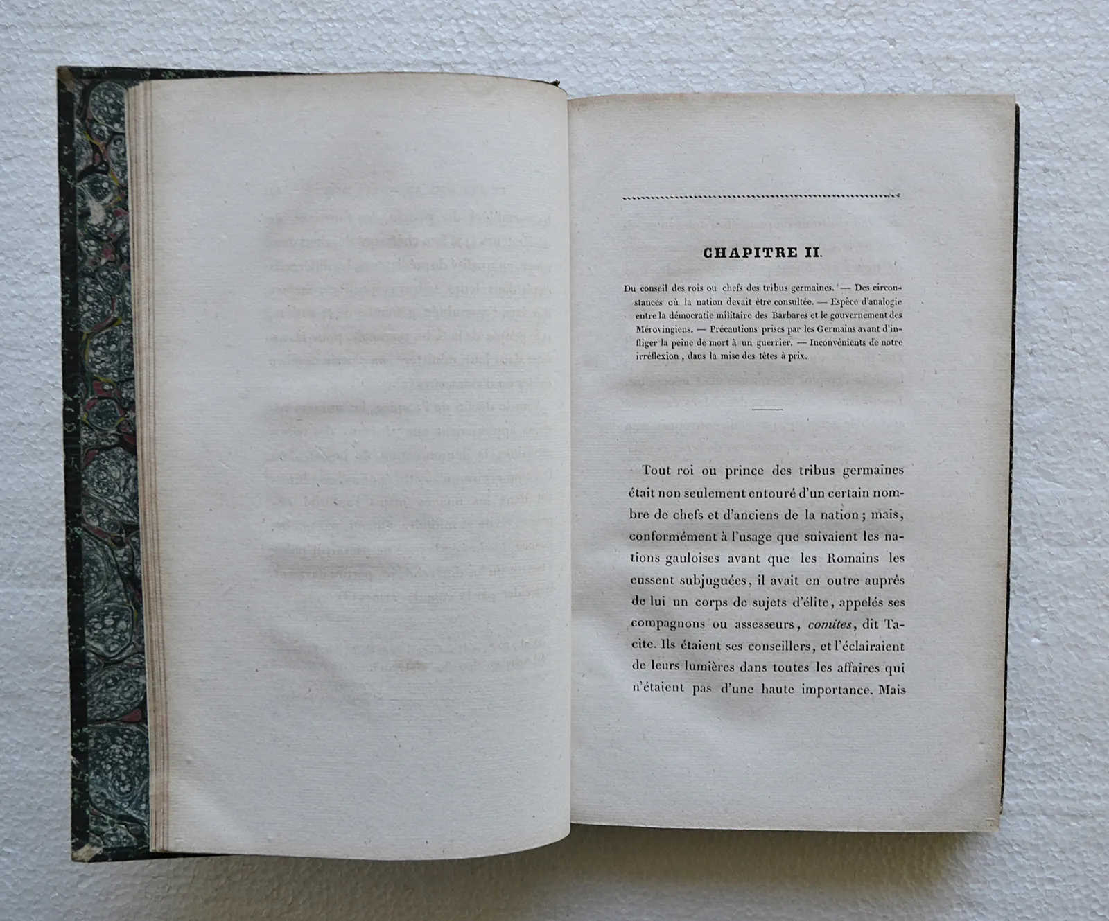 Trois volumes en demi-basane verte de l'époque, traitant de la barbarie, des lois et de la civilisation au Moyen Age, avec des comparaisons entre les mœurs des anciens et des modernes.