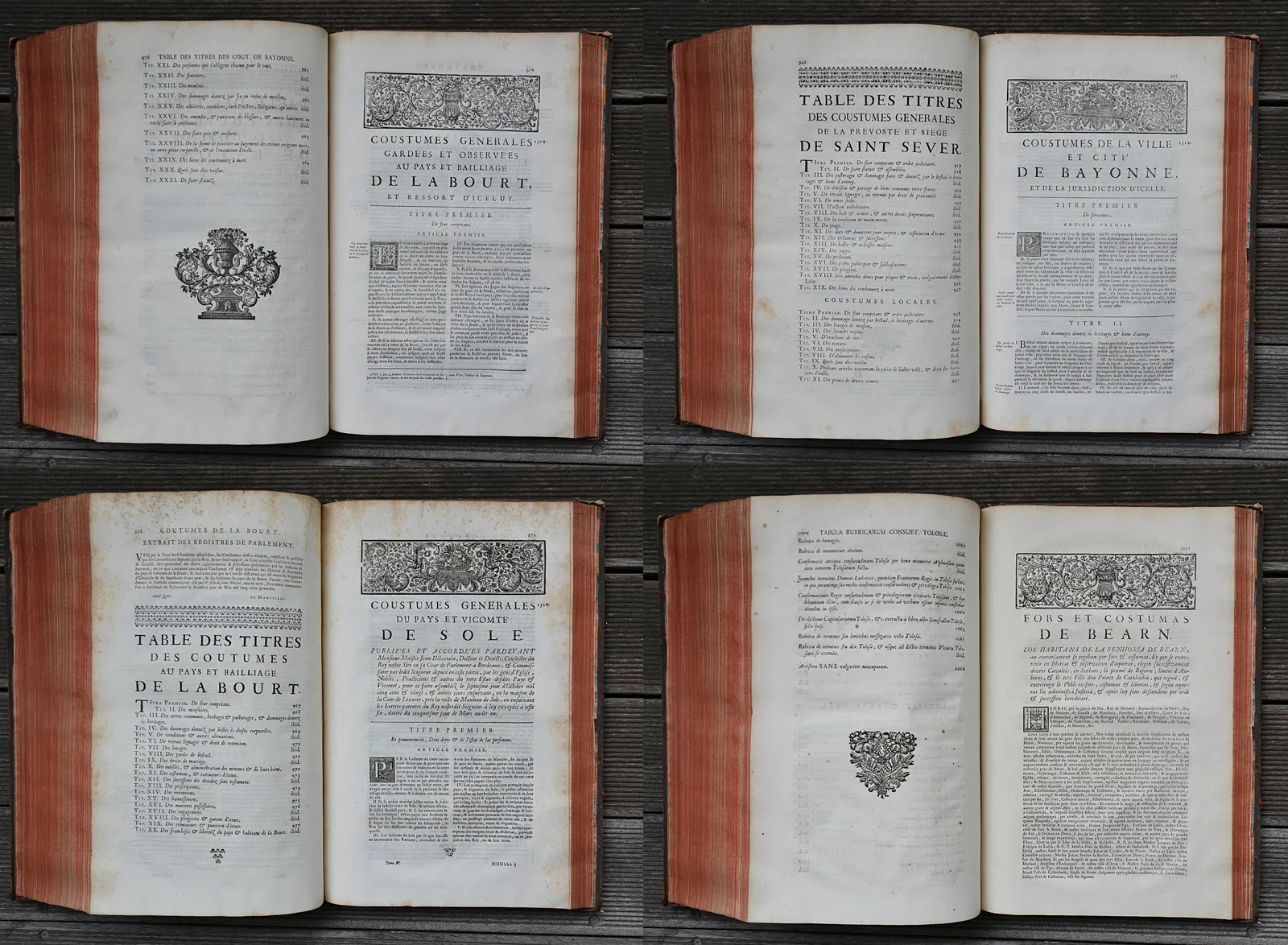 Monumental coutumier en quatre volumes in-folio, compilations de manuscrits et d'éditions originales des coutumes de France, notes inédites de Brodeau et Chauvelin.