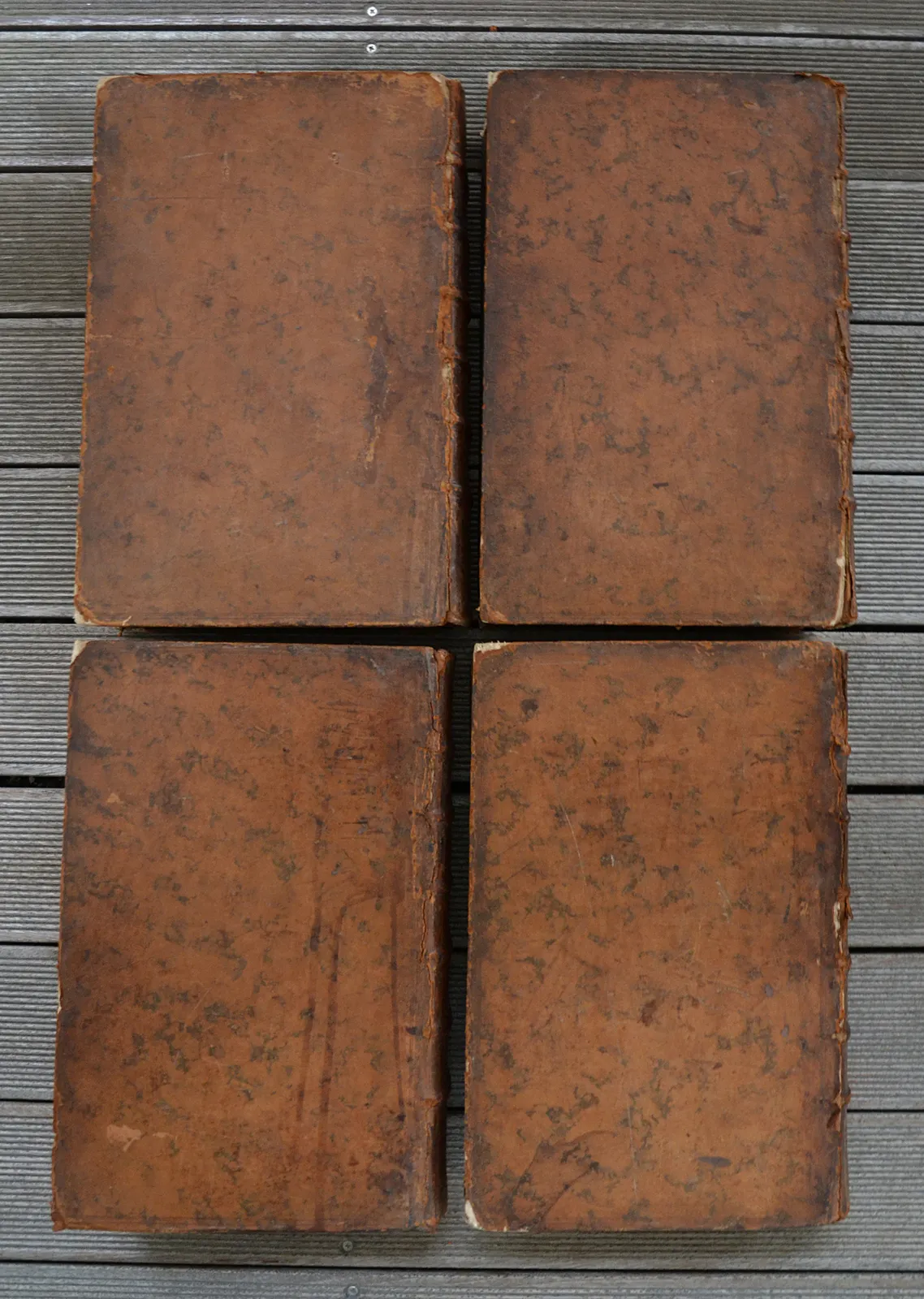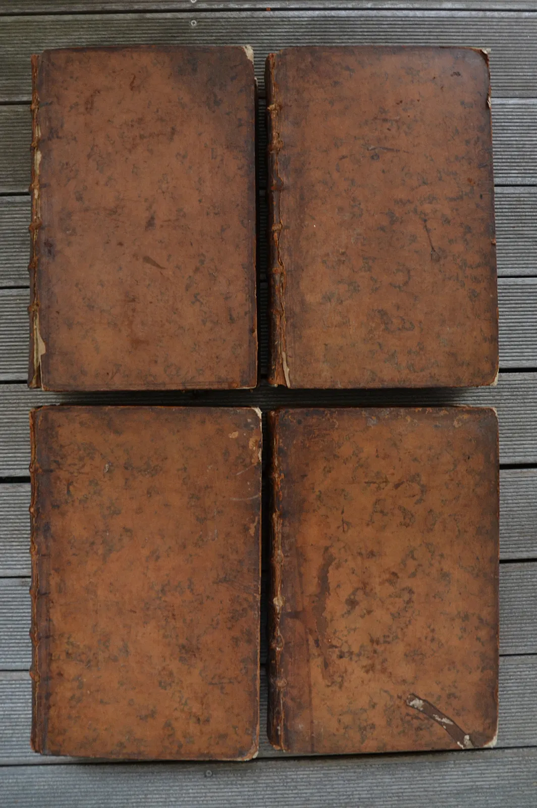 Reliures usagées : coiffes arasées ou absentes, mors fendus avec des décollements et pertes de cuir, épidermures et accrocs, coins éclatés, coupes frottées ; des rousseurs par endroits et des feuillets roussis.
