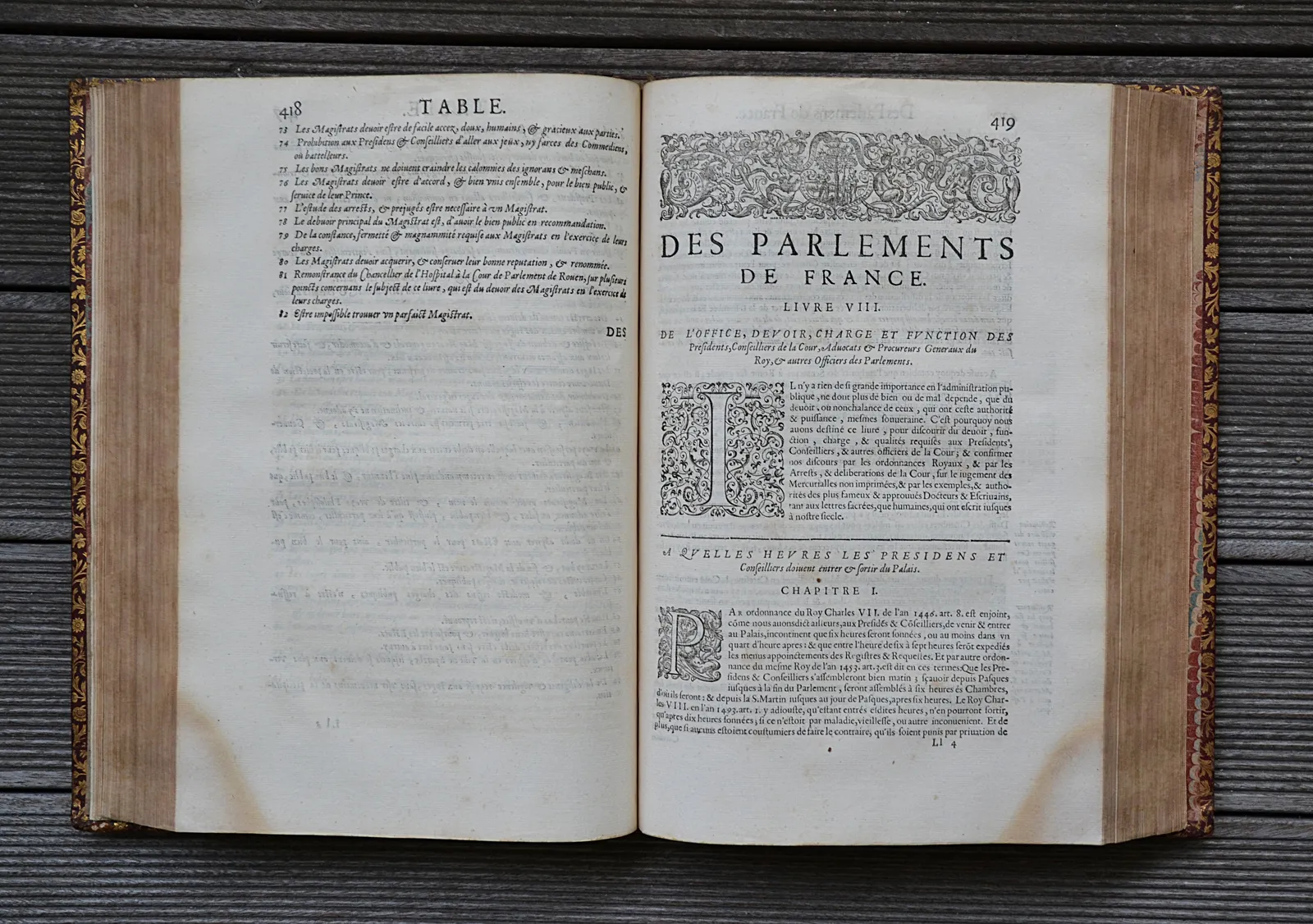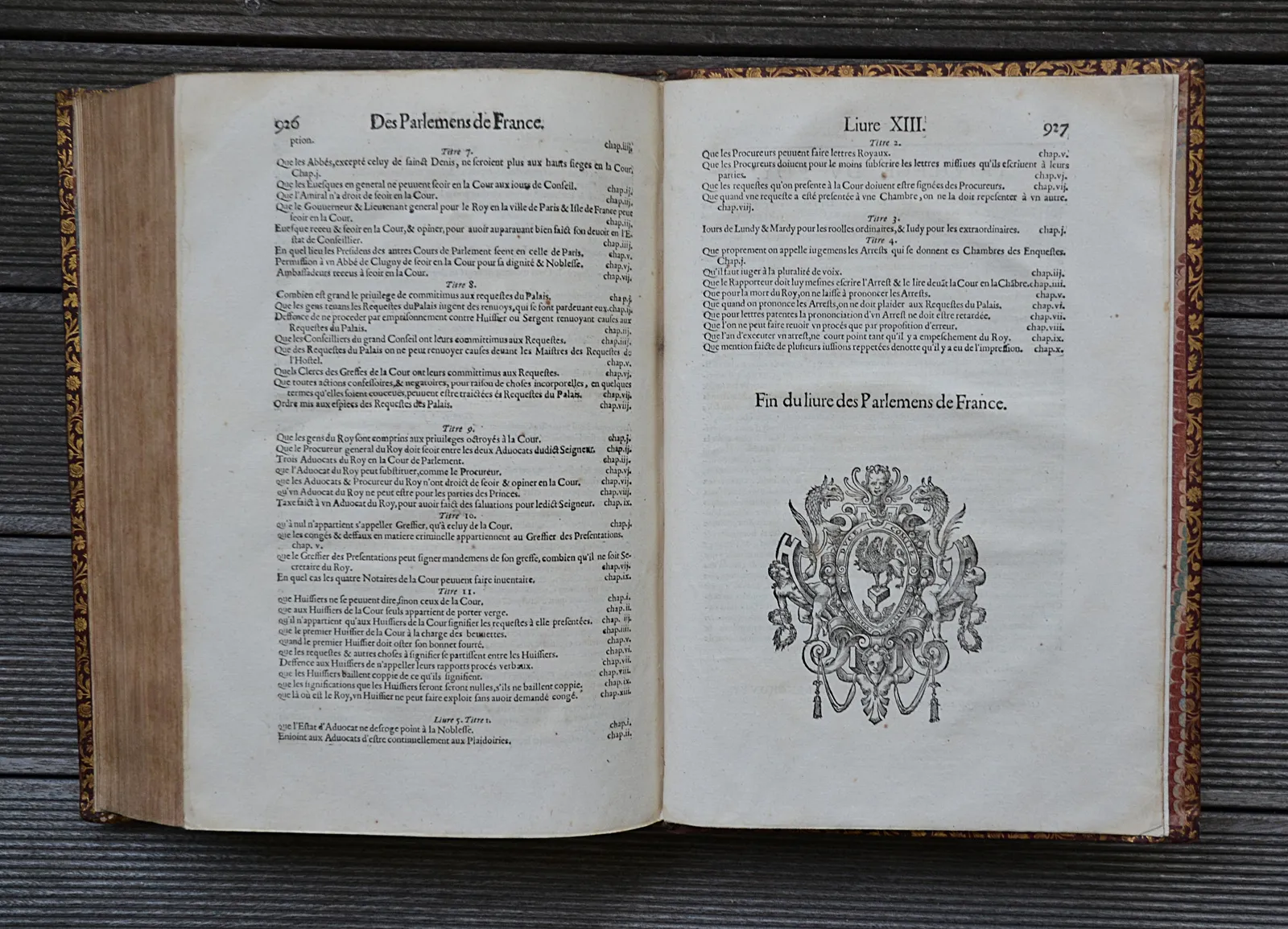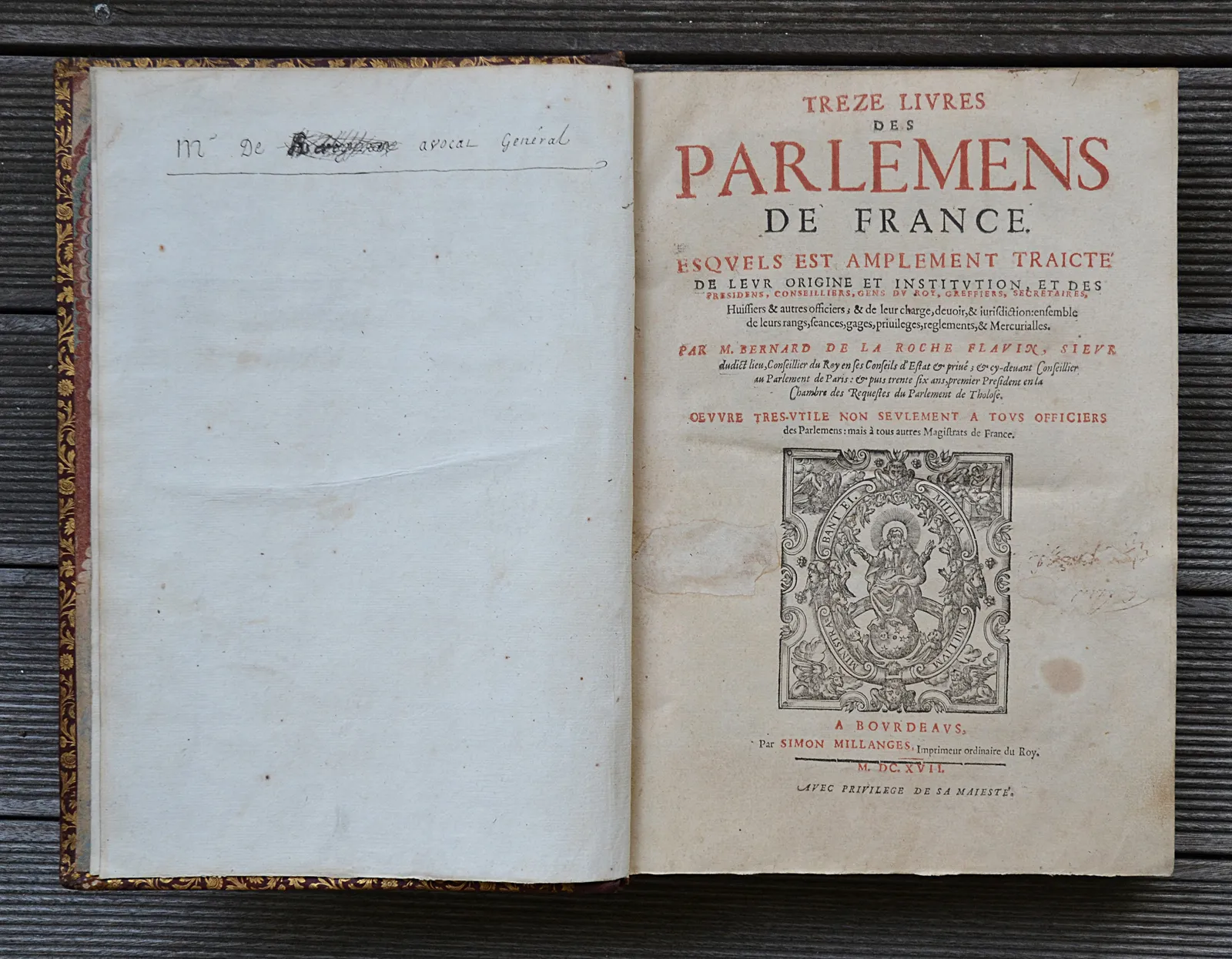 Treze livres des parlemens de France. Esquels est amplement traicté de leur origine et institution, et des présidens, conseillers, gens du Roy, greffiers, secrétaires, huissiers & autres officiers ; & de leur charge, devoir, & juridiction : ensemble de leurs rangs, séances, gages, privilèges, règlements & mercurialles. Œuvre très utile non seulement à tous officiers des parlemens, mais à tous autres magistrats de France.