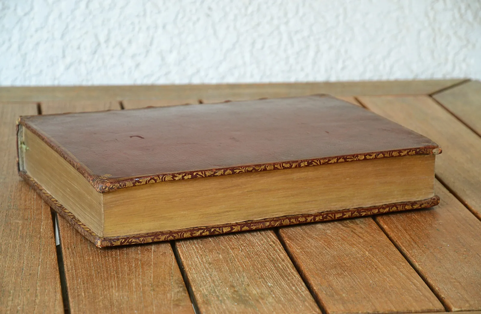 Un volume in-folio (25 x 35,5 cm.) de (12 ff.) – 927(1) pages ; maroquin rouge, triple filet doré sur les plats avec un « L » entrelacé et couronné dans les angles, dos à six nerfs richement orné, fer à l’oiseau en queue, roulette dorée sur les coupes et à l’intérieur, tranches dorées (reliure de l’époque).