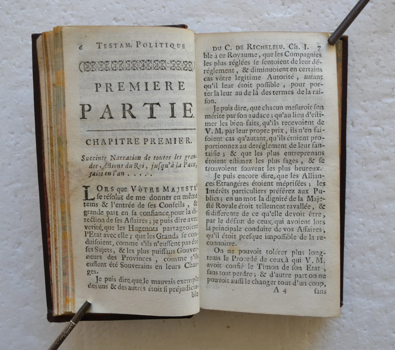 Édition originale de cet ouvrage dont l’authenticité fut notamment mise en doute par Voltaire. L’œuvre est désormais attribuée à Paul Hay du Chastelet, dont le père, avait été l’homme de confiance de Richelieu. Ce Testament apporte des renseignements d’une grande précision sur l’administration française sous Louis XIII, qu’il s’agisse du commerce, de la guerre ou de la justice.