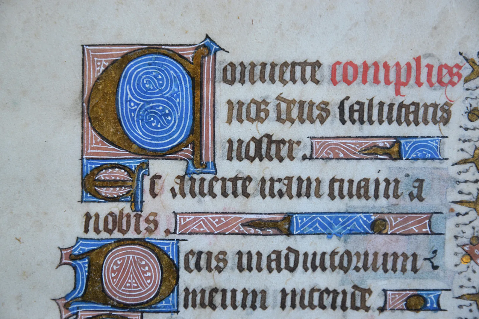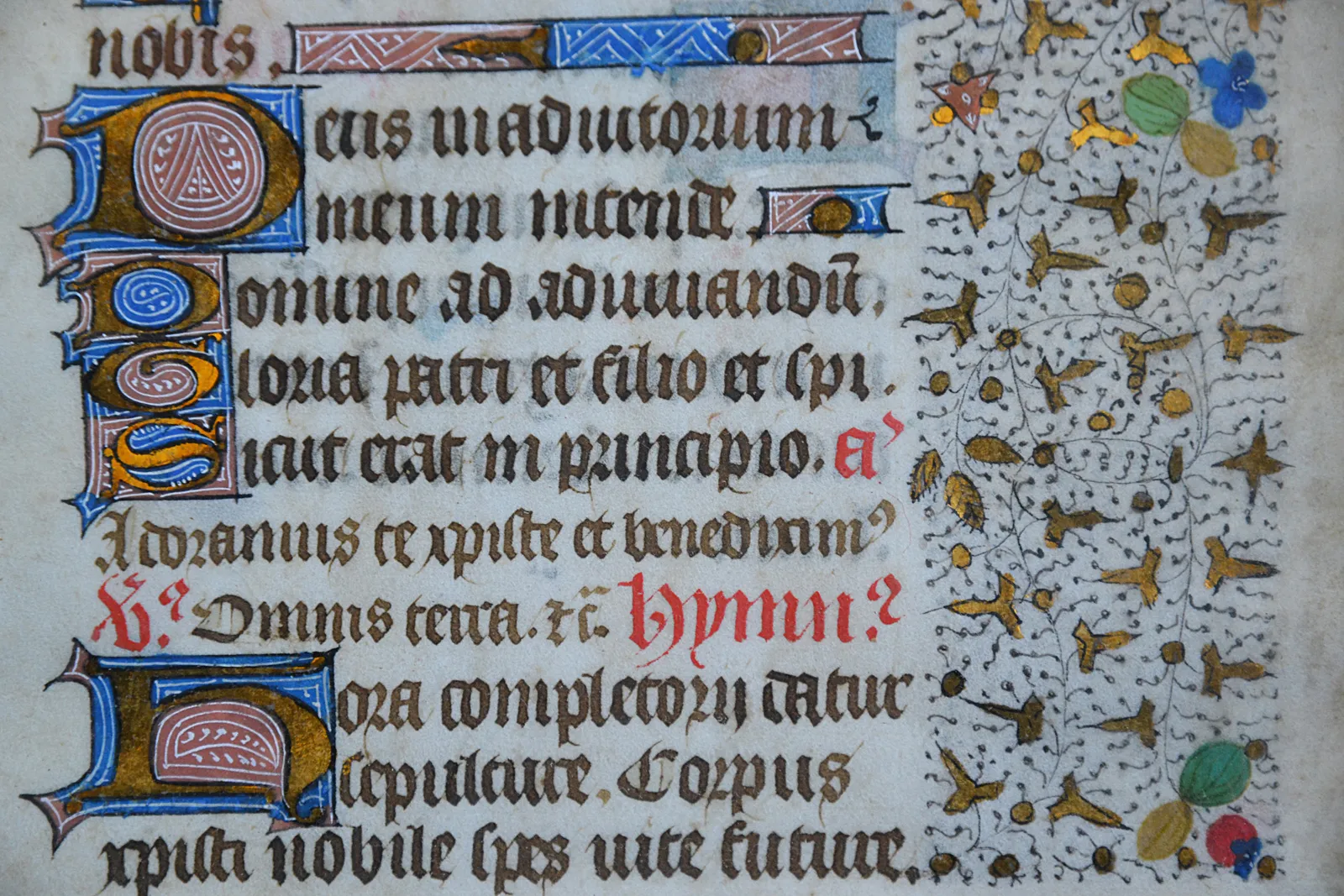 Texte en latin de 15 lignes à l’encre sépia et rouge. Sept capitales en or sur fond bleu et rouge filigrané de blanc.