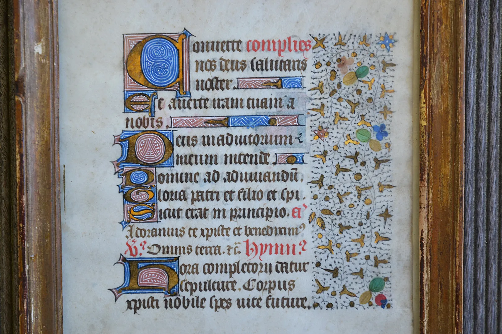 Un feuillet enluminé (17,5 x 22 cm. avec le cadre), extrait d’un Livre d’Heures manuscrit sur vélin, du XV° siècle ou du début du XVI° siècle. Cadre ancien en bois doré.