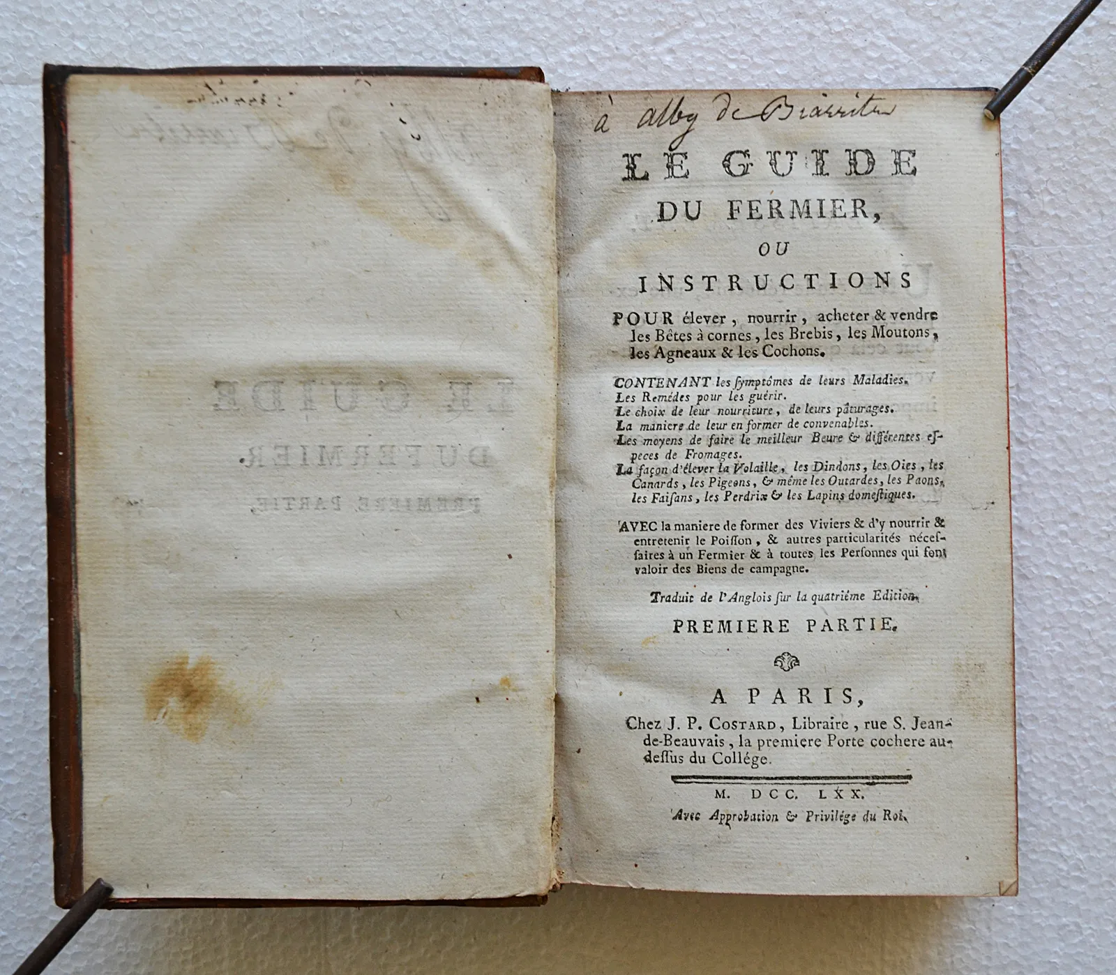 Le guide du fermier, ou instructions pour élever, nourrir, acheter & vendre les bêtes à cornes, les brebis, les moutons, les agneaux & les cochons. Contenant les symptômes de leurs maladies / Les remèdes pour les guérir / Le choix de leur nourriture, de leurs pâturages / La manière de faire le meilleur beurre & différentes espèces de fromages / La façon d’élever la volaille, les dindons, les oies, les canards (…). Traduit de l’anglais sur la quatrième édition.