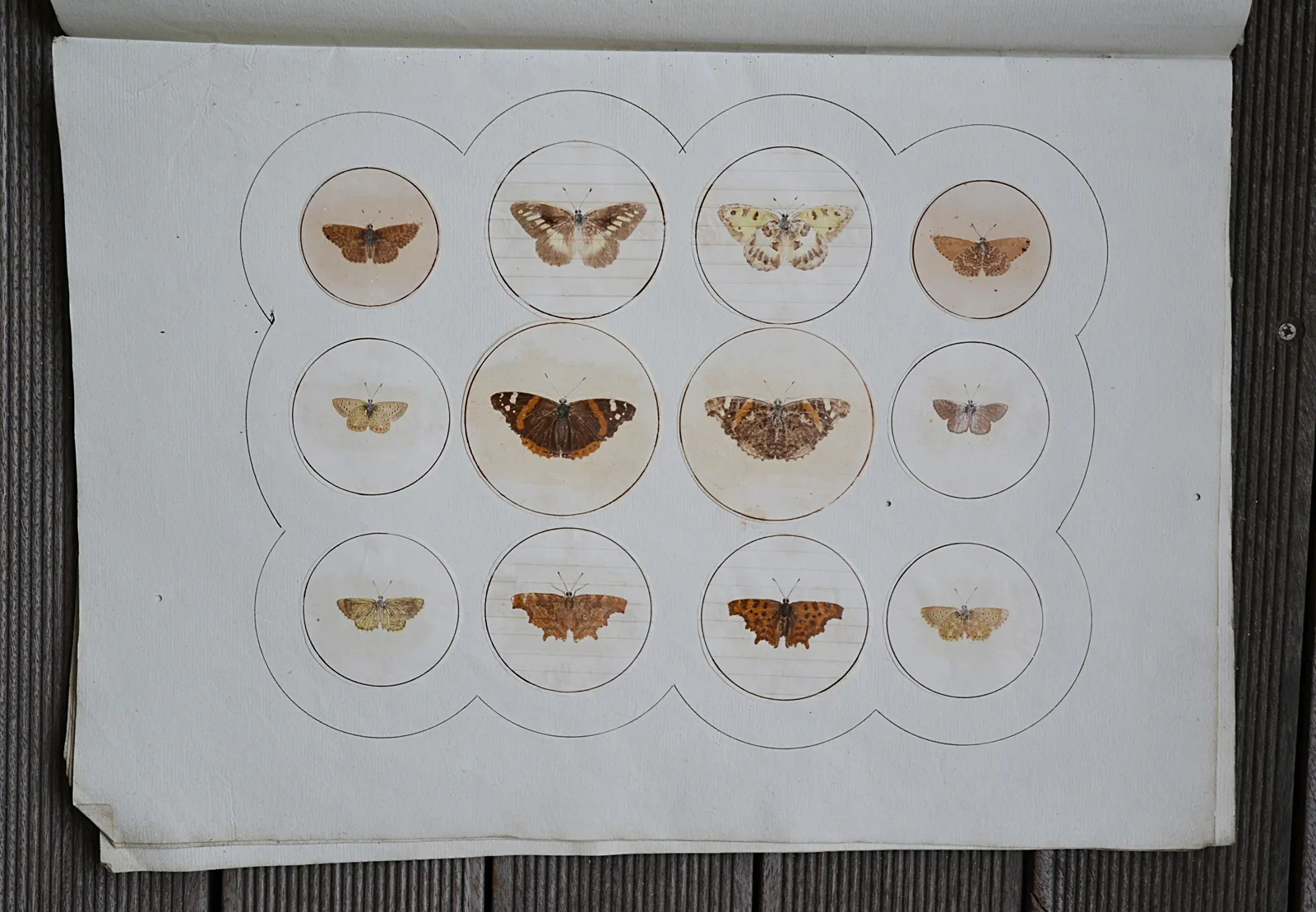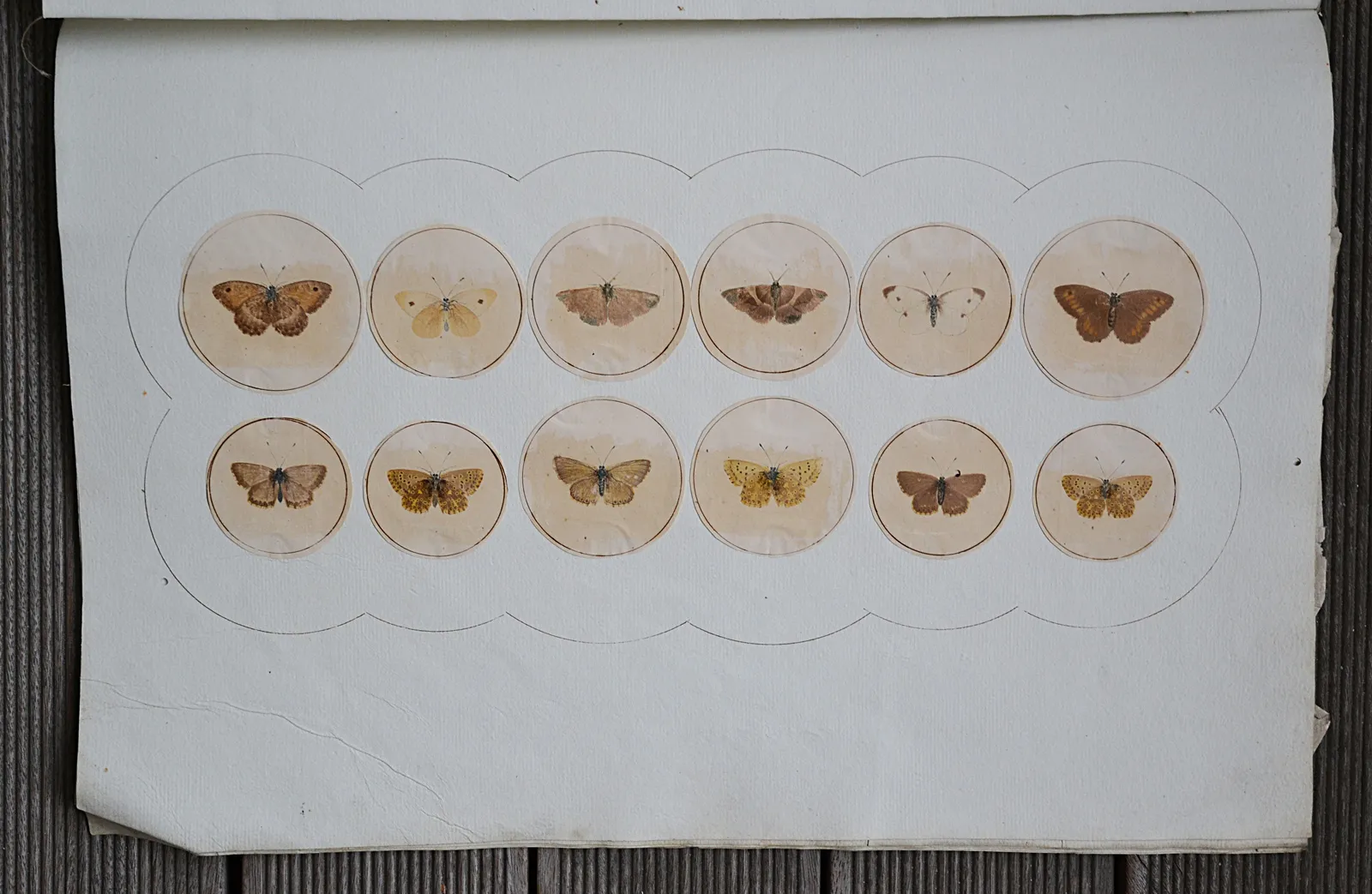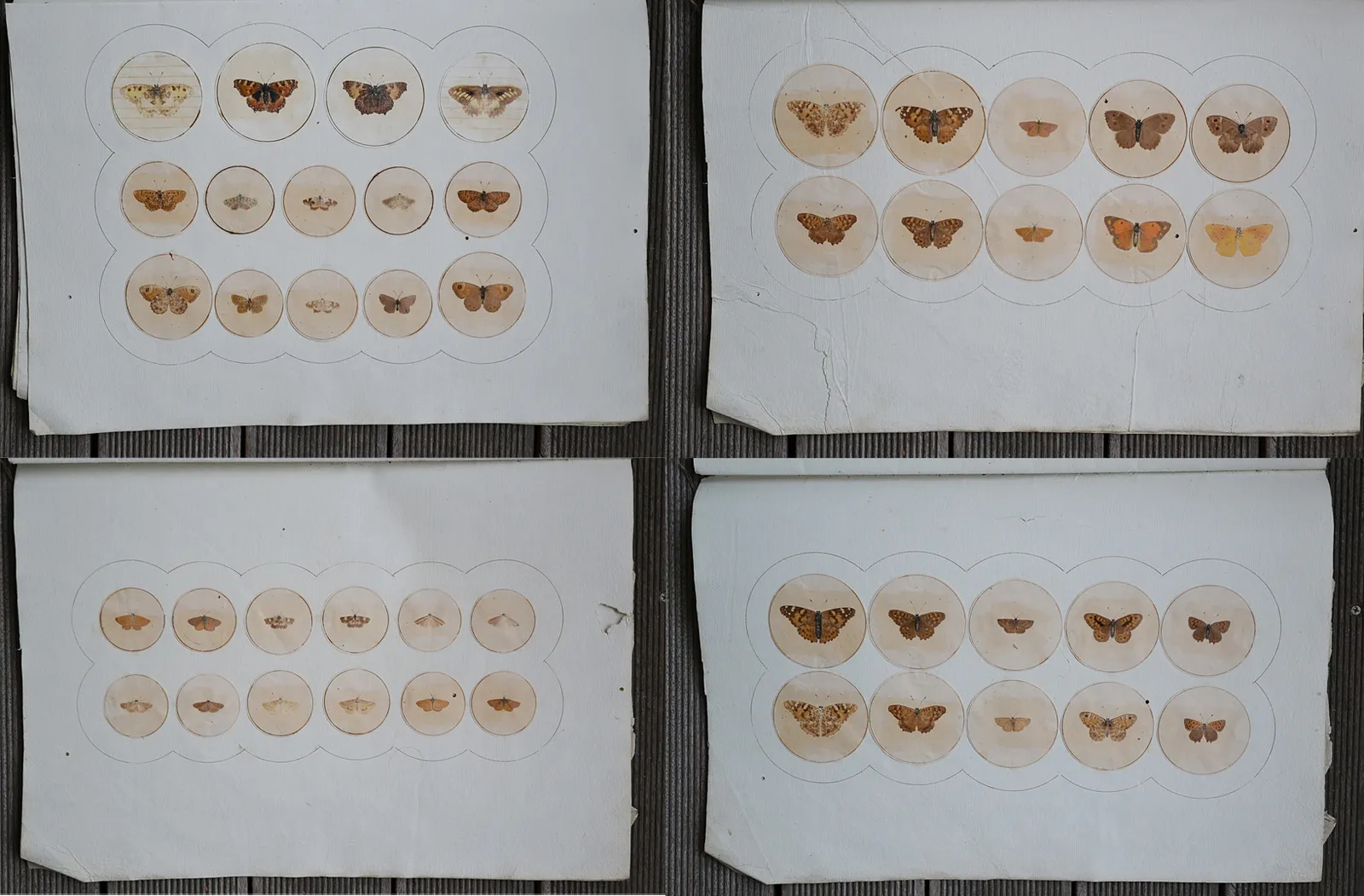 Ces treize planches sont illustrées de 154 papillons dessinés et imprimés sur des papiers du XIX° siècle découpés en rond et collés sur des feuillets en papier vergé épais (quelques déchirures avec pertes de papier et trois trous de vers ; pertes d’écailles et de couleurs par endroits).