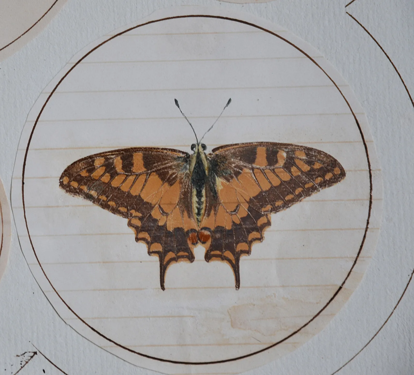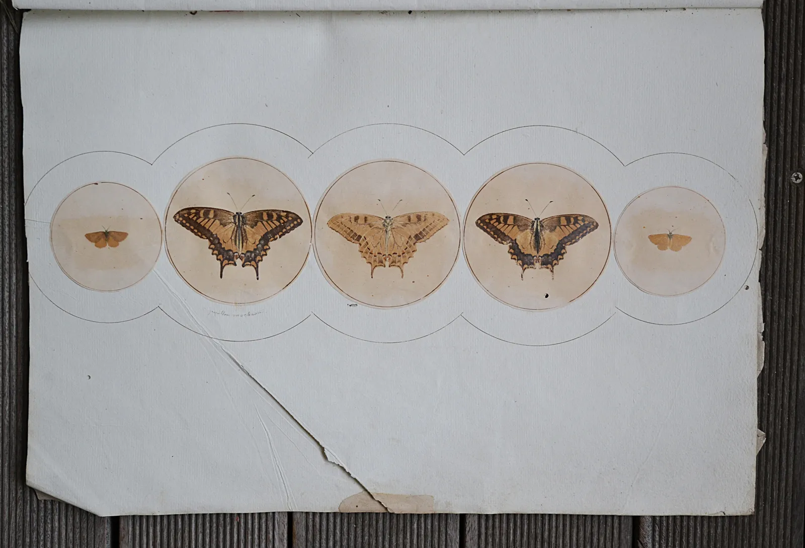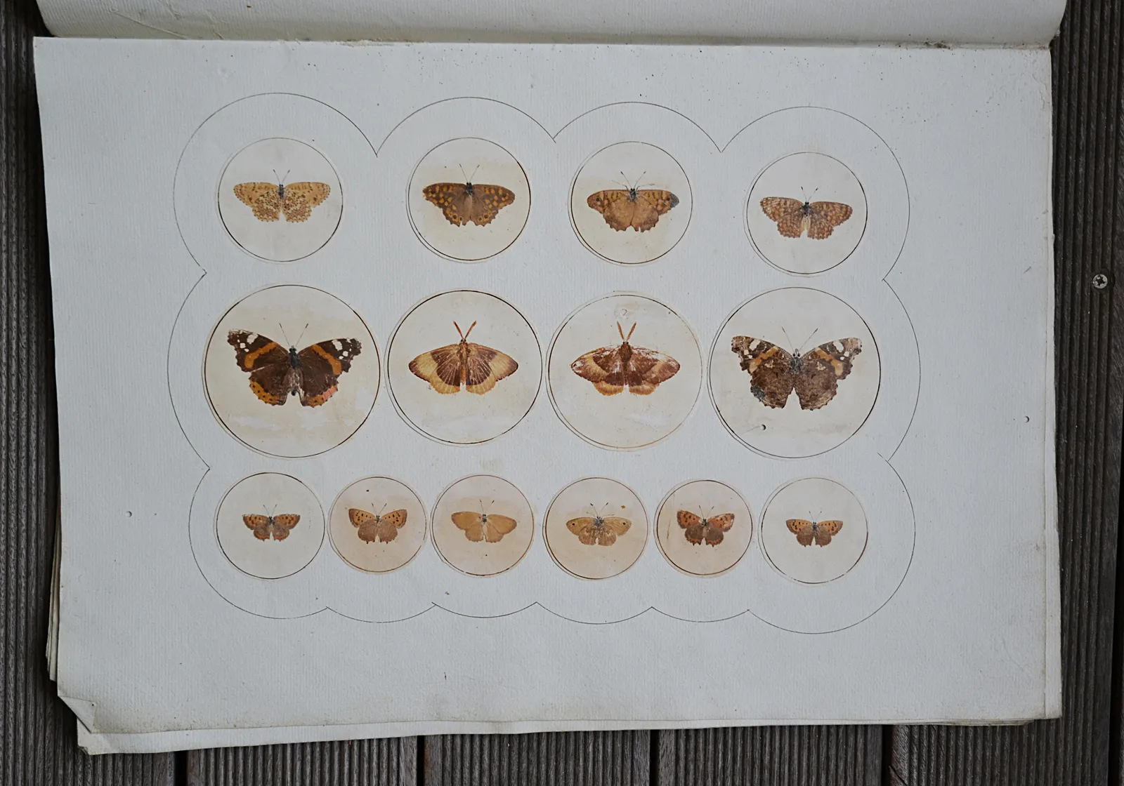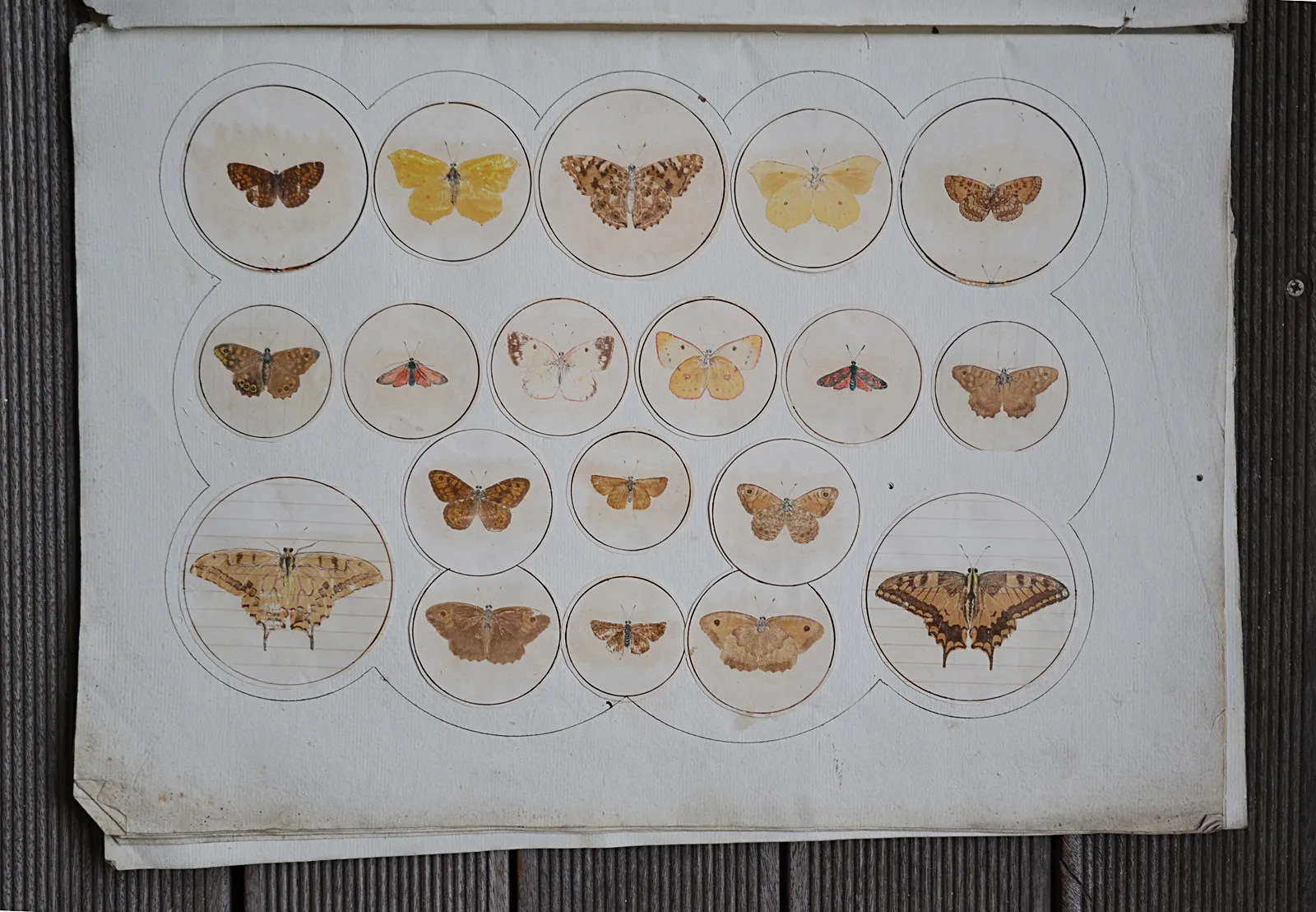 Ces treize planches sont illustrées de 154 papillons dessinés et imprimés sur des papiers du XIX° siècle découpés en rond et collés sur des feuillets en papier vergé épais (quelques déchirures avec pertes de papier et trois trous de vers ; pertes d’écailles et de couleurs par endroits).