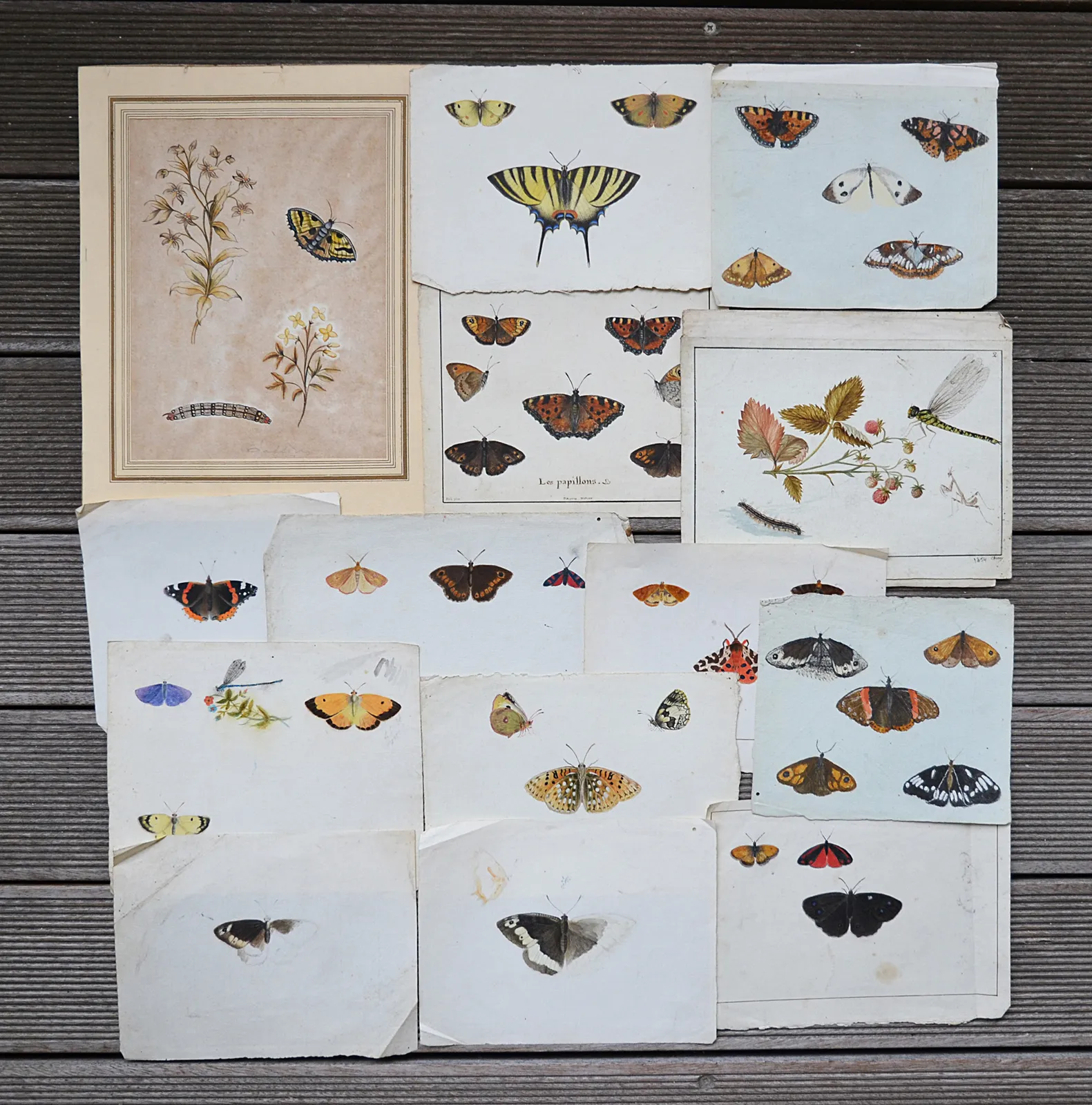 Treize feuillets volants in-8 (plus ou moins 24 x 30 cm) et un au format in-4 (16 x 20cm.) représentant 45 insectes aquarellés (40 papillons, 2 libellules, 2 chenilles et une mante religieuse).