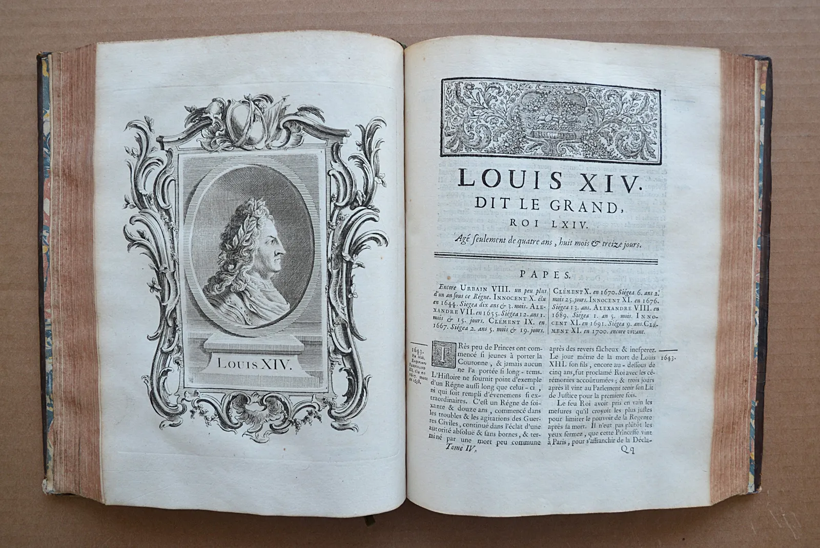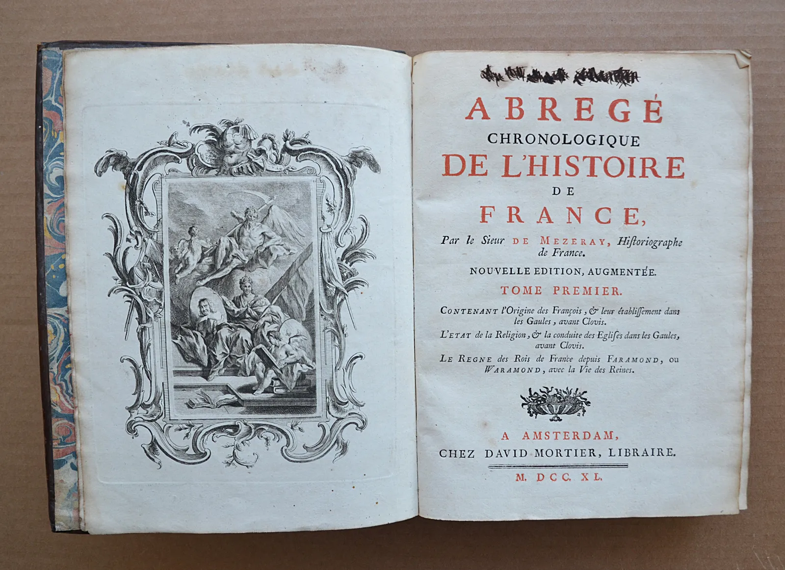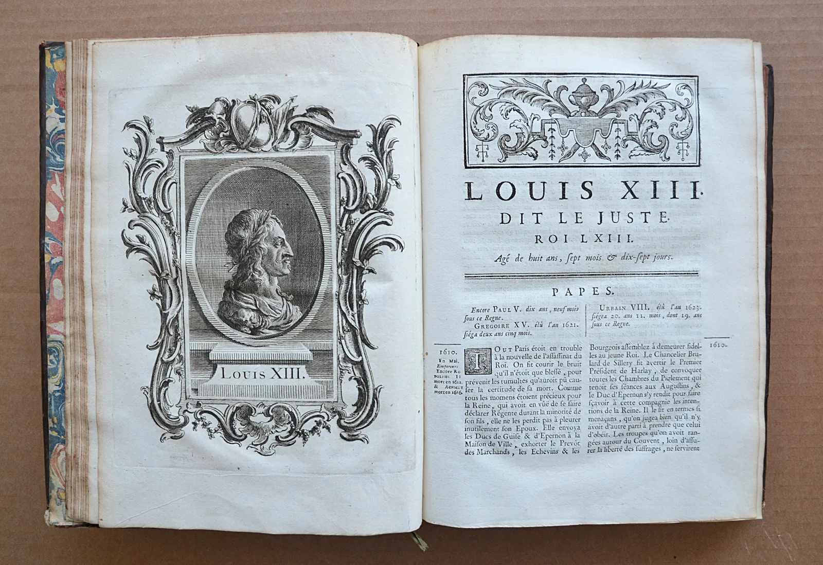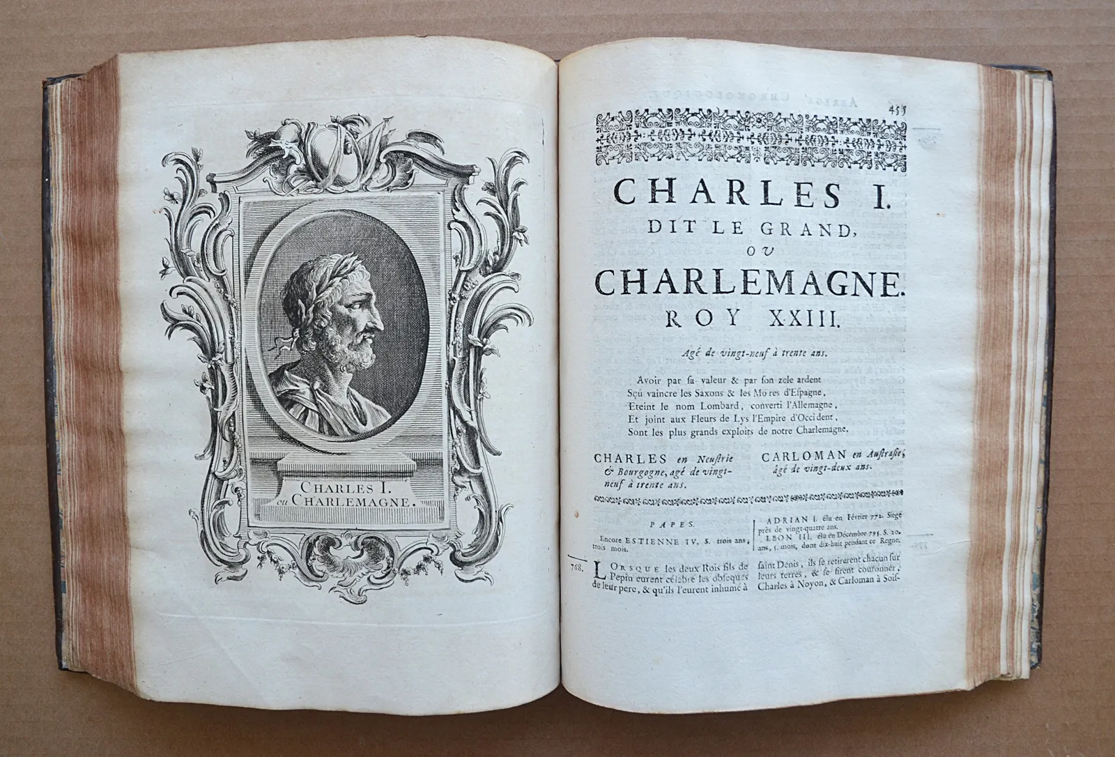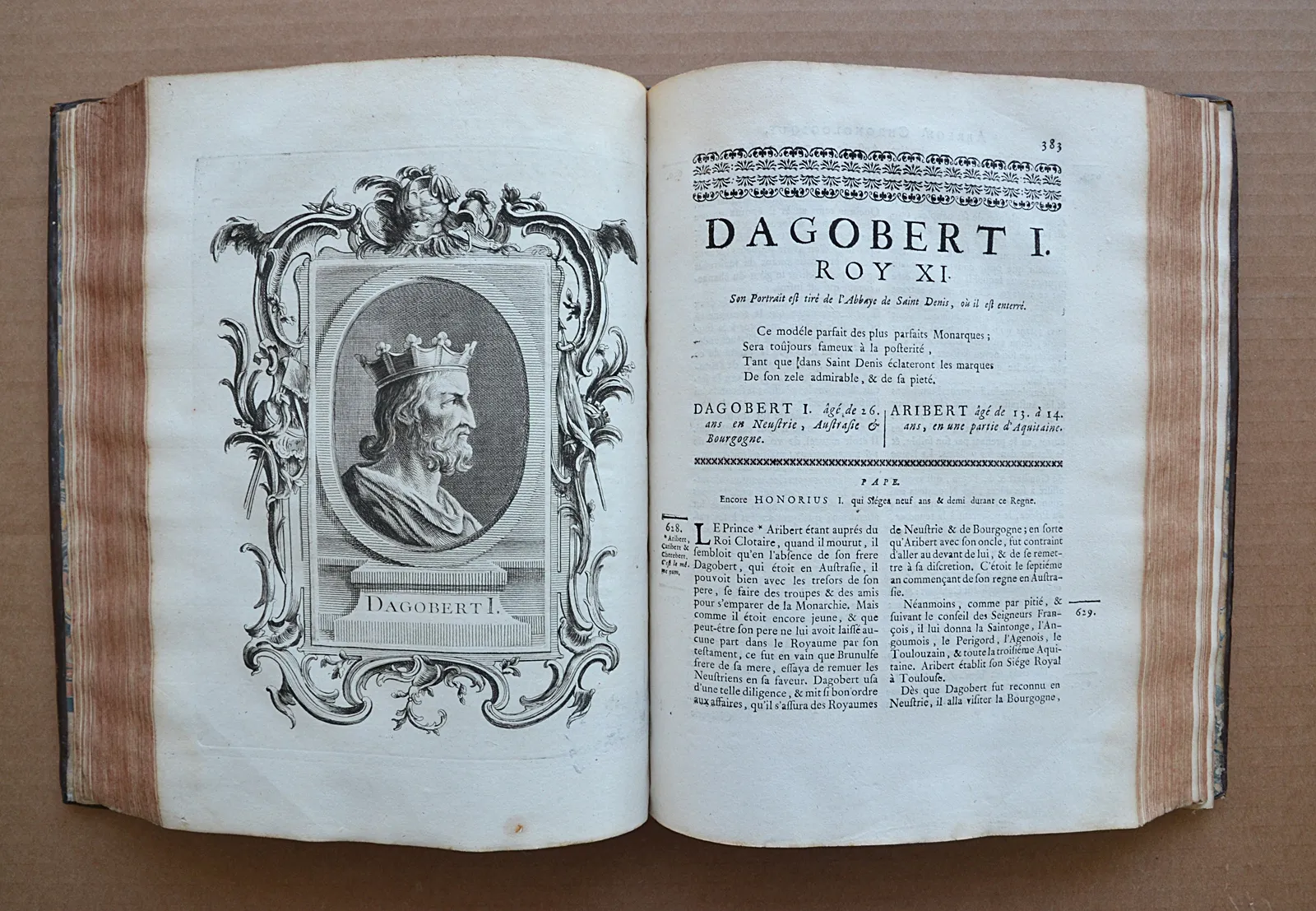 Édition de 1740 illustrée d'un frontispice allégorique et de 65 portraits de rois de France. Saluée par Brunet comme une des meilleures histoires de France.