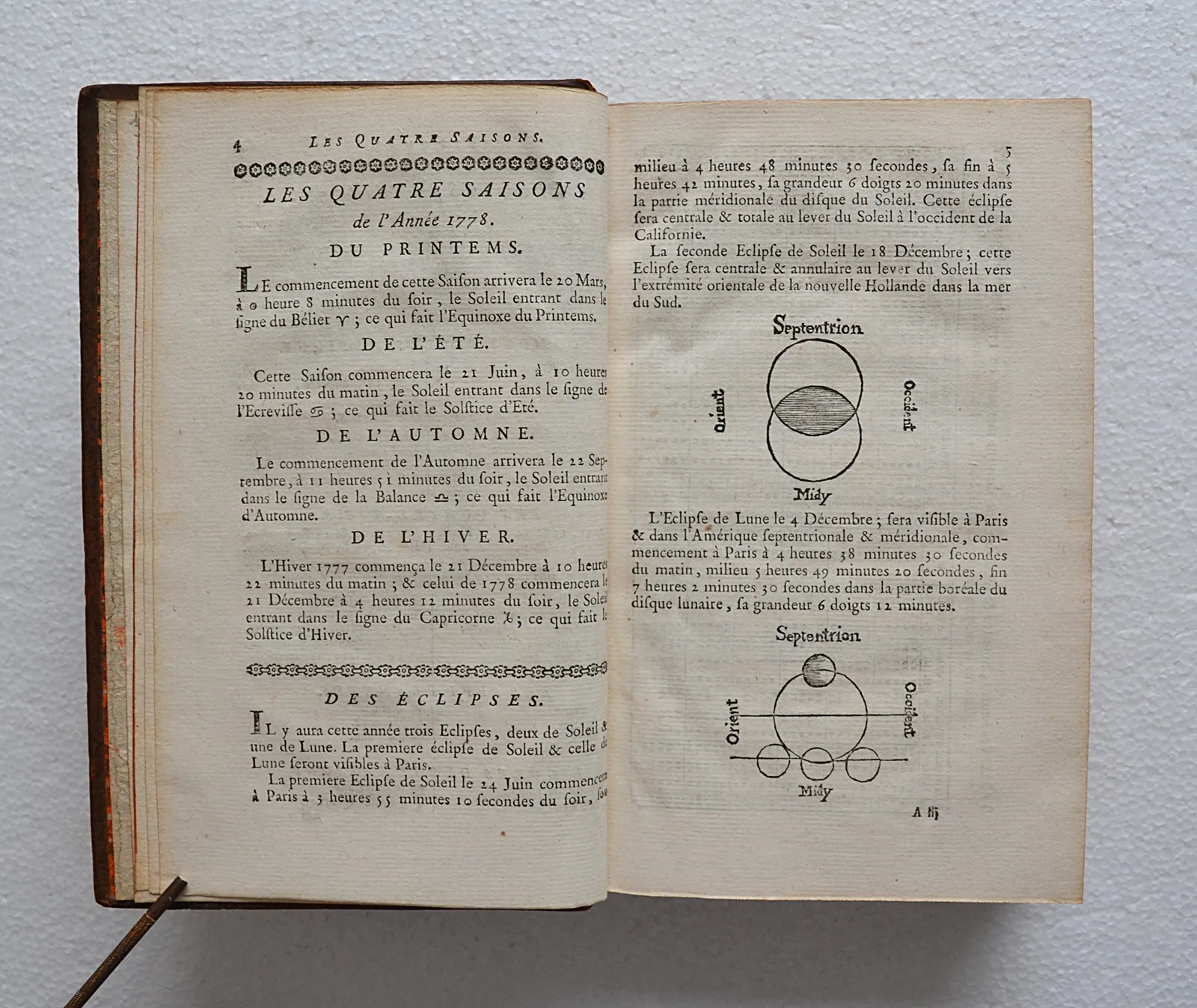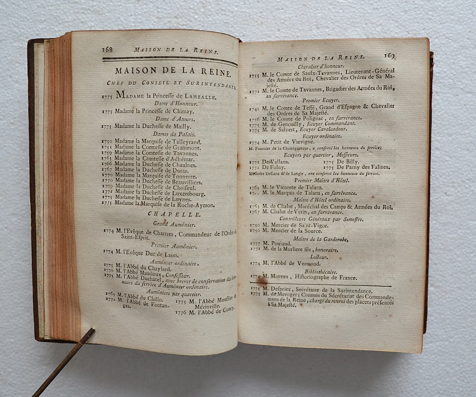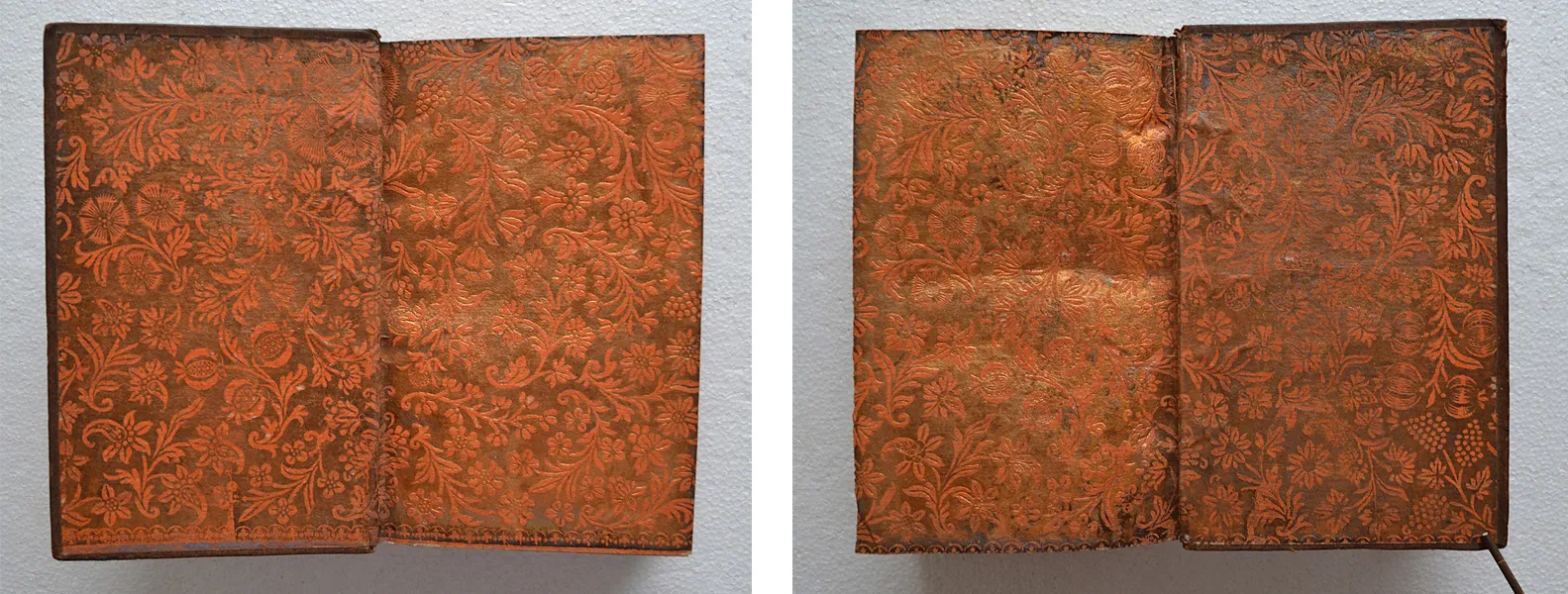 Exemplaire de 1778 en veau fauve orné de fleurs de lys, avec de jolies pages de garde sur papier dominoté à motifs floraux orangés sur fond doré.