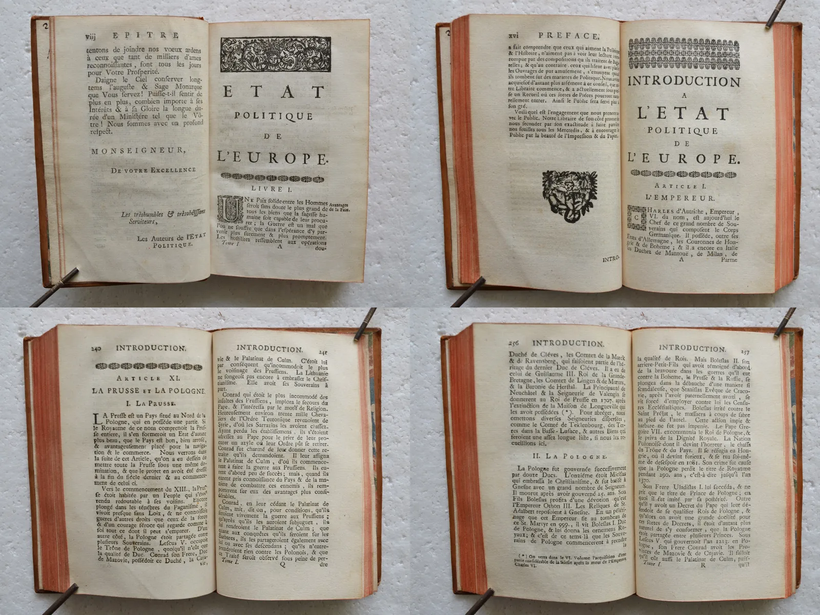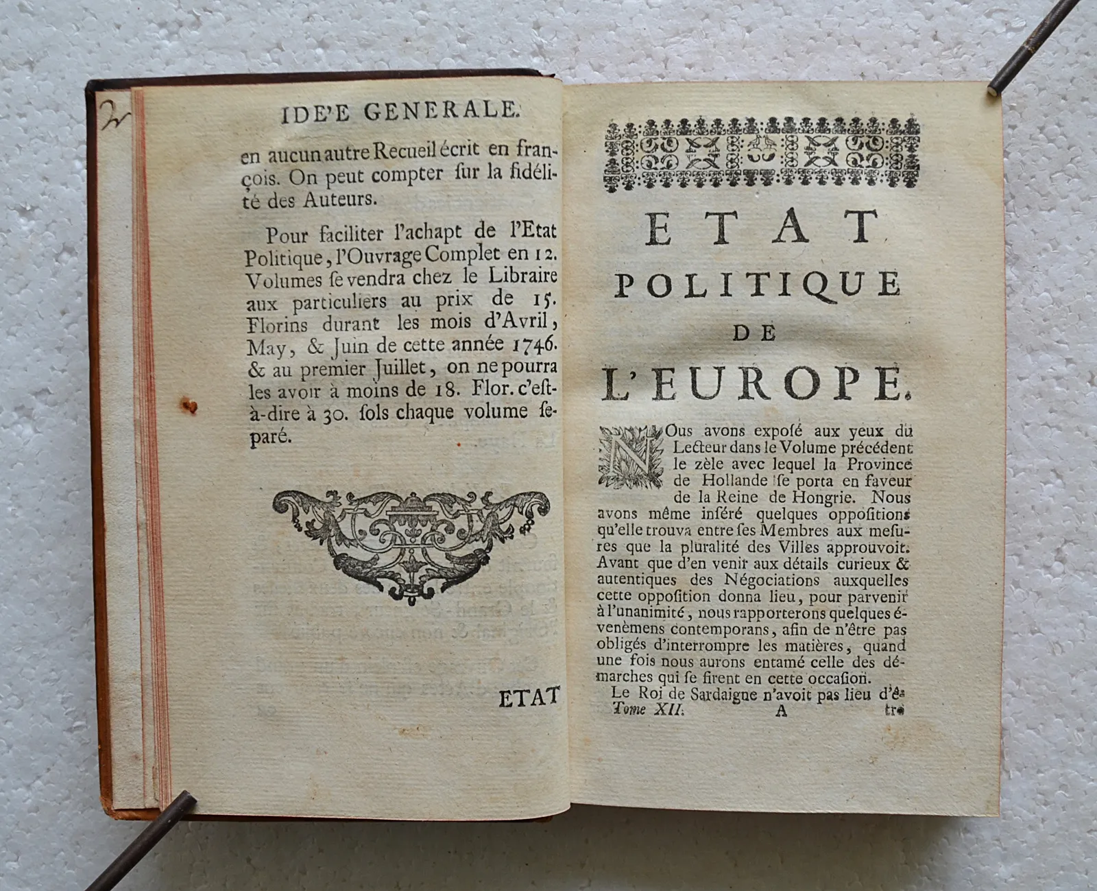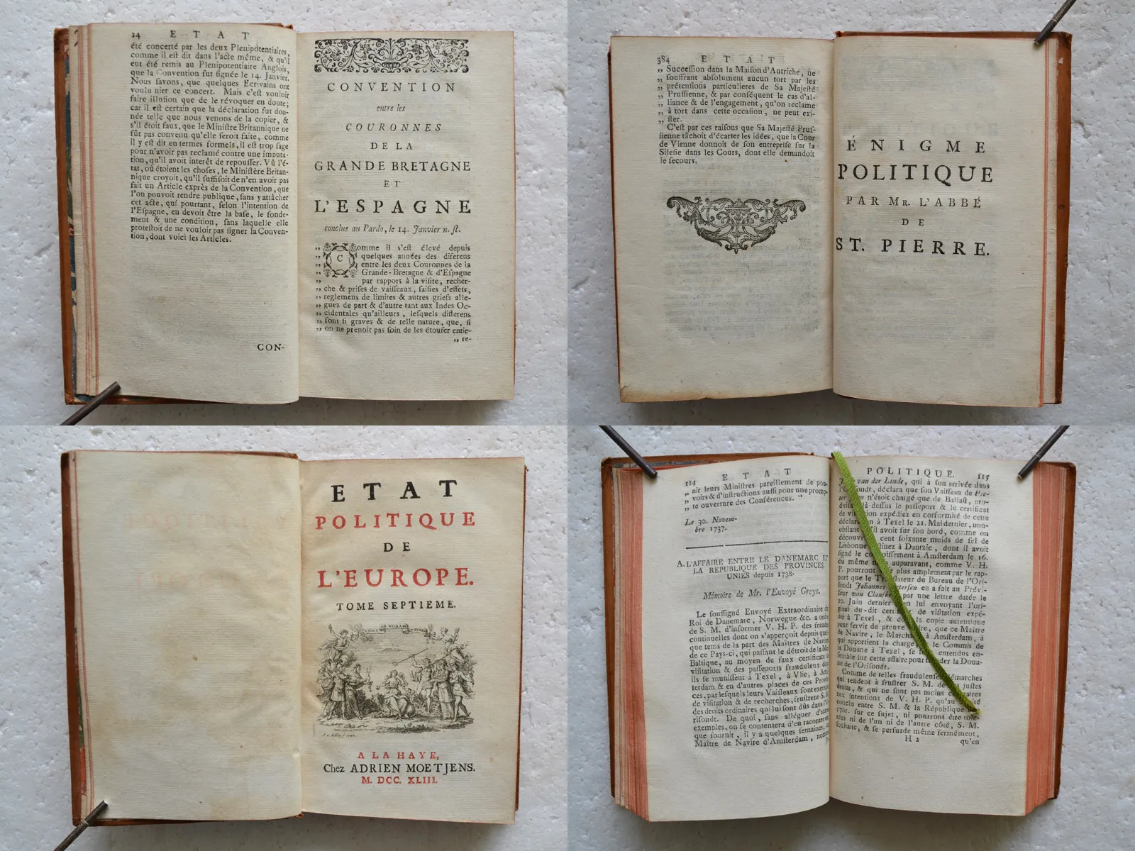 Cette rarissime revue historique est composée de documents divers sur les affaires diplomatiques et militaires des années 1735-1743, concernant notamment le traité de Vienne de 1738 entre l’Autriche et la France mettant fin entre ces deux pays à la guerre de succession de la Pologne, il comporte plusieurs dispositions dynastiques qui modifièrent la carte politique de l’Europe et assurèrent un nouvel équilibre entre les deux puissances. L’ouvrage traite également de la guerre de succession d’Autriche (1740-1748), d’un plan du traité de paix entre l’Angleterre et l’Espagne, ainsi que de la pacification de l’Empereur d’Autriche & de la Russie avec la cour ottomane.
