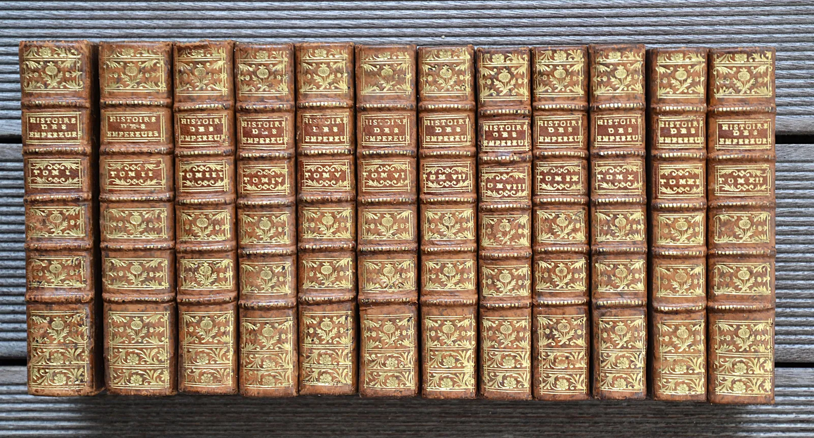 Douze volumes in-12 (10,5 x 17,5 cm.), veau fauve marbré glacé, filet à froid sur les plats, dos à nerfs ornés, filet doré sur les coupes, tranches rouges (reliures de l’époque).