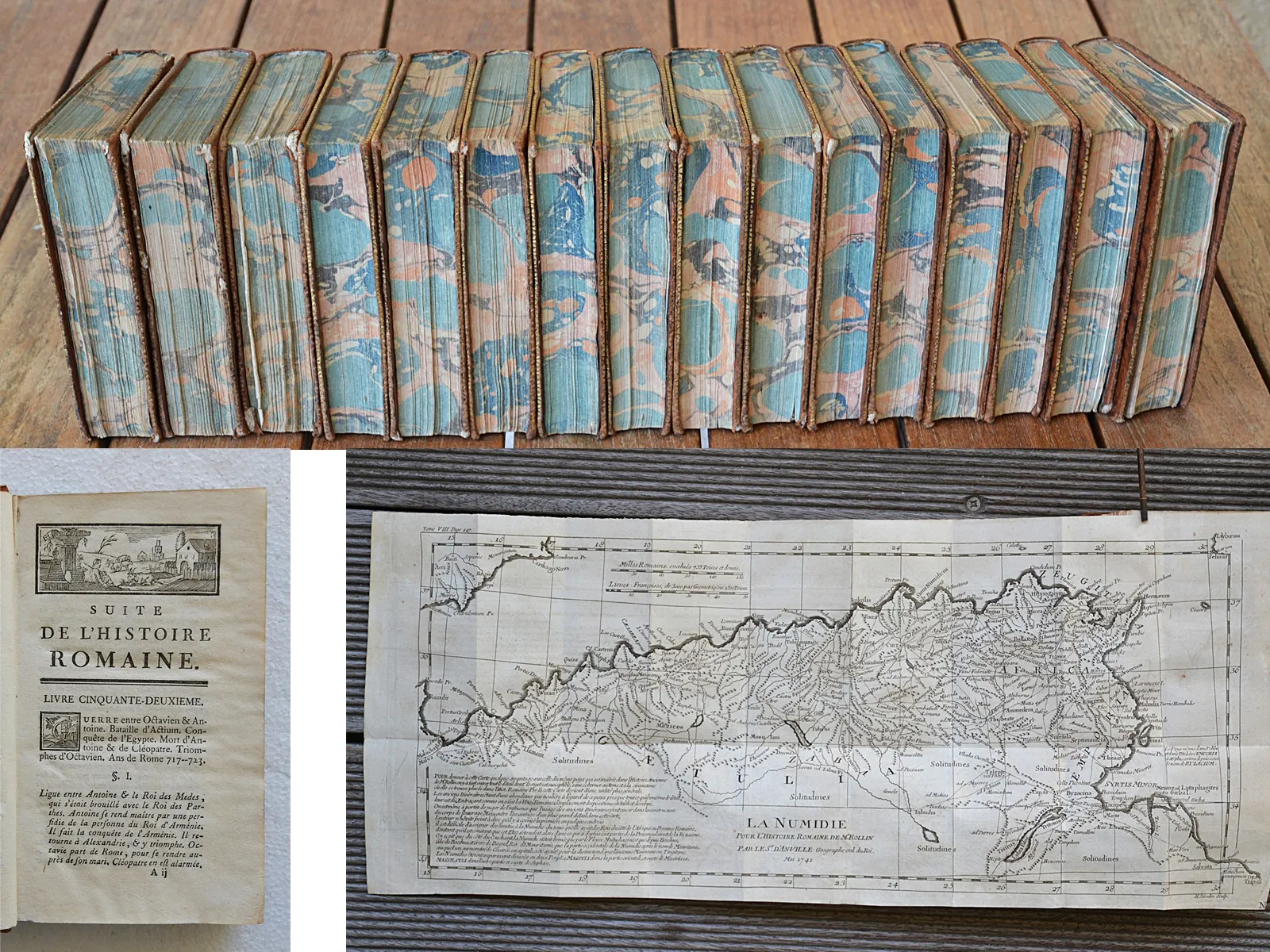 Seize volumes en basane fauve marbrée de l'époque, illustrés d'un portrait-frontispice, de 11 cartes dépliantes, d'un plan de Rome et d'une planche du combat naval d'Ecnome.