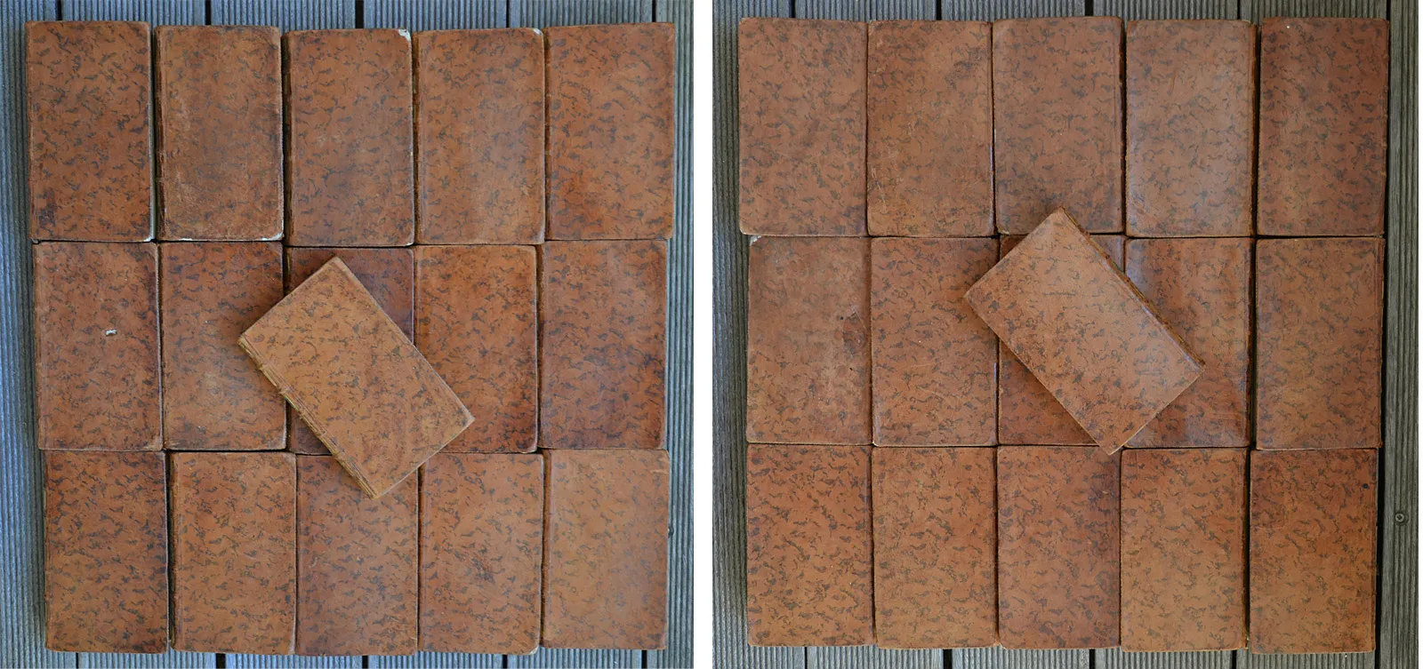 Seize volumes in-12 (10,5 x 17 cm.), basane fauve marbrée, dos à nerfs ornés, pièces de titre et de tomaison en veau blond et vert, roulette dorée sur les coupes, tranches marbrées (reliure de l’époque).