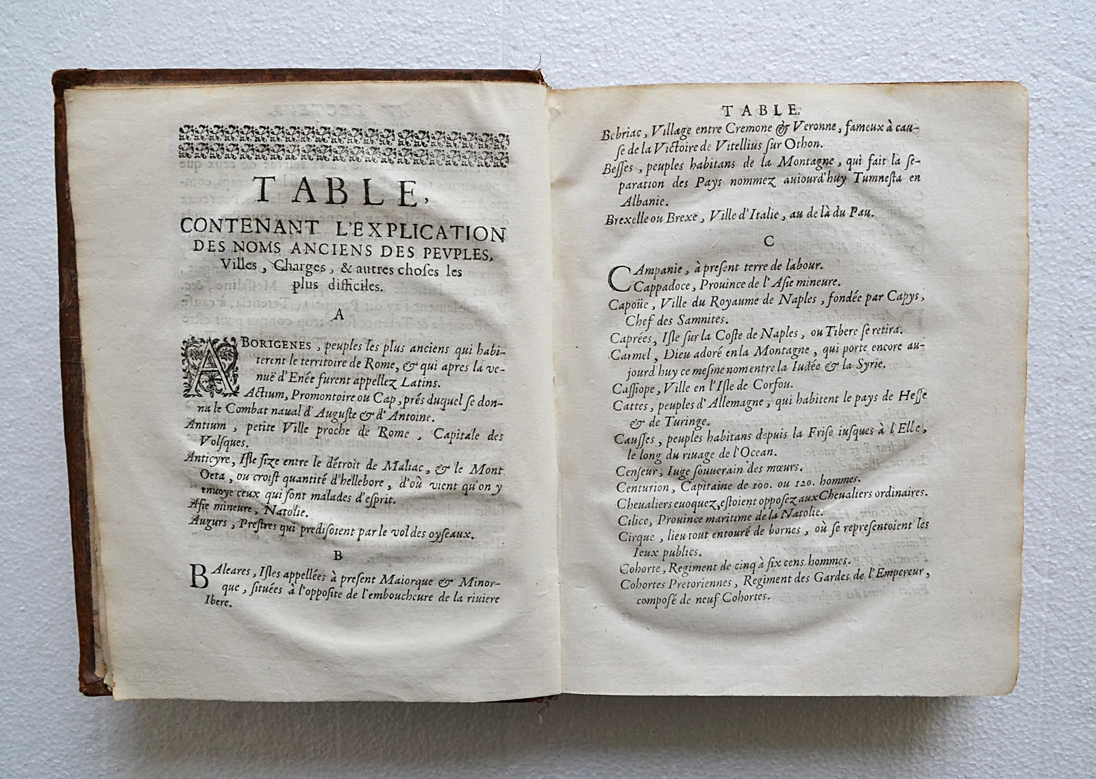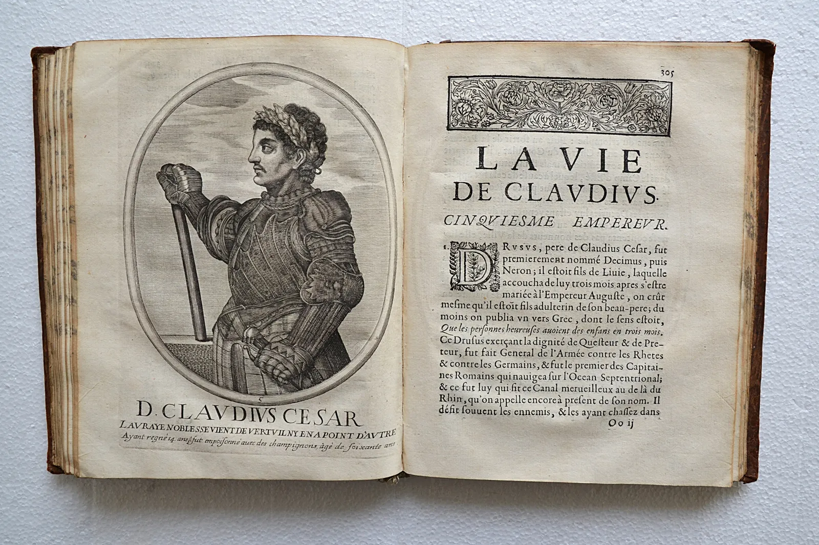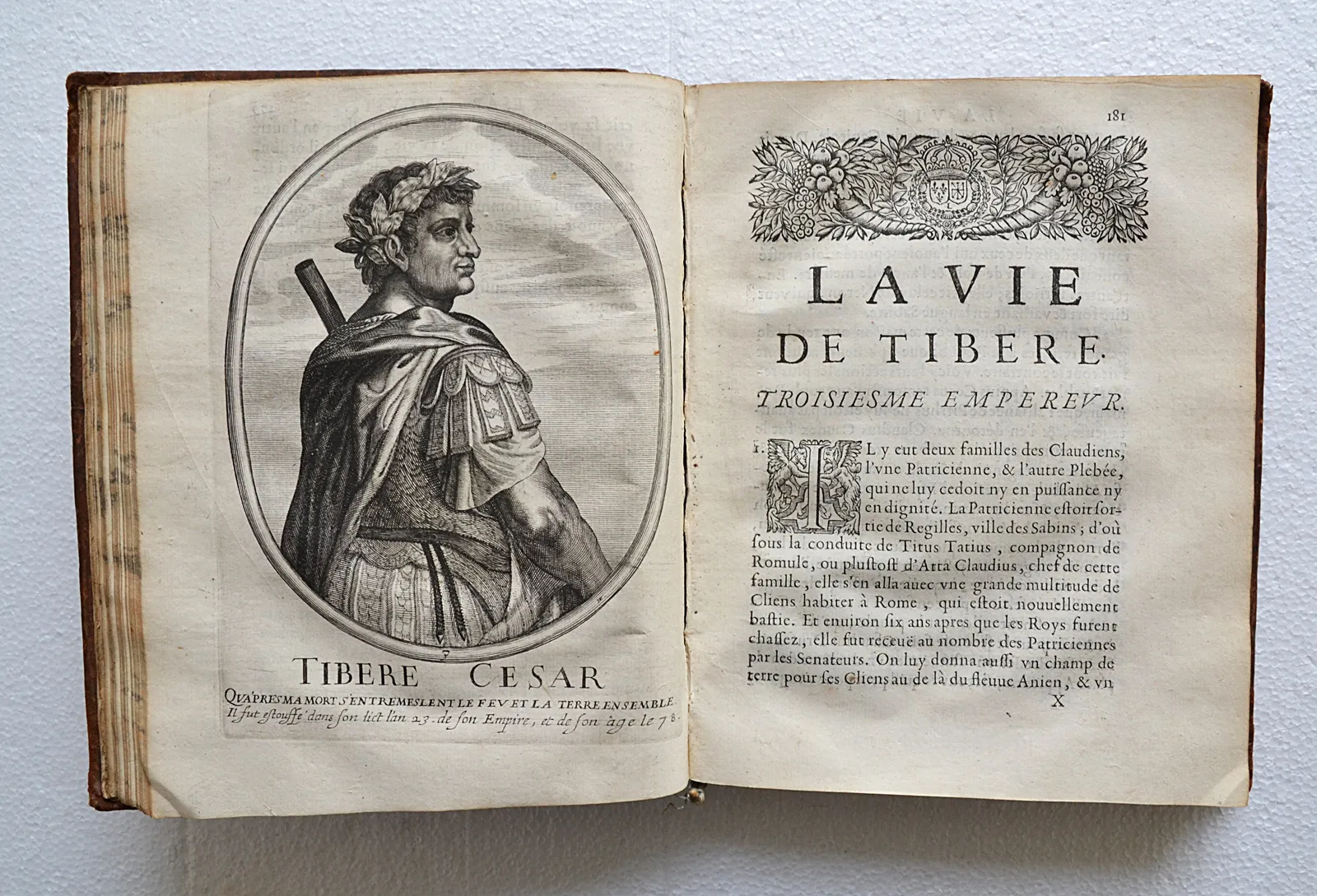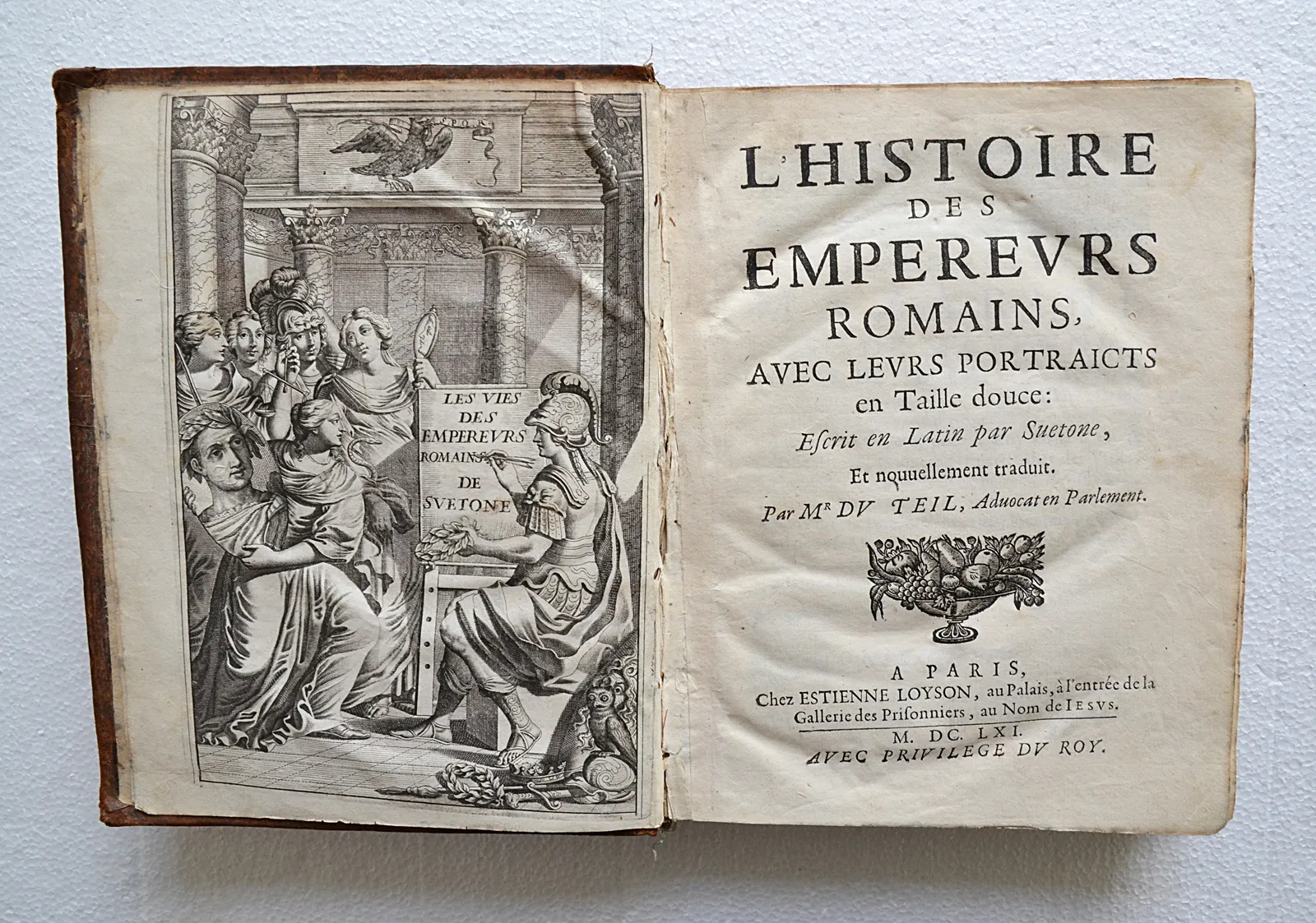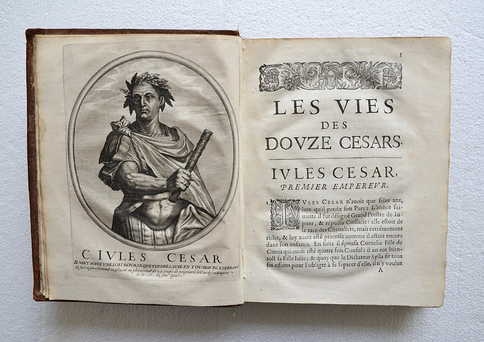Très rare édition originale de la traduction des Vies des douze Césars par Bernard Du Teil, illustrée d’un frontispice allégorique et de douze magnifiques portraits gravés en taille-douce.