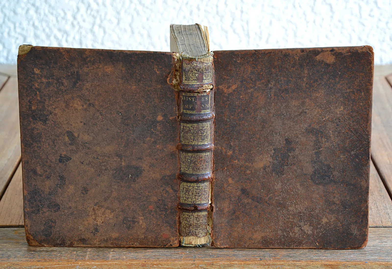 Reliure usagée : épidermures, accrocs avec perte de cuir sur le dos & les coiffes, une charnière et deux mors fendus.