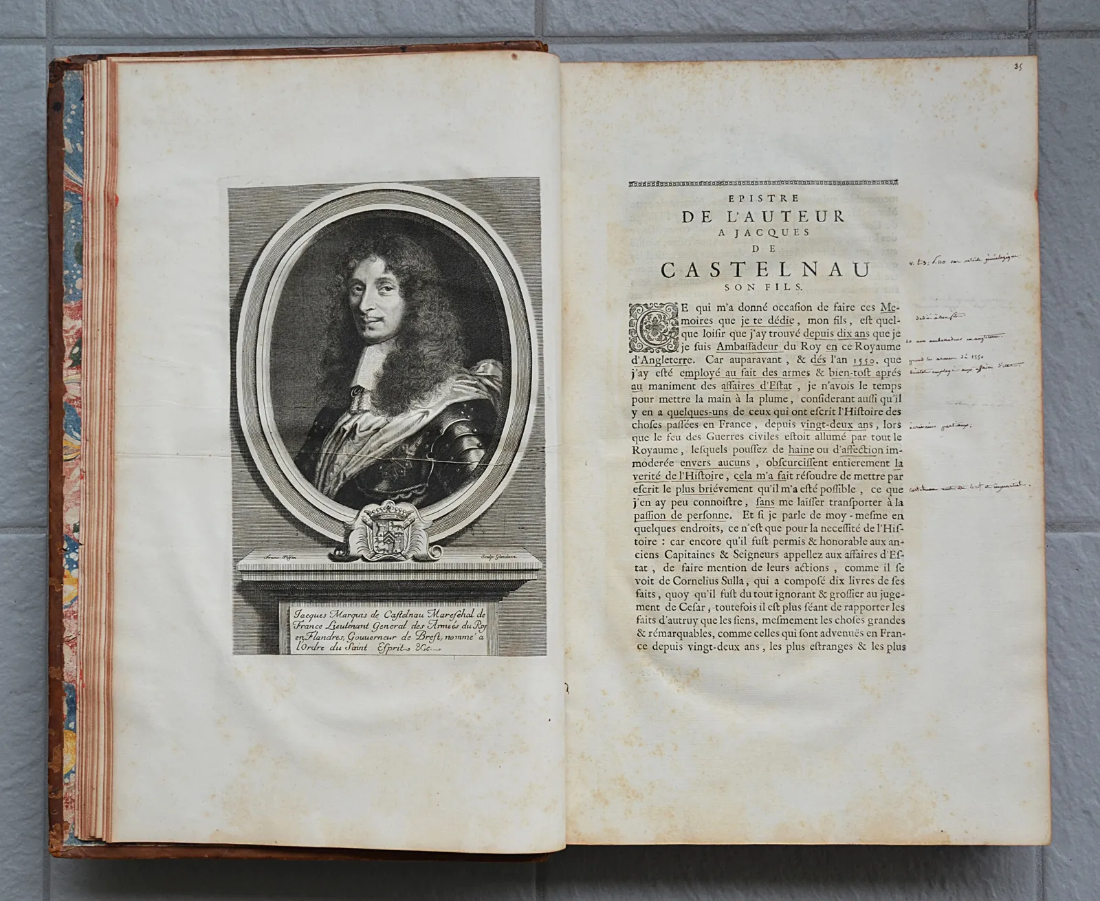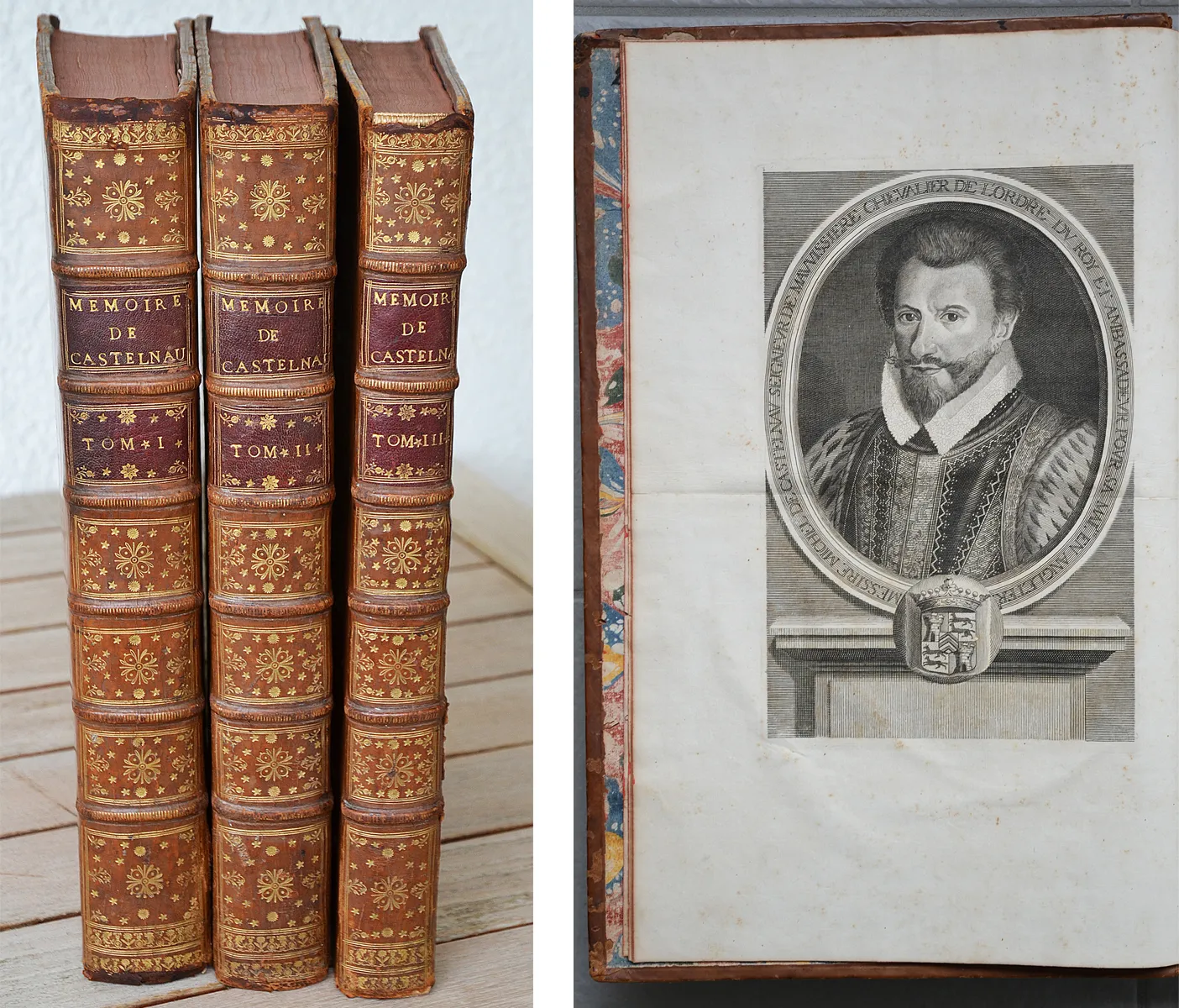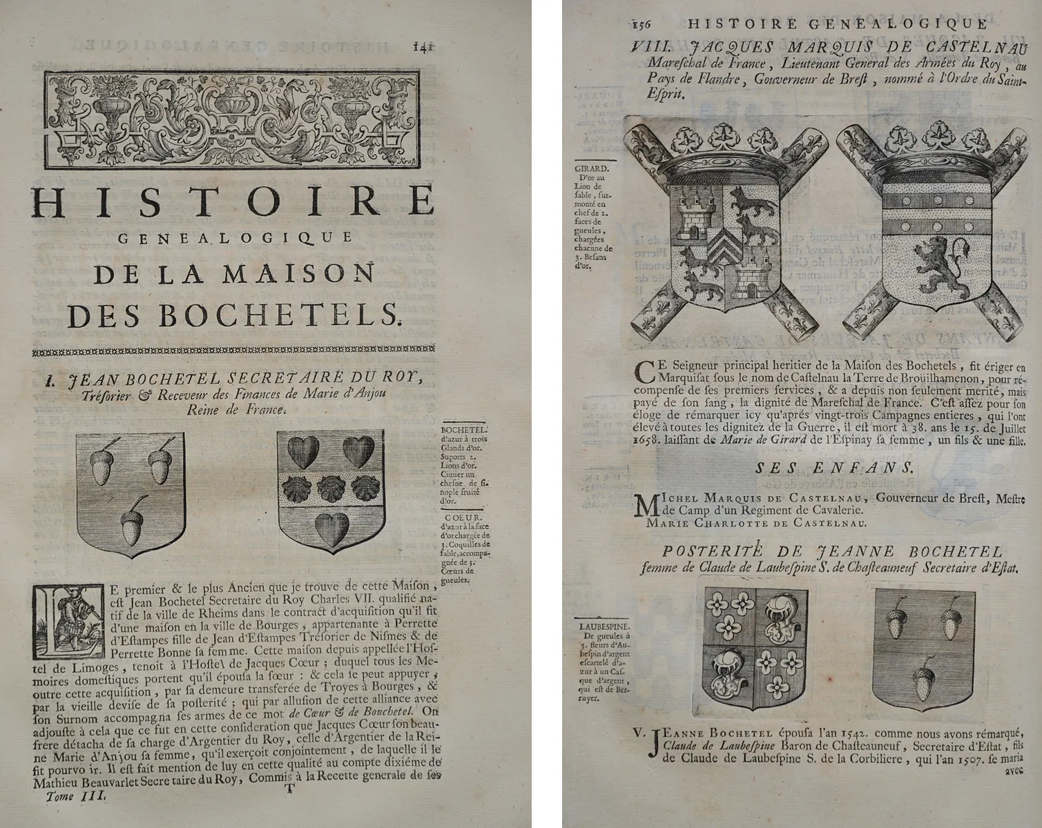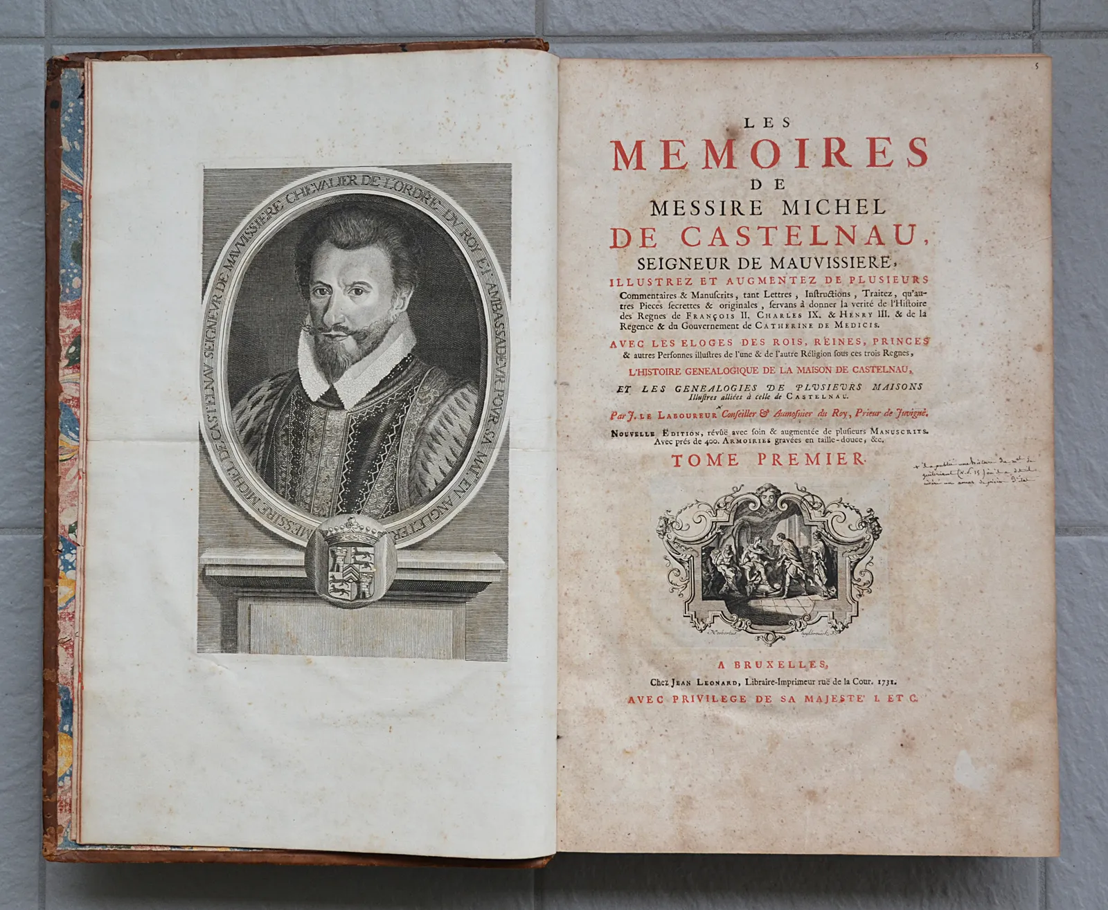 Les mémoires de messire Michel de Castelnau, seigneur de Mauvissière, illustrez et augmentez de plusieurs commentaires & manuscrits, tant lettres, instructions, traitez, qu’autres pièces secrètes & originales, servans à donner la vérité de l’histoire des règnes de François II, Charles IX, & Henry III, & de la régence & du gouvernement de Catherine de Médicis. Avec des éloges des rois, reines, princes & autres personnes illustres de l’une & de l’autre religion sous ces trois règnes, l’histoire généalogique de la maison de Castelnau, et les généalogies de plusieurs maisons illustres alliées à celle de Castelnau. Par J. Le Laboureur, conseiller & aumônier du Roy, prieur de Juvigné. Nouvelle édition, revue avec soin & augmentée de plusieurs manuscrits [par Jean Godefroy]. Avec près de 400 armoiries gravées en taille-douce, etc.
