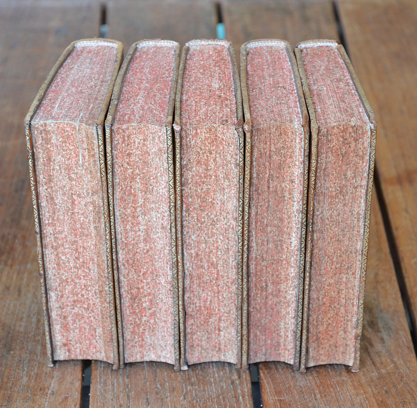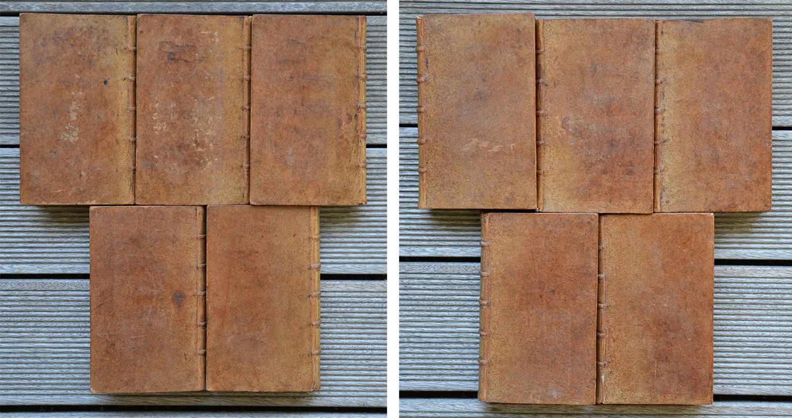 Cinq volumes in-12 (10,5 x 16,8 cm.) de (7ff) – pp. 7-94 – 520 pp. + 520 pp. + 549 pp. + 549 pp. + 339 pp. – 54 pp. – (42ff.) ; veau fauve moucheté glacé, dos à nerfs richement ornés, roulette dorée sur les coupes, tranches mouchetées (reliure de l’époque).