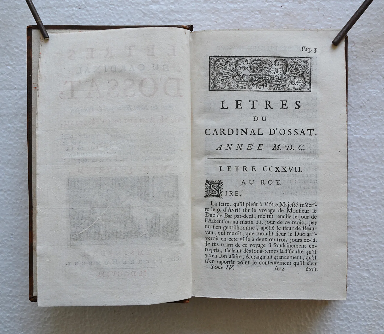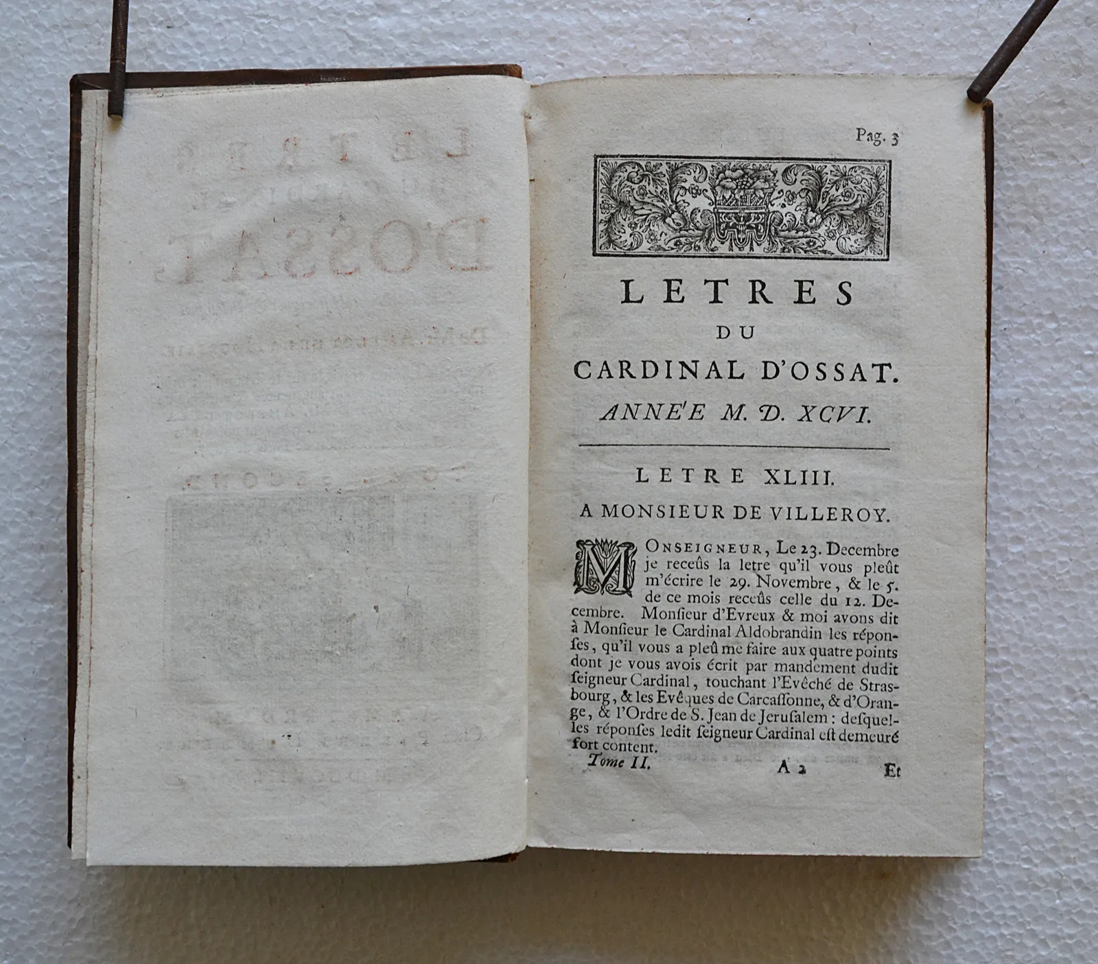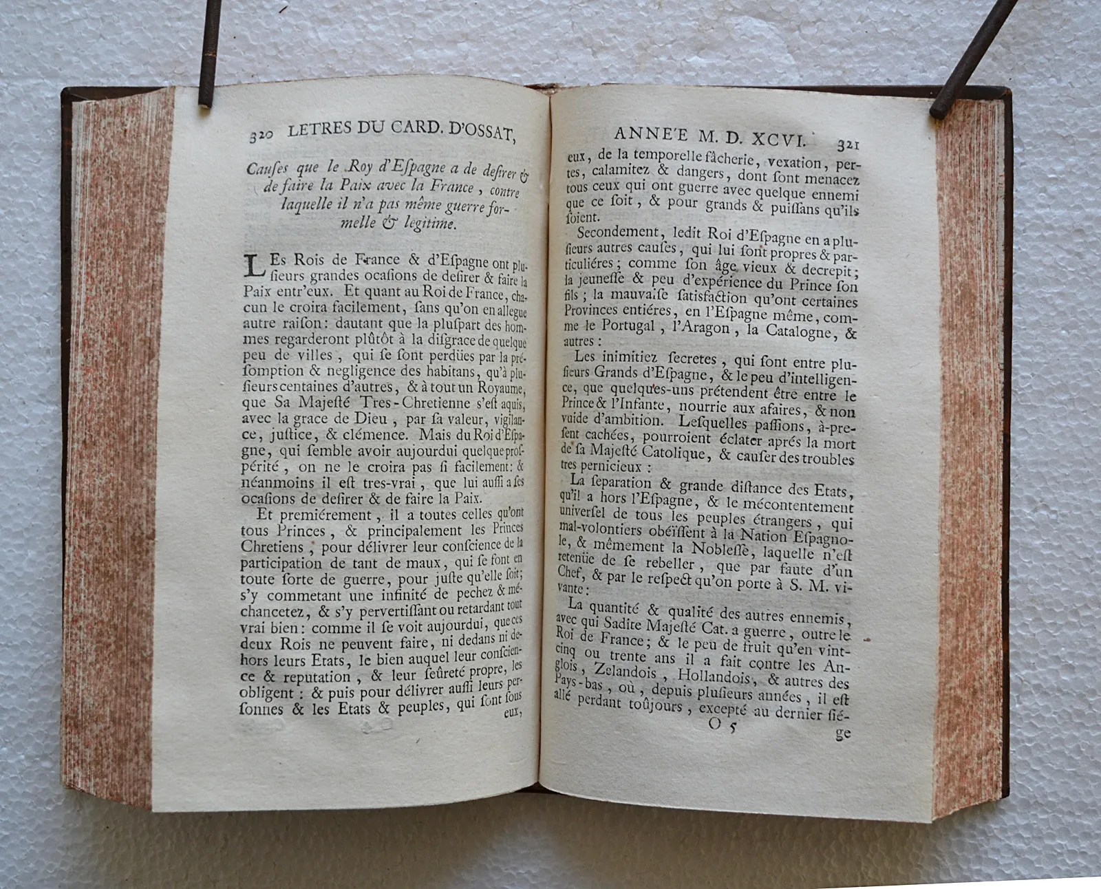 Rare édition de cet ouvrage rédigé sous forme épistolaire, et composé d’après le manuscrit original du cardinal et diplomate Arnaud d’Ossat (1537-1604). Il fut à partir de 1584 ambassadeur à Rome et obtint du Saint-Siège l’absolution d’Henri IV, puis l’approbation de l’édit de Nantes et l’annulation du mariage du roi avec Marguerite de France.